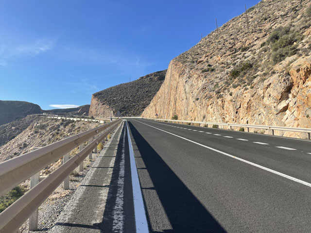 Kurz nach acht bin ich aufgebrochen und als ich die lange Kehre runter zum Wasser hinter mir hatte, war genau der Zeitpunkt des Sonnenaufgangs und ich konnte sehen, wie die Sonne aus dem Wasser aufstieg. Hell war es zu diesem Zeitpunkt eigentlich schon, aber nun sah alles ganz anders aus. Die Sonne hat hier ein schönes, warmes Licht, das selbst baufälligen Häusern einen mediterranen Charme verleiht. In Pozuelo, dem ersten Ort unten am Wasser, muss es ein paar strickwütige Frauen geben. Da waren alle Laternen in bunte Strickwaren eingepackt, einige Straßenbäume von aneinander gehefteten oder einfach an den Baum genagelten Topflappen eingehüllt und an manchen Bäumen hing noch gestrickte Weihnachtsdeko. Alles nicht übermäßig schön, aber originell. So wie der als Weihnachtsbaumersatz gedachte grüne Kegel auf dem Dorfplatz. Für Fußgänger führt ein schöner Weg aus dem Ort heraus. Neben einer Reihe Palmen hat man einen Fußweg aus aneinander geschraubten, etwa 1x1 Meter großen, hellen Platten gelegt, auf denen es sich wie auf einer Tartanbahn läuft. Und beidseits dieses Weges sah es einigermaßen aufgeräumt aus, obwohl auch hier Folienzelte stehen. Aber da heute, am Sonntag, die Müllabfuhr unterwegs war, scheint man hier ein Auge darauf zu werfen, dass sich gar nicht erst viel Müll ansammelt. Der Weg endete an einer etwa 20 Meter breiten, beidseits mir hohen Mauern eingefassten Rinne, in der ggf. das Wasser aus den Bergen ins Meer schießen kann. Bei der jetzigen Witterung ist es unvorstellbar, dass solche Flutrinnen notwendig sind. Jetzt kann man an einer bestimmten Stelle zu Fuß oder mit dem Auto die Rinne passieren. Wenn da Wasser drin ist, muss man einen Umweg bis zur nächsten Brücke machen. Auf der anderen Seite der Rinne ist man schon in La Rábita, einem sehr netten Küstenort mit den Resten einer alten Burg. Hinter dem Ort, der wie alle Küstenorte hier eine schöne Uferpromenade hat, führt die Straße ziemlich steil bergauf, bis sie auf die N-340 trifft, die ich, abgesehen von ein paar Ortsbesichtigungen, bis zum Ende des Tages nicht mehr verlassen habe. Das klingt schlimm, ist es aber nicht. Am Sonntag ist da nicht viel los, da sind mehr Radfahrer und Biker (vorzugsweise im 12er-Pack) als Autos unterwegs. LKWs sieht man auf der Straße fast gar nicht, die fahren alle auf der nahen Autobahn. Die Straße hat einen breiten Randstreifen und manchmal sogar einen Fußweg hinter der Leitplanke. Da kann man überall gut und sicher laufen und darüber staunen, wie man den Felsen Platz für die Straße abgerungen hat und wie man durch Brücken und Dämme in den sich zum Meer öffnenden Schluchten versucht hat, enge Kurven zu minimieren. Das ist eine bautechnische Meisterleistung, die noch dazu schön anzusehen ist. So ging es heute den ganzen Tag an der Steilküste entlang und hinter jeder Kurve bot sich ein neuer, oft atemberaubender Blick. Ab der ersten, weit ins Wasser reichenden Klippe hinter La Rábita, konnte ich gut die gesamte Küste bis zu meinem Tagesziel Calahonda einsehen. Das waren ab dieser Stelle noch knapp 25 km Wegstrecke. Es war ein großartiger Anblick. Da lagen im Sonnenlicht aufgereiht die Orte Melicena, Los Yesos, La Mamola, Castillo de Baños de Abajo, Los Cambriles, Castell de Ferro und an der letzten sichtbaren Klippe halt Calahonda, wo mein „Hostal Miguel“ direkt an dem steil aufragenden Felsen liegt, der den Ortseingang dominiert. Leider war es auf der ganzen Strecke nicht so sonderlich gut mit Kneipen und Geschäften bestellt. Erst in La Mamola fanden sich offene Gaststätten und ein kleiner Supermarkt, dann erst wieder in Castell de Ferro. Dazwischen gab es zwar in La Lance ein Restaurant direkt an der Straße, aber da war es ziemlich voll, unter anderem durch eine größere Gruppe Biker. Ich hatte zwar keine Eile, aber mich da nur für ein Getränk der Gunst oder Missgunst eines gestressten Kellners auszusetzen, hatte ich keine Lust. Da musste ich gezwungenermaßen zwischendurch auf den mitgeschleppten Wasservorrat zurückgreifen. In der Kneipe in La Mamola, wo ich um zwölf endlich zu einem Frühschoppen gekommen bin, hätte ich fast eine Keilerei zwischen dem Wirt und seinen beiden Kellnerinnen, offenbar alles Familienmitglieder aus Osteuropa, miterlebt. Die haben sich angeschrien und gerempelt, da habe ich lieber schnell bezahlt und mich aus dem Staub gemacht, zumal mir die Biersorte „Amber“ nicht so zugesagt hat. Kurz darauf kam ein kleiner Supermarkt, der in einem ganz normalen Haushaltskühlschrank schwarz/rote Büchsen mit meinem Lieblingsgetränk hatte. Mit einer solchen habe ich mich auf einer Bank an der Uferpromenade niedergelassen, meine Essensreste ausgebreitet und Picknick gemacht. Das war herrlich. Hinter mir übten am Strand zwei Kinder mit ihrem Vater Drohnenflug, vor mir spazierten ein paar überwiegend alte Paare vorbei und an der Straße war ein fast geschäftiges Treiben. In Castell de Ferro, einem eingangs recht schön anzusehenden Ort, der seinen Namen vermutlich von der Burgruine auf einer Bergkuppe hat, waren am Ortsausgang einige Investruinen zu sehen. Darunter war ein recht großer Rohbau, für den man extra einen Teil des Burgberges abgetragen hat. Welch Frevel! Und so schade für den Ort. Auf den verbleibenden 8 km bis Calahonda ist die Straße vermutlich in letzter Zeit nochmal ausgebaut worden. Da hat man mit endlos langen Bohrern, deren Spuren noch deutlich sichtbar sind, den Felsen so abgetragen, dass senkrechte Wände zurückblieben. Mit dem angefallenen Material hat man schließlich die nächste Schlucht teilweise verfüllt, so dass sich hinreichend Platz für eine Straße mit zwei Bergauf- und einer Bergabspur nebst breiten Rändern ergab. Die ist immer noch sehr kurvenreich und mit Anstiegen bis auf hundert Metern versehen, was das Laufen zwar anstrengend, aber interessant macht. Zwischendurch gibt es einige Aussichtspunkte, die sogar mit Sitzgelegenheiten versehen sind. Von da konnte man gut d