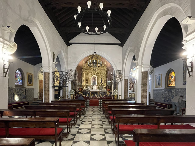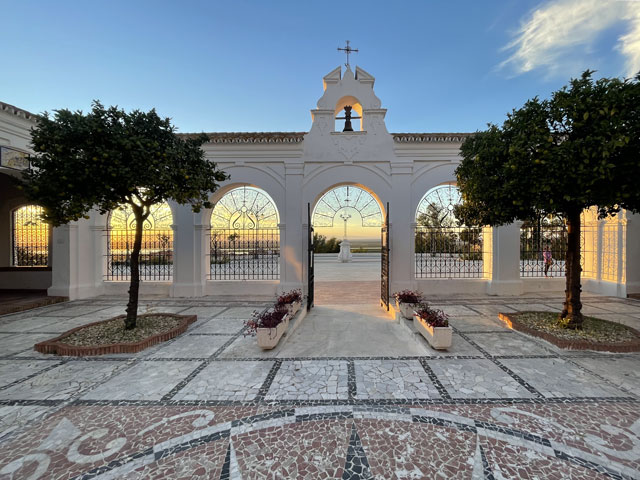 Der Karte und damit auch der verbalen Wegbeschreibung Fernandos folgend, habe ich mich auf das Plateau begeben, das parallel zum Flussdelta nach Norden führt. Von dort oben hat man einen hervorragenden Blick auf den hier etwa drei Kilometer breiten Streifen von Salzwiesen, durch die sich der Río Odiel und diverse Zuflüsse schlängeln und nun in der Abendsonne glänzen. Am Ende des Plateaus steht eine schöne, kleine Wallfahrtskirche, die innen und außen sehr interessant aussieht und durch leise Musik alle Leute herein zieht, die eigentlich nur mal den Kopf durch die Tür stecken wollten. Im daneben liegenden Souvenirladen habe ich einen Stempel bekommen und Instruktionen, wie ich auf das angrenzende Klostergelände komme.