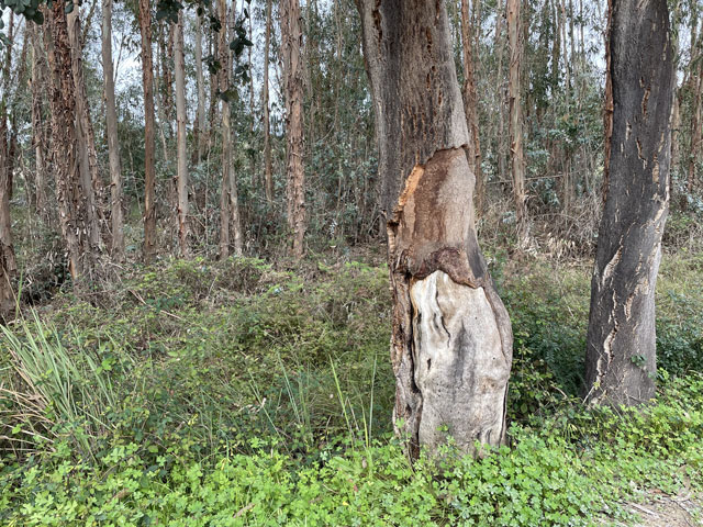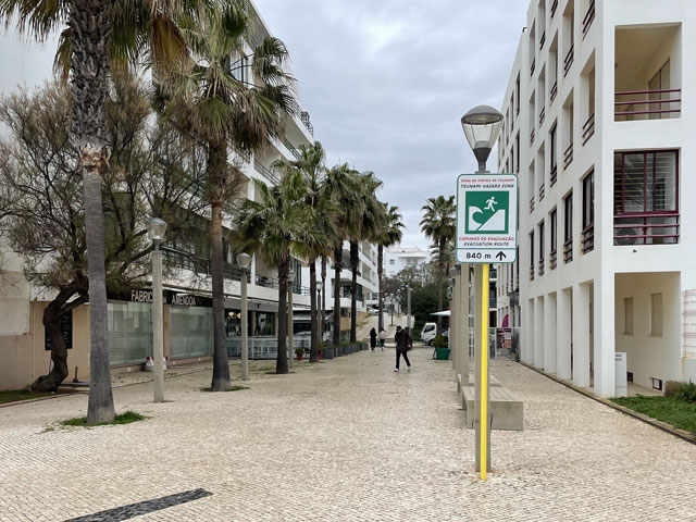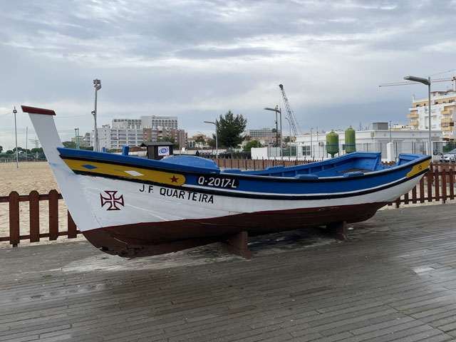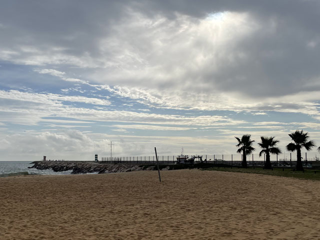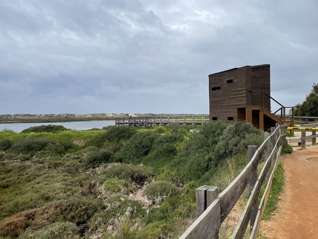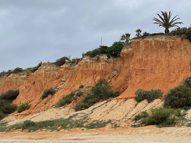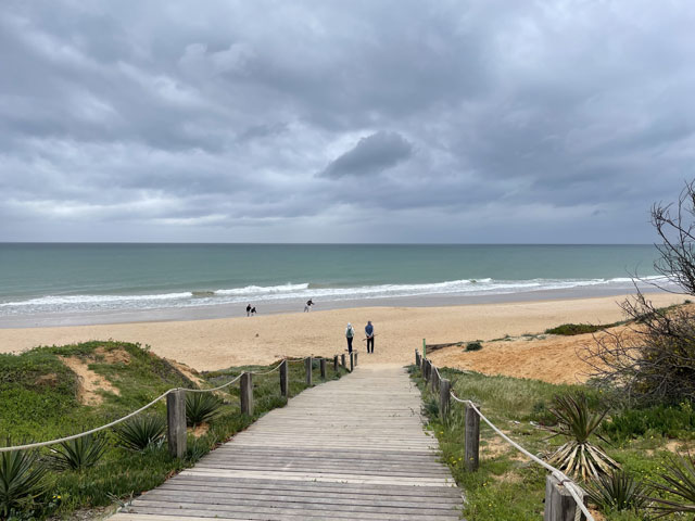 Ich bin auf kürzestem Wege, vorbei an einem großen Einkaufscenter wieder auf die Straße, die ich gestern gekommen bin. Aber nach Überquerung der beiden Flüsse bin ich nicht nach links zum Flughafen abgebogen, sondern geradeaus in die Urbanisation gelaufen, die zur Gemeinde Montenegro gehört. Zu meiner Überraschung bin ich da in unscheinbaren Straßen auf verschiedene Geschäfte und Gaststätten gestoßen. Die hatte ich an der Hauptstraße erwartet, die sich durch den Ort zieht. Aber das war eine richtige Schnellstraße ohne Fußweg, die man auch nicht so einfach überqueren konnte. Ich bin also wieder zurück in die Siedlung und habe eine Straße genommen, die auf eine Fußgängerbrücke über die Schnellstraße stößt, hinter der es in der beabsichtigten Richtung weitergeht. Etwa 500 Meter hinter der Brücke mündet die Straße in einem Kreisverkehr und taucht dahinter in einen lichten Pinienwald ein. Nach einer langen Doppelkurve führt die Straße, die inzwischen zu einem je nach Wetter staubigen oder schlammigen Fahrweg mutiert ist, aus dem Wald heraus und in ein nur spärlich bewachsenes Flussdelta hinein. Das ist der Naturpark „Ria Formosa“. Links breiten sich die Salinen aus, die ich gestern vom Flugzeug aus fotografiert habe, und rechts ziehen sich kleine Wasserläufe zwischen den meist nur knie- oder hüfthohen Sträuchern hin. Unmengen an Störchen, die ihre Nester in eine Gruppe Eukalyptusbäume gebaut haben, stelzen da durchs Wasser und sorgen für ordentlichen Bio-Lärm. Die größtenteils ausgetrockneten Salinenbecken sahen eigentlich nicht so aus, als ob man da Salz zusammenkratzen könnte, aber zwei große Salzhaufen mittendrin bewiesen das Gegenteil. Der Weg, der eigentlich weiter geradeaus führen sollte, war leider auf der Höhe der Salzhaufen gesperrt und mit „Betreten verboten“-Schildern versehen. Da Hundegebell zu hören war, habe ich die Schilder ausnahmsweise mal ernst genommen und den links abbiegenden, direkt zum Meer führenden Weg zwischen den Becken der Saline genommen. In ziemlich dichtem Abstand sind da Flugzeuge von rechts kommend über meinen Kopf hinweg auf die bis an die Salzbecken heranreichende Landebahn zu geflogen. Ich habe gestaunt, was der kleine Flughafen so verkraftet. Gegen 9 Uhr sind mehrere Flugzeuge im 5-Minuten-Abstand gelandet und in den Lücken dazwischen sind immer welche gestartet. Der von mir eingeschlagene Weg führte auf eine Gruppe Hotelbauten zu, aber ohne diese zu erreichen. Die stehen nämlich auf der langen Sandbank, welche die Lagune vor der Stadt und dem Flughafen vom Meer trennt. Am westlichen Ende des Flughafens führt eine Brücke rüber zur Sandbank. Mein Weg endet an der Lagune und stößt dort auf einen parallel zum Wasser verlaufenden Fußweg, der mit Geländer und vereinzelten Bänken versehen, aber leider an manchen Stellen etwas schlammig ist. Ansonsten läuft es sich da aber schön. Linker Hand ist die Lagune und dahinter verläuft die nunmehr unbebaute „Sandbank“ mit einer etwa fünf Meter hohen Düne. Rechts ziehen sich wieder unzählige Wasserläufe durch spärlich bewachsenes Gelände und dahinter sind, etwas höher gelegen, schicke Villen und Hotels sowie diverse, von Pinien eingerahmte Golfplätze zu sehen. Etwa da, wo der über den sumpfigen Grund führende Weg aufs „Festland“ stößt, geht es auf einem Holzweg auf Stelzen weiter. Der ist etwa drei Meter breit, beidseits mit Geländer und in Golfplatznähe mit einem mannshohen Netz versehen. Auf diesem Holzweg geht es um kleine Lagunen herum, manchmal auch mittendurch. Da macht es Spaß zu laufen und trotz des trüben Wetters haben das viele genutzt. Bei den Leuten, die einem da begegnen, handelt es sich überwiegend um Engländer, aber hin und wieder waren auch mal deutsche Stimmen zu hören. Ab da, wo die Lagune endet, also „Sandbank“ und Festland aufeinander treffen, führt der Holzweg durch die Dünen. Oben auf den Dünen stehen einige Gaststätten, natürlich auch auf Stelzen wie die dort hin führenden Wege. Irgendwann ist aber Schluss mit dieser luxuriösen Wegeführung. An einem großen Parkplatz muss man sich entscheiden, ob man sich einen Weg durchs Hinterland sucht, oder runter an den Strand wechselt. Ich habe Letzteres gemacht und es nicht bereut. Der Strand ist hier durchgängig mindestens fünfzig, an flachen Stellen auch über hundert Meter breit. Es ist schöner, feiner, heller Strand, auf dem man dicht am Wasser auch prima laufen kann. An manchen Stellen gibt es etwas Steilküste. Nicht sehr hoch, vielleicht 10 Meter, aber mit tollen Farben von Gelb über Ocker bis Tiefrot. Den ganzen Vormittag war es schon bewölkt, aber mittags zogen sich die Wolken richtig dicht und dunkel zusammen. Für 13 Uhr war Regen angesagt und etwa zu dieser Zeit fing es auch wirklich an zu nieseln. Aber es war nur so viel, dass ich es bis zu meinem Tagesziel Quarteira geschafft habe, ohne mein Regencape rausholen zu müssen. In der Stadt angekommen, wurde der Regen zwar etwas stärker, aber hier konnte man sich ja unterstellen oder mal in ein Geschäft flüchten. Meine Herberge machte erst um drei auf, aber ein paar Minuten eher bin ich doch schon reingekommen. Ich bin hier angenehm überrascht worden, da alles sehr ordentlich und geschmackvoll eingerichtet ist. Ich bin mit einem anderen Herrn in einem 6-Mann-Zimmer, Bad und WC gleich gegenüber. Erstmals habe ich hier ein Gepäckfach unterm Bett, das mit einem elektronischen Schloss versehen ist, welches die Key-Card akzeptiert, mit der man ins Haus und ins Zimmer kommt. Toll, sonst muss man sich immer einen Schlüssel besorgen oder ein Vorhängeschloss ausleihen, wenn überhaupt eine Möglichkeit zum Abschließen besteht. Die Küche ist sehr gut ausgestattet und hat mich schon zu einem selbst gefertigten Omelett verleitet. Ein zweites wird es als Frühstück geben, ich kann ja keine Reste durch die Gegend schleppen. In einer Regenpause habe ich mal eine Runde durch den Ort gedreht, die