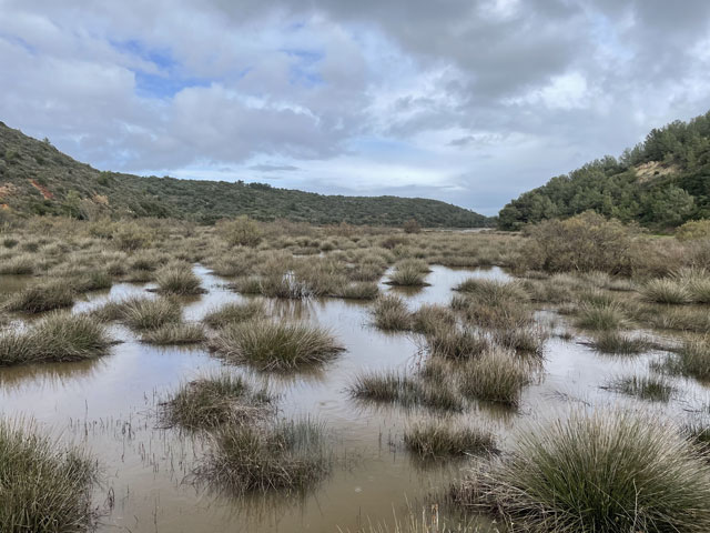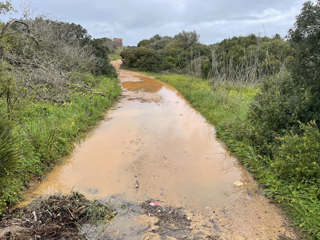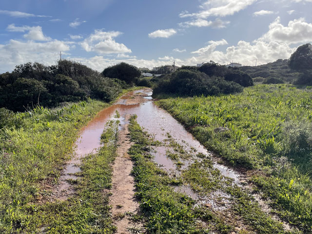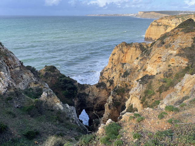 In Lagos beginnt er an der kleinen Festung am Fluss, gar nicht weit weg von meiner Unterkunft. Dort, am Stadtstrand geht es auch schon mit der Steilküste und einzelnen Felsen am Wasser los. Ein Holzweg auf Stelzen mit Geländer führt oben auf den Klippen entlang. Solche Wege führen auch zu einzelnen Aussichtspunkten, die so platziert sind, dass man gut in die Schluchten schauen kann, die das Wasser im Laufe der Zeit in die Küste gefressen hat. Auf einem solchen Weg geht es dann um einen Leuchtturm herum und noch ein ganzes Stück auf den Klippen entlang. Das muss alles ziemlich neu sein, denn der Fischerweg verläuft lt. Karte ein Stück landeinwärts entlang einer Straße. In einem Vorort von Lagos führt der Weg mal kurz von der Küstenlinie weg. Dann geht es so weiter, wie ich es vor zwei Tagen schon mal hatte. Man sucht sich oben auf den Klippen einen der vielen Wege - je nach Geschmack ganz vorn an der Kante (was in der Regel der Fischerweg ist) oder in sicherer Entfernung, ein paar Meter weiter landeinwärts. Da entgeht einem aber der Blick auf die tollen, von Wellen umspülten Felsen im Wasser. Die Felsformationen waren zwar bei weitem nicht so spektakulär wie auf dem „Weg der sieben hängenden Täler“, aber auch sehr eindrucksvoll. Und da heute wieder ordentlich Wellengang war, konnte man sich erneut daran erfreuen, dass die Wellen beim Auftreffen auf den Felsen weit nach oben schlagen und geräuschvoll zerstieben. Die Steilküste hat hier keine konstante Höhe. Auf dem Stück nach Luz werden die Felsen immer höher und stets geht der Weg vorn an der Kante entlang, etwa auf den höchst möglichen Punkten. Das ist aus der Ferne und natürlich vor Ort sehr eindrucksvoll, aber auch recht anstrengend, da der „Weg“ immer nur eine Schneise im Gestrüpp mit felsigem Boden ist. Der Unterschied zu dem Gehabten ist der blau/grüne Doppelstrich, der sich auf Felsbrocken am und im Weg findet. Wenn man die vermutlich höchste Stelle des ganzen Weges erreicht hat, bietet sich ein grandioser Blick auf Luz, eine nette kleine Stadt mit 3500 Einwohnern. Nachdem es gerade geschüttet hatte, lag die Stadt jetzt im Sonnenschein. Ein wundervoller Anblick. Um dort hin zu kommen, musste man aber am Ende der Steilküste einen ziemlich steilen, inzwischen matschigen Weg runtersteigen. Das war nicht wirklich erfreulich und erklärte die verbissenen Gesichter der Wandergruppe, die sich oben auf dem Felsen versammelt hatte. Die Leute waren alle ziemlich alt und hatten sich vermutlich für einen geruhsamen Sonntagsausflug und nicht für eine Abenteuertour angemeldet. Die waren teilweise mit dem Regenschirm im Hagelschauer da hoch gekrochen, wo man sich besser mit beiden Händen im Gestrüpp festhält. Ich habe einige deutsche Stimmen gehört, vielleicht war das auch eine deutsche Reisegruppe. Die haben für ihr Geld wirklich was geboten bekommen. In Luz angekommen, war es kurz nach elf. In der dortigen kleinen Kirche begann um halb zwölf ein englischer Gottesdienst und die Bankreihen waren schon ganz gut gefüllt. Ich habe es aber bei einem Blick in die Kirche bewenden lassen, weil ich doch schon gestern Abend in Lagos einen halben Gottesdienst mitgemacht habe - bis zur Predigt. Dann bin ich gegangen, um die anderen Besucher nicht mit meinem Schnarchen zu belästigen. Der Gottesdienst war im Übrigen sehr schön, weil da ein Chor zum Einsatz kam und es sich um sowas wie eine Firmung handelte, denn eine Gruppe von Kindern wurde vom Pfarrer an der Tür abgeholt, gesegnet und zu den vordersten Bankreihen geführt. In Luz zeigte sich der Himmel von seiner schönsten Seite und ich Trottel habe meinem Fresstrieb nachgegeben und mich für eine Kleinigkeit in ein ganz originelles Restaurant gesetzt. Dort saß bereits eine Familie, die ich schon unterwegs bewundert habe, denn die war mit vier Kindern und Rucksäcken unterwegs. Die Mutter mit zwei Kindern, etwa 10 und 14, lief schon in Lagos vor mir, später stieß der Mann mit etwa 6jährigen Zwillingen dazu. Die waren in Luz sicher noch nicht am Ziel. So löblich ich das Familien-Wandern finde, im Restaurant musste ich auf meine „Loaded Chips“ (Fritten mit Speck und Käse überbacken) lange warten, weil deren Gerichte den Koch voll ausgelastet haben. Als ich nach einer halben Stunde endlich rauskam, war der Himmel schon wieder finster. und es dauerte gar nicht lange, bis erneut ein Hagelschauer herunterkam - mit Körnern, die gar nicht groß waren, aber auf dem Körper ordentlich wehtaten. Ich musste mich letztlich hinter einem großen Strauch verstecken, um Wind und Hagel etwas zu mildern. Da hatte sich auch schon eine Deutsche mit ihrem etwa 8jährigen Sohn versteckt. Dem war bestimmt eine Abenteuertour versprochen worden - die hat er bekommen. Nach diesem zweiten Hagelschauer standen alle Wege unter Wasser und der Boden zwischen den Pfützen war so aufgeweicht und glitschig, dass da kaum ein Vorwärtskommen möglich war. Nachdem ich hinter Burgau wiederholt im Schlamm weggerutscht bin, habe ich kehrtgemacht und bin zurück bis zu einem Weg, der in eine Siedlung und dort auf eine richtige Straße führt. Diese führte in großen Bögen um einen Berg und dann um eine große sumpfige Wiese an der Mündung der Ribeira de Vale Barão herum. Da hat man mit großem Aufwand den Berghang auf mehreren hundert Metern mit Metallkäfigen voll Steinen abgestützt. Darauf hat jemand „Free the Stones“, also so viel wie „Befreit die Steine“ gesprüht. Das ist zwar unschön wie jede Schmiererei an Wänden, aber wenigstens witzig. Hinter der sumpfigen Wiese bin ich nicht wieder auf die Steilküste, sondern auf einer abzweigenden Straße in Richtung Budens gelaufen und kurz vor diesem Ort nach links auf die Fernstraße N 125 gewechselt. Auf beiden Straßen lief es sich ganz gut. Kurz vor Figueira, das es hier mehrfach gibt, ging es wieder runter von der Fernstraße und lange Zeit auf einer schmalen Straße bergauf und bergab, was ich so nicht erwartet hatte 