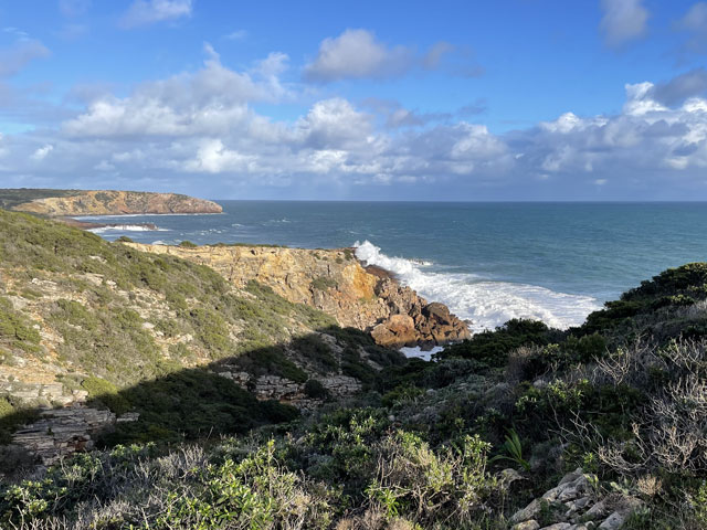 Heute bin ich gleich morgens auf dem offiziellen Fischerweg gestartet, der in Lagos beginnt und nach Sines führt. Oder umgekehrt, wie man mir gesagt hat und wie der Weg wohl in Reiseführern beschrieben ist. Aber da der in beiden Richtungen (mit blau/grünen Strichen) ausgeschildert ist, darf man den wohl auch in beiden Richtungen laufen.