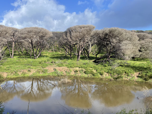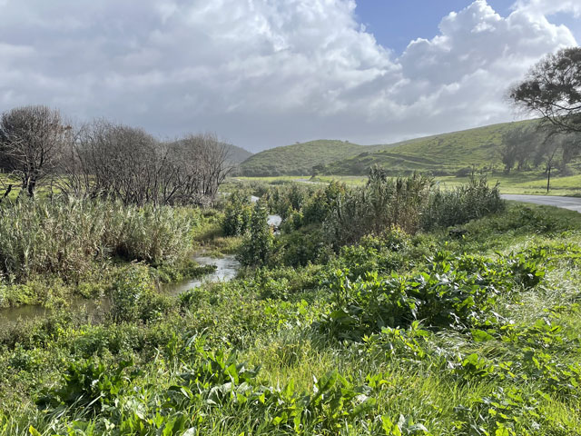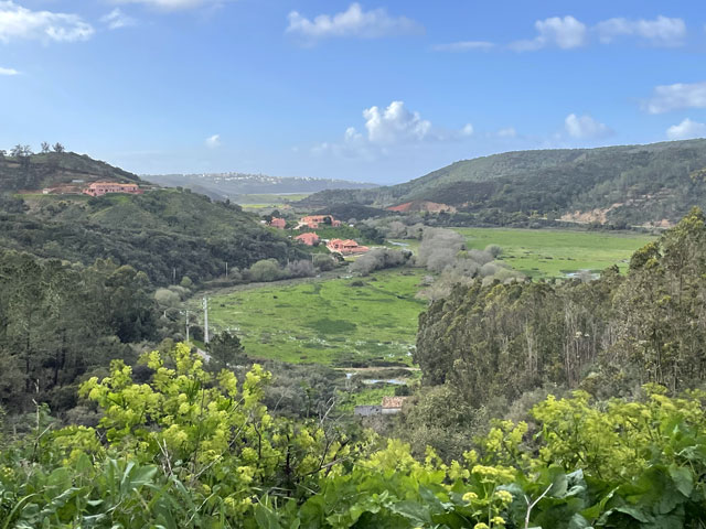 Im Hostel in Carrapateira waren unter den etwa zehn Gästen allein fünf Frauen, die den Fischerweg in der gleichen Richtung laufen wie ich, darunter vier deutsche. Da haben wir am Abend natürlich darüber geredet, was wir schon erlebt haben und was uns noch bevorsteht. Letzteres klang nicht so gut, denn die Frauen hatten von Entgegenkommenden erfahren, dass es auf der heutigen Etappe zwei kaum passierbare Stellen gibt - eine nahe Carrapateira und die andere kurz vor Arrifana. Da sind jeweils Bäche zu durchqueren, die angeblich hüfthoch Wasser führen. Zwei Damen aus Karlsruhe, die gestern schon des Wetters wegen mit dem Bus gefahren sind und heute der Problemstellen wegen mit dem Taxi nach Aljezur wollten, hatten sich gestern noch die Stelle bei Carrapateira angeschaut und Bilder gezeigt. Da hatte sich wirklich der Bach einen Weg über den Strand gebahnt und die Wellen haben versucht, durch dieses Bachbett weiter landeinwärts zu kommen. Die Damen konnten aber schwer schätzen, wie tief der Bachlauf ist. Hüfttief erschien er mir nicht, aber wenn sich die Stelle umgehen lässt, dann wollte ich das tun. Da auf der Karte in diesem Bereich noch eine Alternative des Fischerweges eingezeichnet ist, scheint es doch öfter mal vorzukommen, dass der „richtige“ Weg nicht oder nur schwer passierbar ist. Hier habe ich mich schnell für die Alternative entschieden, die erst ein Stück entlang der Straße führt, dann abbiegt, einen Bach überquert, in einem großen Bogen zurück führt und am Strand auf den „richtigen“ Weg stößt.