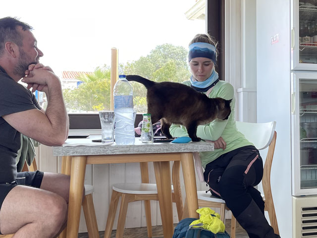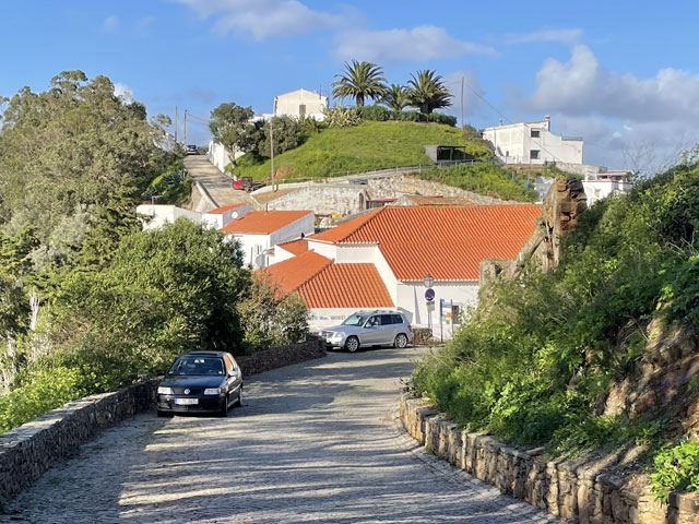 Die zweite Problemstelle war für mich nicht wirklich relevant, da ich nicht unbedingt nach Arrifana musste. Da hatte ich ursprünglich was gebucht, aber dann doch lieber ein Bett in Aljezur genommen, damit die folgende Etappe nicht übermäßig lang wird. Da meine Sachen, die ich gestern Abend gewaschen hatte, noch nicht trocken waren, habe ich diese sorgfältig um meinen Rucksack platziert - die Hose mit zwei kleinen Karabinerhaken an Ösen festgemacht und den Kleinkram (Socken, Schlüppis und ein T-Shirt) im Waschsack am Rucksack angehängt. Das sah aufregend aus, hat aber funktioniert. Zumindest die Hose war ziemlich schnell trocken. Zum Glück blieb es nach einem Regenguss am Morgen, den ich noch im Hostel abgewartet habe, den ganzen Tag weitestgehend trocken. Nur gelegentlich kam mal etwas runter, was ich normalerweise ignoriert hätte, aber der zu trocknenden Wäsche wegen habe ich bei jedem Tropfen der fiel, gleich den Regenponcho übergestülpt. Ich habe wie geplant am Anfang der Tour die alternative Variante gewählt und dabei gelernt, dass nicht alles, was auf der Karte wie eine Brücke aussieht, auch wirklich eine Brücke ist. Es kann auch eine Furt sein. Eine solche fand ich vor, als ich zu der Stelle kam, wo der alternative Weg über den Bach führt. Das Wasser stand da etwa 20 Zentimeter hoch und war so breit, dass da nichts mit Hüpfen war. Also habe ich mir Schuhe und Strümpfe ausgezogen und bin da durch. Als ich am Strand angekommen war, begegnete mir eine junge Frau, die den „richtigen“ Weg genommen hat. Die erzählte, dass der Bach am Strand keinesfalls hüfttief war, sondern auch nur bis zur Wade reichte. Den Umweg hätte ich mir also sparen können, aber verpasst habe ich auch nichts, denn den Strand habe ich auch noch zu sehen bekommen. Außerdem bin ich durch einen Pinienwald gekommen, in dem es in jüngster Zeit gebrannt haben muss. Das sah ziemlich gespenstig aus. Ab dem Zusammentreffen der Wege ging es stets bergauf, immer ziemlich dicht an der Kante der sich langsam aufbauenden Steilküste. Unten war ordentlicher Wellengang und es war toll anzusehen, wie 4…5 schäumende Wellenkronen hintereinander auf die Felsen zuliefen. Nach einer Weile führt der Weg aber weg von der Küste, hoch auf eine Anhöhe, von der man einen tollen Rundumblick hat. Ein Stück weiter stößt der Europa-Radweg EV1 (hier „Atlantic Coast Route“ genannt) dazu und ab dieser Stelle geht es auf halbwegs glattem Weg mit nur moderaten Höhenunterschieden weiter. Bei Monte Novo, dem einzigen kleinen Dörfchen an der Strecke, macht die Straße mit dem Radweg zwei Bögen, während der Fischerweg eine Abkürzung nimmt. Dieser bin ich dummerweise gefolgt und an eine den ganzen Weg einnehmende Pfütze gelangt. Das Blödeste, was man in einem solchen Fall machen kann, ist der Versuch, die Pfütze auf dem angrenzenden Acker zu umgehen. Schon beim ersten Schritt war ich bis über den Knöchel im aufgeweichten Boden versunken. Anschließend bin ich freiwillig in die Pfütze, um den Schlamm am Schuh wieder loszuwerden. Etwa zwei Kilometer weiter trennen sich Rad- und Fischerweg wieder. Letzterer biegt nach links ab und führt wieder zum Meer, auf die zweite schwer passierende Stelle zu, um dahinter wieder vom Meer wegzuführen. Viel bekommt man da vermutlich nicht vom Meer und von der Steilküste zu sehen. Ich hätte unter normalen Umständen trotzdem diesen Weg genommen, um nach Aljezur zu kommen. Aber zwei mir entgegenkommende deutsche Frauen erzählten, dass das Wasser dort nicht nur hüfthoch steht, sondern dass es ihnen beim Überqueren bis zur Brust stand. Das fiel für mich schlichtweg aus. Also bin ich auf dem „Euro Velo“-Radweg geblieben und auf diesem ziemlich gerade nach Aljezur gelaufen. Recht unerwartet gab es da auf halber Strecke eine Ferienunterkunft mit einer Gaststätte. Der junge Wirt war zwar etwas mürrisch und auf dem Nachbartisch saß eine Katze, aber ich bin trotzdem geblieben und habe mir ein Toastbrot als Stärkung für die letzten Kilometer machen lassen. Kurz vor dem Ziel ging es nochmal ein Stück entlang der Straße, was etwas unangenehm war. Am Abzweig nach Aljezur konnte ich zwischen zwei Varianten wählen: entweder steil bergab direkt in die Stadt, oder auf gleicher Höhe bleibend zur Burg und hinter dieser bergab. Da ich sicher nach dem Einchecken keine Lust gehabt hätte, nochmal hoch zur Burg zu laufen, habe ich diese jetzt gleich „mitgenommen“. Allerdings war es ein Trugschluss zu glauben, dass man diese leicht erreicht, wenn sie auf Augenhöhe ist. So wie es sich für eine Burg gehört, steht sie nämlich auf einem Hügel und man muss erstmal ein ganzes Stück bergab und dann schweißtreibend wieder hoch. Viel ist allerdings von der Burg nicht übrig, die im 10. Jahrhundert von den Mauren gebaut wurde und als letzte Burg der Algarve im Jahr 1249 von den Christen erobert wurde. Unter anderem hat das Erdbeben von 1755 ordentlichen Schaden angerichtet. Von da oben hat man aber einen schönen Blick. Unterhalb der Burg stehen alte Häuser, ganz unten an der Brücke ist mein „Amazigh Hostel“ und auf der anderen Seite des Flusses breitet sich ein etwas neuerer Stadtteil aus. Mittendrin ein großer, optisch gar nicht in die weiße Bebauung passender Intermarché. Im Hostel waren wieder einige Wanderer, darunter drei etwa 50jährige deutsche Frauen mit ihren etwa 20jährigen Söhnen. Ob die sich erst hier kennengelernt, oder zum gemeinsamen Wandern verabredet hatten, weiß ich nicht. Im geräumigen Aufenthaltsraum saßen abends die Mütter schwatzend in einer Ecke und die Söhne in einer anderen. |