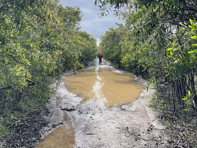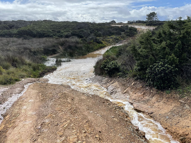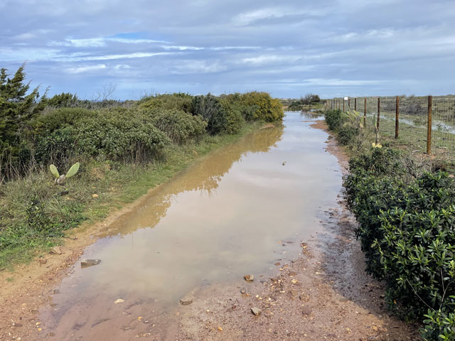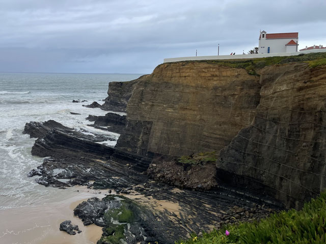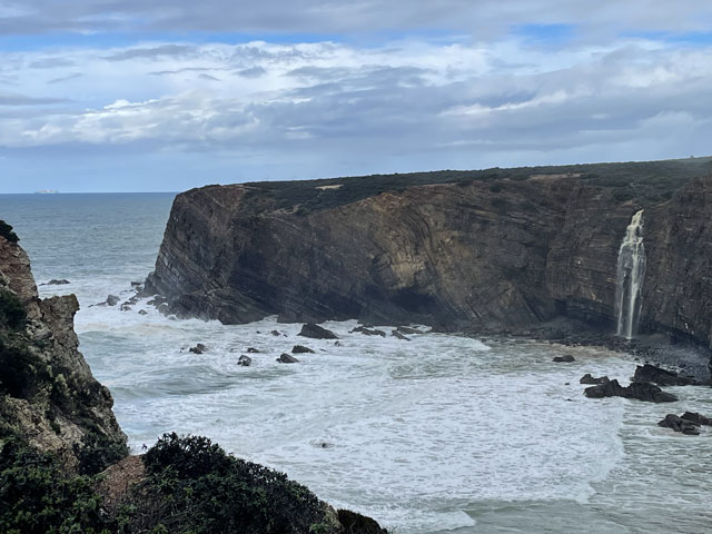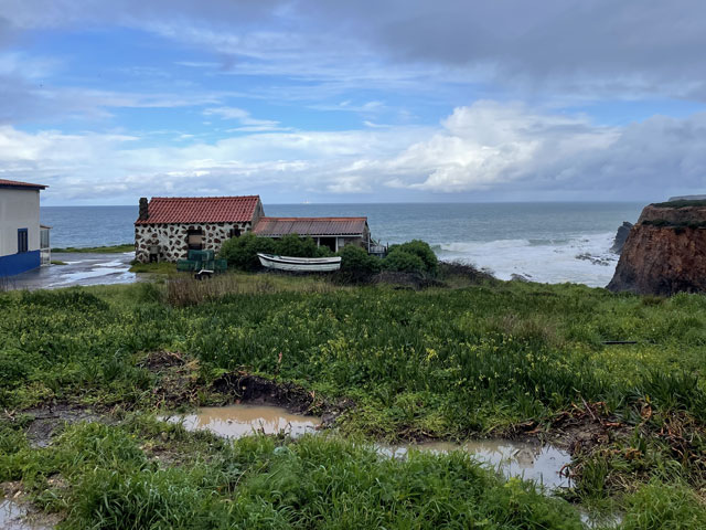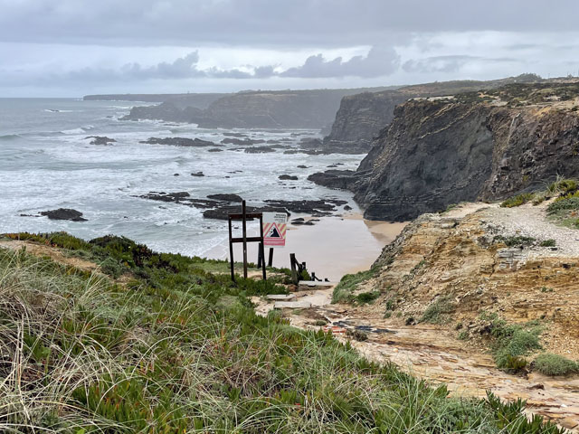 Heute bin ich wieder viel später aufgewacht, als gewollt. Ganz ohne Wecker geht es offenbar doch nicht. Als ich los wollte, regnete es. Da habe mir noch einen Kaffee gemacht. Kaum hatte der Regen aufgehört und ich war draußen auf der Straße, fing es schon wieder an. Und dieses Mal war es ein nicht übermäßig heftiger, aber ein lang anhaltender Landregen. Zum Glück führte der Fischerweg nach einer kurzen Runde auf einem Kap lange Zeit auf einem separaten Fußweg entlang einer Straße. Da kam ich trotz Regen gut voran. In den Taxis, die an mir vorbei fuhren, saßen bestimmt einige Wanderer, die in der gleichen Richtung unterwegs waren, denn gesehen habe ich von denen den ganzen Tag über niemand. Am besagten Fußweg waren alle paar hundert Meter Rastplätze auf Planken angelegt, alle mit Bänken und manche sogar mit etwas Überdachung und mit Sportgeräten. Das alles hat mir leider heute im Regen nichts genützt. Dann führte der Weg mal an die Klippen, wo sich schaurig-schöne Blicke in die Tiefe boten, dann ging es wieder ein Stück weg von der Kante, dafür auf einem Weg, auf dem die Pfützen in voller Breite standen. Von den angrenzenden Feldern floss zudem das Wasser über den Weg, um ein paar Meter weiter als kleiner Wasserfall in die Tiefe zu stürzen. Bei den breiten Pfützen macht es wenig Sinn, sich im dornigen Gestrüpp eine Umgehung zu suchen oder am glitschigen Rand der Pfütze zu balancieren und einen Sturz samt Smartphone in die Pfütze zu riskieren. Am besten ist es, einfach durchzulaufen. So habe ich auf dem relativ kurzen Wegstück bestimmt ein Dutzend Pfützen und Bäche durchquert. Irgendwann merkt man das gar nicht mehr und bei dem heftigen Wind trocknet zumindest die Hose ganz schnell. Es ist ja zum Glück Regen- und kein eisiges Schmelzwasser. So ging es etwa bis Cavaleiro - sehr feucht, aber ansonsten nicht übermäßig anspruchsvoll. Das änderte sich dahinter. Da ging es wieder ausschließlich auf Sand durch eine Dünenlandschaft, wo zwar nur wenige Pfützen standen, dafür aber eine spektakuläre Wegführung geboten wurde. An manchen Stellen führte der ausgeschilderte Weg auf weichem Sand wieder bis ganz dicht an die Kante heran. Das ist so schon gruselig, aber wenn man vorher gesehen hat, dass da oben die Felsen überstehen und man praktisch auf einem Balkon läuft, kann einem schon komisch werden. Und wenn man dann bei der Passage auch noch nach unten schaut, wo die schäumenden Wellen gegen den Felsen klatschen, dann kann man nur hoffen, dass der obere Magenverschluss richtig funktioniert. Ich muss gestehen, dass ich mir an einer Stelle, wo der etwa 50 cm breite und noch dazu abschüssige Sandweg genau an der Kante des etwa 30 Meter hohen Felsens verlief, einen alternativen Weg ein paar Meter weiter landeinwärts gesucht habe. Den Fußspuren zufolge haben das vor mir auch andere Weicheier gemacht. Da die entgegenkommenden Wanderer, von denen ich bis Almograve 66 gezählt habe, alle trockene Hosen und Schuhe hatten, war klar, dass ich bezüglich Wasser das Gröbste hinter mir hatte. Amüsiert habe ich mich über jene, die über den Schuhen Gamaschen trugen. Die sind bei Regen hilfreich, weil sie verhindern, dass das Wasser von oben in die Schuhe läuft. Aber ob die auch in einer 20 cm tiefen Pfütze Schutz bieten? In Almograve hatte ich gerade mal 19 km hinter mir - da war es nach 14 Uhr. Damit stand fest, dass ich den Rest des Weges bis Vila Nova de Milfontes, ca. 13 km, nicht auch noch auf dem Küstenweg zurücklegen kann. Der Routenplaner sagte mir, dass ich selbst auf der kürzesten Strecke noch über vier Stunden vor mir habe, also Ankunft kurz vor Sonnenuntergang. Ich bin folglich einer der vom Kartenprogramm vorgeschlagenen Routen gefolgt: zunächst auf Feldwegen, unter anderem entlang des Wanderweges „PR1ODM“, was wahrscheinlich „Portugiesischer Wanderweg 1 in Odemira“ heißt. Der führte halbwegs trocken durch landwirtschaftlich genutzte Flächen. Da es inzwischen aufgehört hatte zu regnen und der Wind im Hinterland nicht ganz so heftig blies, lief sich das ganz gut. Lediglich in den kleinen Wäldchen wurde man durch umgestürzte Bäume am schnellen Laufen gehindert. Auf der vom Routenplaner vorgeschlagenen Stelle bin ich dann vom Feldweg weg zur Fernstraße EN 393, die nach Vila Nova de Milfontes führt. Da lief es sich zwar bei dem regen Verkehr wegen fehlender Randstreifen nicht gut, aber ich kam voran. An einem Abzweig habe ich überlegt, ob ich nicht doch nach links in Richtung Meer abbiege und das letzte Stück auf dem Fischerweg laufe. Das hätte nicht viel länger gedauert, wäre aber mit einem Abstieg zum Strand und einem Aufstieg zurück aufs Straßenniveau verbunden gewesen. Ich war noch gar nicht fertig mit Überlegen, da habe ich gesehen, dass die Fernstraße ab besagtem Abzweig eine breite Standspur hat, auf der sich wunderbar laufen lässt. Da habe ich mir den Abstecher gespart, bin auf der Straße geblieben, habe auf einer hohen Brücke den Rio Mira überquert und war so noch vor dem Sonnenuntergang in meinem Zielort, Vila Nova de Milfontes. Das „Pirata Milfontes Guest House“ war Dank der zugesandten Instruktionen schnell gefunden und die Schlüsselbox hat nach Eingabe des mitgeteilten Codes den Schlüssel zum Haus und zum Zimmer rausgerückt. Der Name der Unterkunft hat übrigens nichts mit Seeräubern zu tun, sondern rührt daher, dass die Vermieterin Ina Pirata heißt. Ob deren Vorfahren vielleicht Seeräuber waren, weiß ich nicht. |
