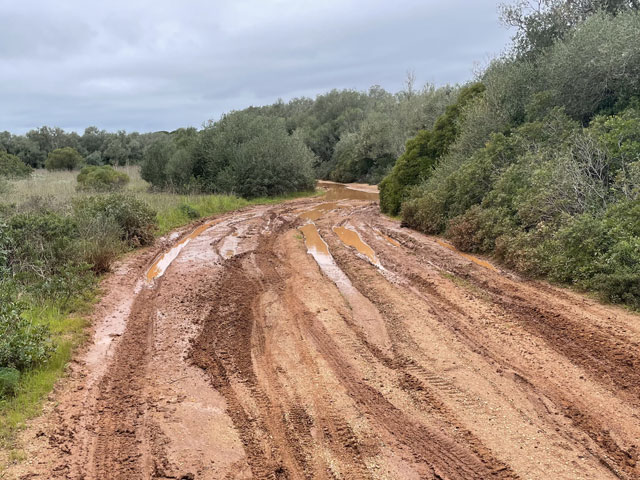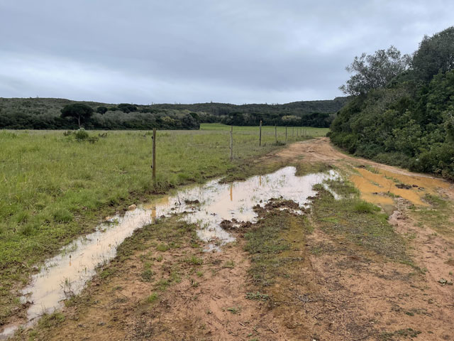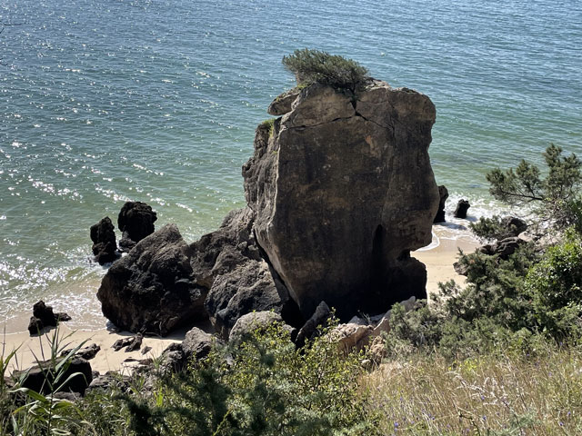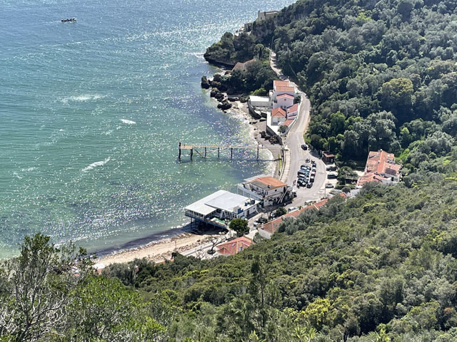 Da, wie schon gesagt, zwischen Sines und Setúbal zwei Übernachtungen weggefallen sind, hatte ich nun zwischen Setúbal und Almeda zwei Übernachtungen gut. Statt an einem Tag quer über die Halbinsel zwischen den Flüssen Sado und Tejo zu laufen, habe ich mich entschlossen, in drei Tagen soweit es geht an der Küste entlang zu wandern. Für heute hatte ich mir den Küstenabschnitt von Setúbal nach Sesimbra vorgenommen, morgen will ich zum Cabo Espichel und zum Übernachten nach Alfarim, was gar nicht weit von Sesimbra entfernt ist. Übermorgen geht es dann von dort nach Almeda (gegenüber von Lissabon, auf der anderen Seite des Tejo), wo ich mich in der Jugendherberge nahe der weithin sichtbaren Christus-Statue einquartiert habe. Um noch ein bisschen variabel zu sein, hatte ich für die zwei Stationen nichts gebucht. In Sesimbra waren schon seit Tagen in der Pension „Lá em Cima“ fünf Zimmer frei, auch gestern Abend noch. Als ich dort heute früh buchen wollte, waren die plötzlich alle weg, einen Tag später aber wieder verfügbar. Ich glaube nicht, dass sich da über Nacht fünf Leute angemeldet haben. Vermutlich wollten die Vermieter mal einen Tag „blau“ machen und haben die Zimmer aus dem Angebot genommen, damit kein Gast die Ausflugspläne durchkreuzt. Da habe ich vor Schreck gleich in einer anderen Unterkunft im Ort gebucht, die leider etwas auswärts liegt. Da werde ich abends bestimmt nicht nochmal nach Sesimbra reinlaufen, sondern mir die Stadt morgen auf dem Weg zum Kap anschauen, wenn das Wetter nicht allzu übel ist. Von Setúbal bin ich zunächst auf der Avenida Luísa Todi und dann dicht am Wasser in Richtung Westen gelaufen, bis ich in einer umzäunten Sackgasse gelandet bin und ein ganzes Stück zurück musste. Es ging hier also nur auf der Straße weiter. Die führt zunächst hoch auf etwa 50 Meter, dann zwecks Überquerung eines kleinen Flüsschens runter fast bis auf Null und schließlich auf dieser Höhe vorbei an einem Campingplatz, einer Zementfabrik und einem Hospital nebst Leuchtturm in alten Festungsmauern zu einem schönen Strand mit Gaststätte und großem Parkplatz. Der war bei dem schönen Wetter, das vormittags herrschte, vor allem von Motorradfahrern gut besucht. Hier war auch für mich der richtige Platz für eine Pause. Die Schiffe, die nach Setúbal wollen, fahren hier ganz dicht am Strand vorbei, weil die Fahrrinne des Rio Sado, der hier in den Atlantik mündet, nah am diesseitigen Ufer liegt. Ein paar Meter hinter dem Parkplatz ist, wie weiter vorn schon angekündigt, die Straße komplett gesperrt, weil da wohl was an zwei kleinen Tunneln gemacht werden muss. Vermutlich sollen derweil auch keine Fußgänger durch, denn man hat die erste Tunneleinfahrt mit Betonblöcken versperrt, über die man mühsam rüber klettern muss. Ein paar hundert Meter weiter, nach dem nächsten Tunnel, kommt nochmal eine solche Barriere. Dahinter dürfen dann auch wieder Autos fahren. Der Lohn für die zweimalige Kletterei war eine vom Durchgangsverkehr befreite Straße. Es waren aber bei dem schönen Wetter trotzdem recht viele Autos in den Sackgassen unterwegs. Die Straße führt nun stetig bergauf, auf der rechten Seite begleitet von steil aufragenden Felsen, die an vielen Stellen mit Stahlnetzen gesichert sind. Eine schmale Straße, auf der auch ein Wanderweg (PR3STB) verläuft, führt dann irgendwann mal links runter zum Ufer, vorbei an ein paar Gaststätten und wieder hoch zu „meiner“ Straße. Ich habe mir das ganz nette Gebäudeensemble unten am Strand lieber von der Höhe aus angesehen, statt die bereits erklommenen Höhenmeter für einen kurzen Ausflug zum Wasser zu opfern. Auf der rechten Seite führt ein steiler, steiniger Wanderweg hoch zu einem Kloster (Convento de Nossa Senhora da Arrábida), das später mal kurz von der Straße aus zu sehen ist. Daneben stehen aufgereiht sechs kleine Kapellen im Wald am steilen Berghang. Von weitem sahen die aus wie Wachttürme einer Festungsmauer. Wer die besichtigen will, muss bergtauglich sein. Für mich fallen die also aus, denn ich hatte mit dem bisschen Anstieg der Straße schon ganz schön zu kämpfen. Die nun sehr kurvenreiche Straße wand sich immer weiter hoch, bis sie in 250 Meter Höhe in die Fernstraße mündet. Rechts geht es weiterhin steil nach oben, hier ist der höchste Berg (Alto da Pena) 400 Meter hoch. Aber auch links, dicht am Wasser, stehen nun Berge. Einer davon ist der Píncaro mit 381 Metern, der mich an den Affenfelsen von Gibraltar erinnert, weil er landseitig begrünt ist und etwa 45 Grad Neigung hat, aber zum Wasser hin steil abfällt. Bevor dieser Berg erreicht ist, biegt die Straße aber nach rechts ab. Das Kartenprogramm hat mir empfohlen, bald nach der Kurve links einen Feldweg zu nehmen, der auf halbwegs konstanter Höhe durch lichte Wälder zum Dörfchen Boeiro führt. Der Weg war an sich ganz gut und gegenüber der Straße eine deutliche Abkürzung, aber er stand voller Pfützen. Ich hatte keine Lust, mir die Füße nass zu machen und bin deshalb um jede Pfütze mühevoll herum getänzelt. Hätte ich gewusst, dass ich noch völlig durchweichen werde, wäre ich da einfach durchgelaufen. Da meine Getränkevorräte inzwischen aufgebraucht waren, bin ich in Boeiro in eine „Café“ genannte Kneipe und habe mir da eine Flasche köstlichen Schwarzbieres zusammen mit einem Glas aus dem Kühlschrank geholt. Das Glas habe ich aber gleich wieder zurückgestellt, weil mir das nicht ganz sauber schien. Der Wirt hat aber gedacht, es wäre mir nicht kalt genug, und hat mir aus seinem Tiefkühlschrank ein Glas geholt, wie ich es in Galicien lieben gelernt habe. Auf meine Frage nach einem Süppchen hat mich der Wirt an die Gaststätte an der Hauptstraße verwiesen. Aber auch da gab es keine Suppe und da die Wirtin mir nichts anderes aufschwatzen wollte, gab es vermutlich auch nichts anderes. Vermutlich war ich zu spät, denn draußen glimmte im Grill noch Kohle. Derweil hatte es angefange