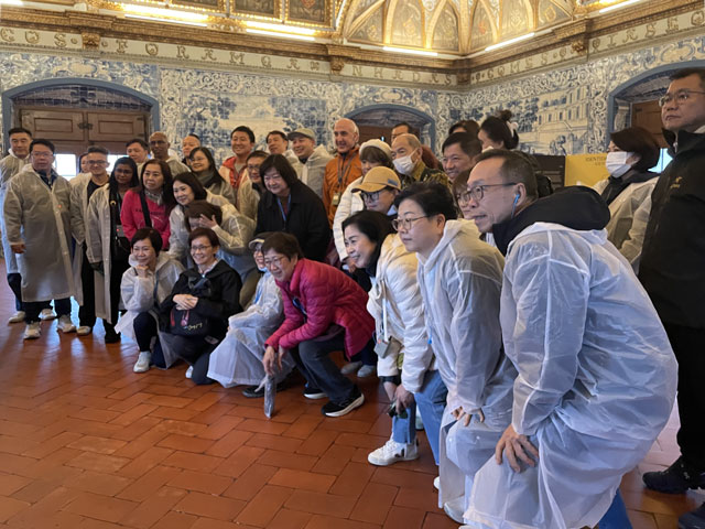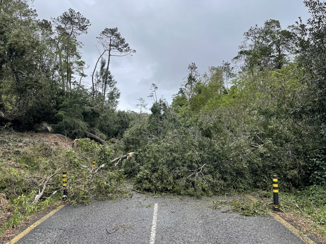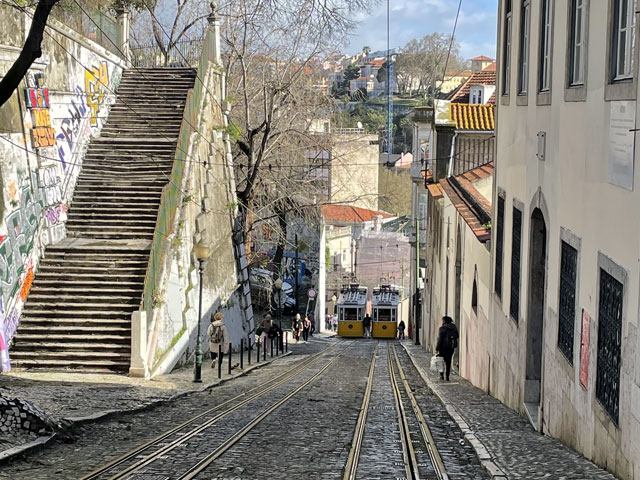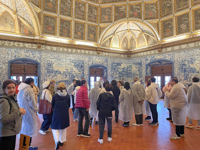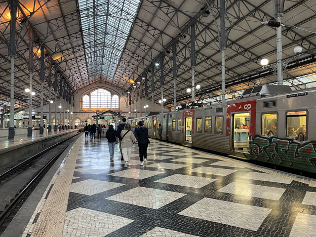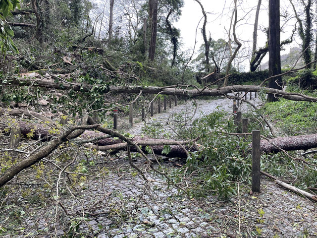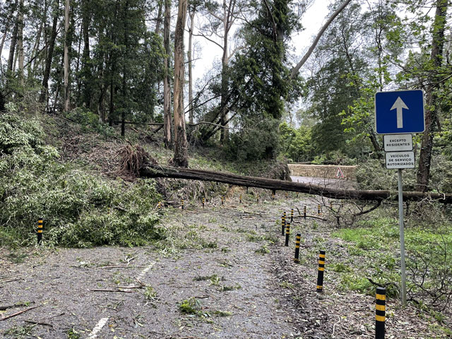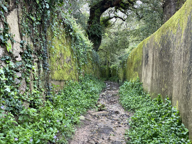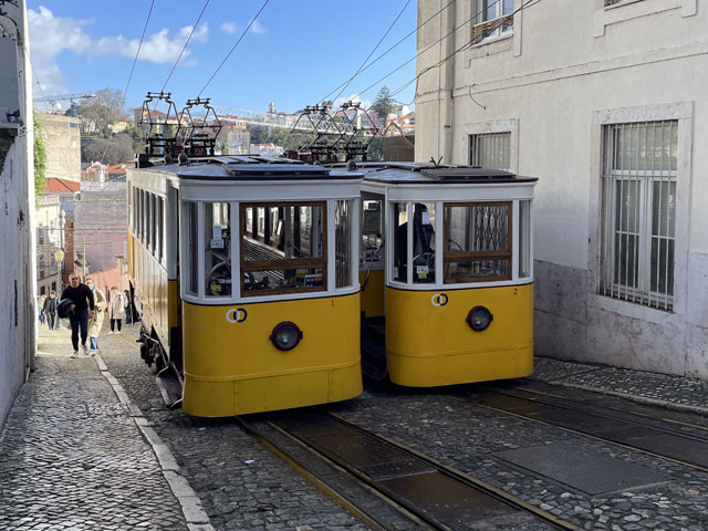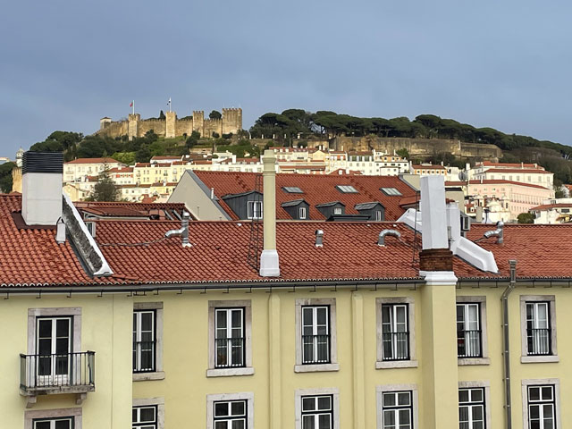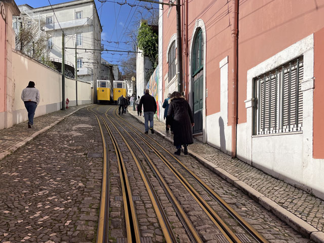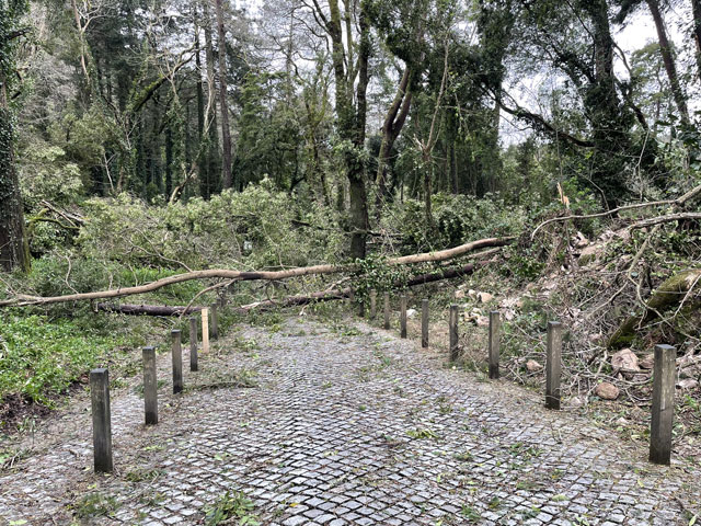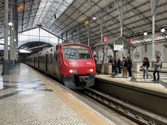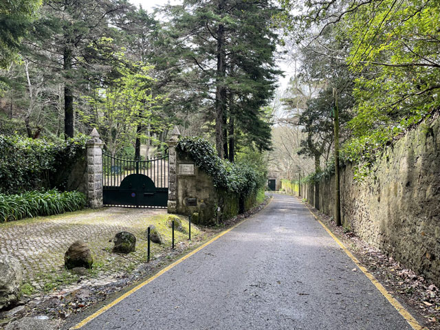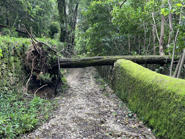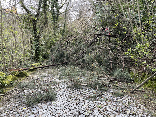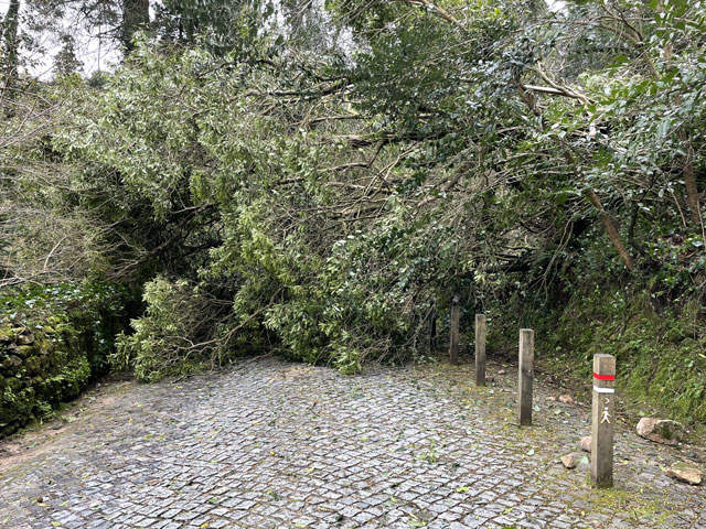 Morgens setzte dann irgendwann der Flugverkehr ein. Der Flughafen ist zwar am anderen Ende der Stadt, aber die Maschinen sind offenbar alle in Richtung Süd-West über unser Stadtviertel abgeflogen. Da ich fast mein ganzes Leben in einer Einflugschneise gewohnt habe, stört mich das nicht wirklich. Aber jetzt, da Tegel zu und der BER auf ist, und nur noch selten was über unser Dorf fliegt, fallen mir die Fluggeräusche plötzlich auf. Bei der Morgenprozedur im Waschraum flog auch gerade was über uns hinweg. Aber plötzlich waren da die aus Kriegsfilmen bekannten Stuka-Geräusche, die mich erschreckt haben. Dann habe ich jedoch mitbekommen, dass der junge Mann am Waschbecken neben mir nur eine monströse elektrische Zahnbürste in Betrieb gesetzt hat. Der Schreck hat gesessen. Apropos Waschbecken: Das sind hier wieder welche in dem Format, das kein Sockenwaschen zulässt, weil die Socken gar nicht in voller Länge reinpassen. Schlimmer ist eigentlich, dass man beim Waschen seine Sachen nirgendwo hinlegen oder anhängen kann. Auf dem schmalen, schrägen Ablagebrettchen kommt sogar eine konventionelle Zahnbürste ins Rollen. Das habe ich mir doch gedacht, dass ich auch bei diesem Quartier einen Makel finde. Nicht zu beanstanden war das Frühstück, das wieder Wurst, Käse und sehr guten Automatenkaffee in allen denkbaren Varianten zu bieten hatte. Sogar Gurke und Tomaten gab es und die Liebhaber süßer Sachen haben sich zudem über Croissants und Pastel del Nata freuen können. Etwa um neun bin ich los, da war richtig schönes Wetter: blauer Himmel und nur am Horizont ein paar weiße Wölkchen. Von Wind keine Spur. Als Wetter-App-gläubiger Mensch bin ich ohne Sonnencreme und -brille los. Bergauf und -ab, wie hier wohl jeder Weg in der Stadt verläuft, bin ich direkt zum Bahnhof Lissabon-Rossi und von dort mit dem nächsten Zug nach Sintra gefahren, wo es auf und um einen Berg verteilt eine maurische Burg und einige Paläste zu besichtigen gibt. Das Ausflug dorthin wird in jedem Reiseführer dringend empfohlen und das haben offenbar auch viele gelesen, denn der Bahnsteig war ziemlich voll, als ich ankam. Aber die Portugiesen denken mit und haben in diesem wunderbaren alten Kopfbahnhof aus Eisen und Glas die Bahnsteige so angelegt, dass man von beiden Seiten gleichzeitig einsteigen kann. Da der Zug zudem mit schon ausgefahrenen Trittbrettern ankommt, beschleunigt das die Abfertigung enorm. Der Zug, eine hiesige „S-Bahn“ mit Oberleitung, war richtig lang, so dass sich die Leute gut verteilt haben. 45 Minuten dauert die Fahrt und die war ganz entspannt. Draußen gab es viel zu sehen - vorwiegend Neubauviertel, die sich eigentlich bis Sintra hinziehen. Zwischendurch aber auch in mehreren Orten Aquädukte, mal niedrig und unscheinbar, mal so wie man sie von Postkarten kennt. In Sintra wälzte sich dann der gesamte Inhalt des Zuges in Richtung Stadtzentrum. Da manche nicht so schnell sind und alle halbe Stunde ein neuer Zug ankommt, ergießt sich ein nicht abreißender Touristenstrom über den kleinen Ort. Dort verteilen sich die Ankommenden auf die Gaststätten, Souvenirläden und Sehenswürdigkeiten. Vor dem „Palácio Nacional de Sintra“, der mit seinen kegelförmigen Schornsteinen die Silhouette prägt und Vorlage für das Logo der Stadt war, hatte sich schon eine etwas längere Schlange gebildet. Da hatte ich keine Lust, mich einzureihen. Ich wollte lieber ein Stück laufen und praktisch „von hinten“ zum weithin sichtbaren, mehrfarbigen „Palácio de Peña“ und zur Maurenburg „Castelo do Mouros“, die auf 500 m bzw. 460 m hohen Bergen liegen - Sintra selbst liegt etwa auf 200 m Höhe. Wegen der Entfernung und der Höhe fährt wohl die Mehrzahl der Touristen mit dem Bus, der auf einer Rundtour alle Sehenswürdigkeiten abklappert. Nach Besichtigung der St.-Martin-Kirche im Ort und einem Besuch der Touristeninformation bin ich losgelaufen. Am Seteais Palace, einem jetzt als Nobelhotel dienenden Palast aus dem 18. Jahrhundert, von dem aus man einen guten Blick übers Land hat, lichtete sich die Schar der Läufer. Nur wenige haben sich wie ich auf den 75-Minuten-Weg zum Peña-Palast gemacht. Leider setzte da gerade ein kurzer Regen ein, der es angebracht erschienen ließ, sich erstmal unterzustellen. Als es dann weiter ging, kam uns Polizei entgegen und forderte uns auf, umzudrehen, weil die Straße wegen Unwetterschäden gesperrt ist. Also habe ich doch den Wanderweg (PR4SNT) genommen, der gegenüber dem Seteais-Palast zwischen zwei Grundstücksmauern bergauf führt. Diese Schneise wollte ich eigentlich meiden, weil sich da wieder Weg und Bächlein den Platz teilen. Mit etwas Balancieren bin ich dann aber doch ganz gut und mit trockenen Füßen oben angekommen. Die Straße, auf der ich gelandet bin, ist jene, die „von hinten“ zum Peña-Palast und zur Maurenburg führt, der Weg zwischen den Mauern war also nur eine Abkürzung. Auf der Straße zeigte sich dann, dass hier in den letzten Tagen ordentlicher Sturm gewütet hat. Es lagen nicht nur viele abgerissene Äste auf der Straße. Es waren auch viele Bäume umgeknickt oder entwurzelt und manche lagen quer über der Straße, so dass ich wiederholt irgendwo rüberklettern oder unten durch kriechen musste. Die Bruchstellen bzw. die sichtbar gewordenen Wurzeln der Bäume bewiesen, dass die in den letzten Tagen, manche vermutlich in der vergangenen Nacht umgestürzt sind. Es hatten sich noch keine Trampelpfade um die Hindernisse herum gebildet und nur vereinzelt ist schon eine Kettensäge im Einsatz gewesen. Eigentlich hätte man denken können, dass heute unentwegt Kettensägen im Einsatz sind, aber es gibt vielleicht gar nicht genug, um die Schäden schnell zu beseitigen. An den Zugängen zum Park, der den Peña-Palast umgibt, waren die Tore geschlossen und Schilder verwiesen darauf, dass der Palast geschlossen ist. Auf der angegebenen Webseite erfuhr man, dass dieser und weitere Paläste des schlechten Wetters wegen am 19. 