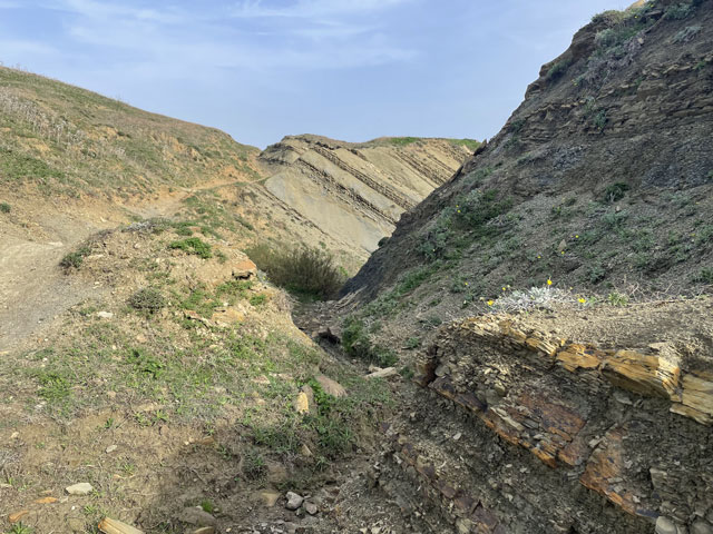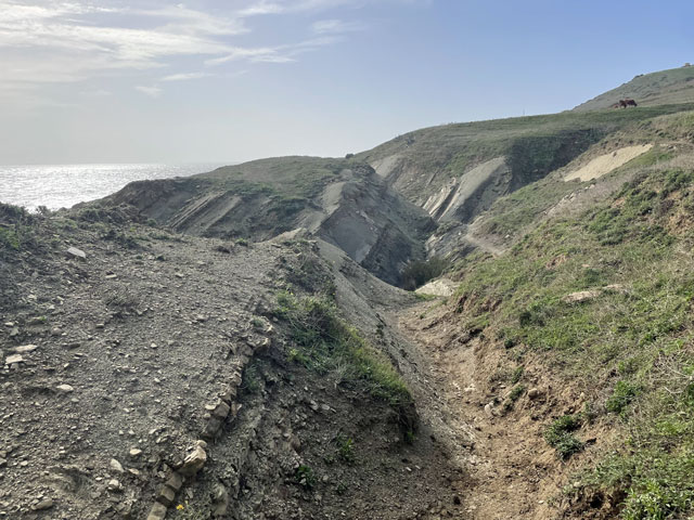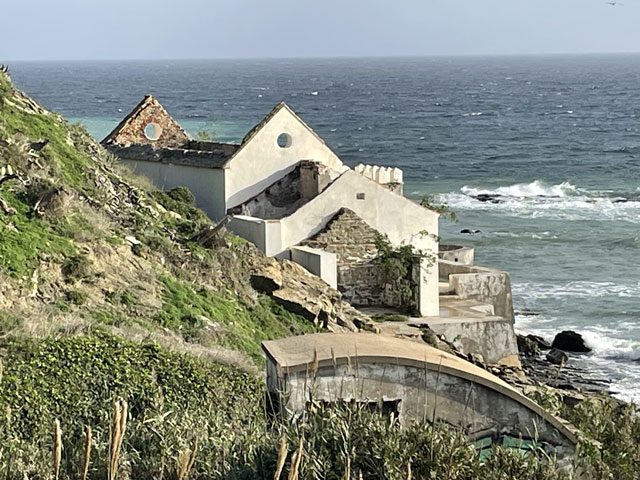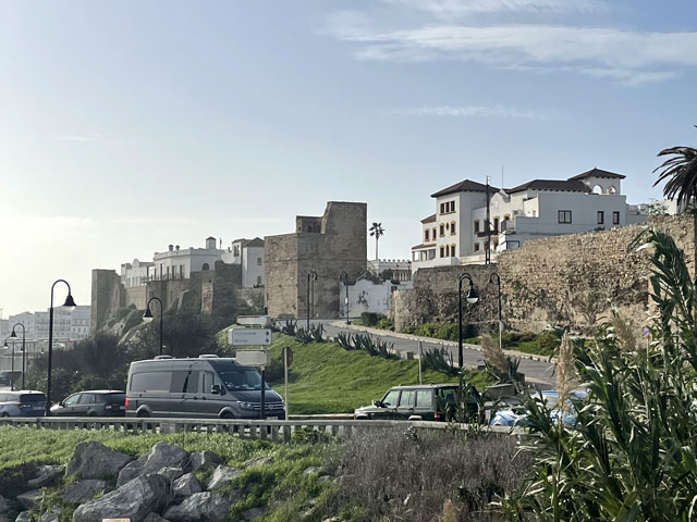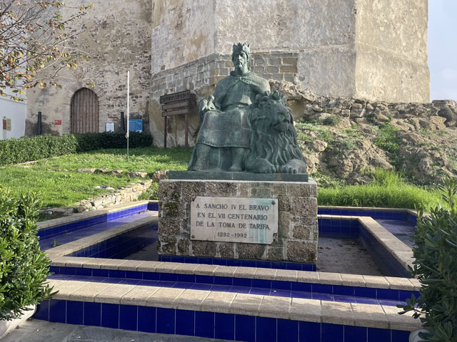 Um es kurz zu machen: es war eine Pein, an der Straße zu laufen. Die Fahrbahnränder sind zu schmal, um dort sicher laufen zu können, und der Trampelpfad hinter der Leitplanke ist holprig, abschüssig und voller Müll, der hier üblicherweise aus den Autofenstern fliegt. Außerdem wird an vielen Stellen gebaut und an den Baustellen steht einem nicht mal dieser Trampelpfad zur Verfügung. Das Laufen ist da ziemlich anstrengend und dazu kommt dann noch der Lärm der vielen Autos, die im Berufsverkehr unterwegs sind. Darum habe ich auf halber Strecke zwischen Algeciras und El Pelayo die Straße verlassen und den kürzesten Weg zu meinem Camino gesucht. Es hatte sich nämlich gezeigt, dass der Wind die dicken Wolken landeinwärts bis hinter die N 340 getrieben hat und es dort, wo der Camino verläuft, gar nicht so schlimm an Himmel aussieht. Der vom Routenplaner vorgeschlagene Weg verlief zunächst auf einer völlig zerfahrenen Straße und dann als kaum sichtbarer Trampelpfad über Wiesen, die mit Feldsteinen gespickt sind. Da musste ich mehrmals im Zickzack laufen, um den Trampelpfad wiederzufinden. Den Spuren zufolge waren da auch weit mehr Tiere als Menschen unterwegs. Getroffen habe ich niemand. Zwischendurch ging es zweimal über kleine Bäche, wo etwas Balancierkunst gefragt war. Außerdem waren laufend irgendwelche Gatter zu öffnen und wieder zu schließen. Das Laufen auf diesem Terrain war also auch nicht ganz einfach, aber es fehlte wenigstens der ätzende Straßenlärm. Als ich dann in Sichtweite von El Pelayo auf die „Via del Estrecho“ traf, konnten sich die Füße über einen sehr gut begehbaren Weg freuen. Eigentlich ist das eine unbefestigte Straße, die aber in jüngerer Zeit glatt gewalzt wurde, vermutlich um darauf die Teile der am Horizont zu sehenden Windräder zu transportieren. Da lief es sich ganz prima, obwohl Schilder am Weg sagten, dass es sich um eine Militärstraße handelt, die in schlechtem Zustand ist und Gefahren birgt. Nichts dergleichen. Da der Weg, oder besser die Straße, immer auf etwa gleicher Höhe an den Berghängen verlief, war er zwar ziemlich lang und kurvig, aber halt ohne große Höhenunterschiede, abgesehen vom Aufstieg zu einer Reihe von Windrädern. Die haben im Übrigen bei dem heftigen Wind, der blies, ordentliche Drehzahlen hingelegt und dabei ziemlich laute Geräusche gemacht. Hinter den Windrädern ging es recht steil bergab zur Mündung des kleinen Flüsschens Guadalmesi. Der ist auf einer Furt zu überwinden, in der glücklicherweise das Wasser nur so hoch stand, dass man mit hohen Sohlen und weiten Schritten trocken rüber kam. Bei Regen wäre das nicht mehr so einfach möglich gewesen. Links und rechts der Mündung waren ein paar Wochenendgrundstücke, wo ich meinen Wasservorrat auffrischen konnte. Es waren doch immerhin 19 Grad und ich bin auf dem Weg ziemlich ins Schwitzen gekommen. Hinter der Furt ging es ein paar Meter steil bergauf bis zu einen halb verwitterten mittelalterlichen Turm (Torre de Guadalmesi), der diesen Küstenstreifen dominiert. Zu seinen Füßen hat man freundlicherweise einen Rastplatz eingerichtet, aber bei dem stürmischen Wetter war der kaum nutzbar. Ich glaube aber, dass das Klima hier trotz oder gerade wegen des Windes sehr gesund ist - mir hat der Wind zumindest eine ungesunde Chips-Tüte aus der Hand gerissen. Ab dem besagten Turm ging es immer parallel zum Ufer weiter. Zunächst auf einer etwas holprigen, unbefestigten Straße und später auf einem Trampelpfad dicht an der Wasserkante. Das ist hier alles Steilküste, aber die ist nur ein paar Meter hoch und nicht so spektakulär wie zum Beispiel die am Camino del Norte. Dafür gibt es hier diverse Bunker und Geschützstände zu sehen. Plötzlich tauchten auch mal Schilder auf, die „Militärgelände“ und „Betreten verboten“ verkündeten. Die waren aber wohl noch aus dem zweiten Weltkrieg. Praktisch als Aufforderung, diese zu ignorieren, war immer am nächsten Mast ein gelber Pfeil als Zeichen für den Jakobsweg. Für Freunde der Plattentektonik hat man hier an vielen Stellen schon vor Millionen Jahren den Meeresboden am Ufer schräg hingestellt, damit man die sehr verschiedenen Gesteinsschichten gut sehen kann. Auf den letzten Kilometern vor Tarifa hat man sogar noch den als Camino ausgeschilderten Weg von der Straße weg mitten in die Gesteinsschichten verlegt. Da liegen viele tausend Jahre Erdgeschichte zwischen dem linken und dem rechten Fuß. Das ist interessant und schön anzusehen, geht aber beim Laufen ziemlich auf die Fußgelenke. Deshalb bin ich bei der nächstbesten Gelegenheit wieder auf die Straße. Den Schildern am Weg und der Karte folgend ging es ganz zum Schluss nochmal durch ein Wäldchen und plötzlich stand ich am Stadtrand von Tarifa direkt am Wasser. An der Stelle fällt einem schon auf, dass in der Stadt fast die ganze Uferlinie mit Festungen versehen ist. Die erste ist frei zugänglich und bietet einen prima Blick auf den Hafen. Den konnte ich aber gar nicht so richtig genießen, weil ich so furchtbar durstig war. Mit einem Getränk aus dem nächst gelegenen Krämerladen ging das schon viel besser. Eindrucksvoll war es, den Fähren nach bzw. von Tanger zuzuschauen, wenn diese im Zickzack durch die Molen ihren Liegeplatz ansteuern und dort Autos und Radfahrer ausspucken oder aufsaugen. Es sind grundsätzlich breite, aber flache Katamarane, die einen gespenstischen Eindruck machen. Gegen fünf bin ich dann erstmal in die gebuchte Herberge, ein Hostel in dem sich üblicherweise Kite-Surfer rumtreiben. Ich hatte bei booking.com drei Herbergen mit 19…20 € pro Bett gefunden und mir das „Lion Hostel by Kitesurf Tarifa“ ausgesucht. Das ist in einem der zweistöckigen Häuser, die außen an der Stadtmauer angebaut sind und diese fast unsichtbar machen. Innerhalb der Stadtmauer ist Tarifa ein sehr nettes, doch recht beschauliches Städtchen. Es ist übrigens die südlichste Stadt des europäischen Festlandes. (Die Inseln 