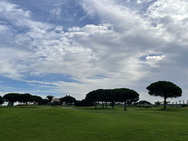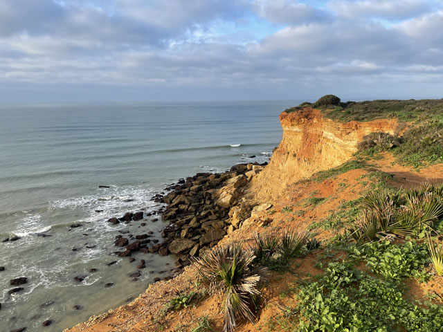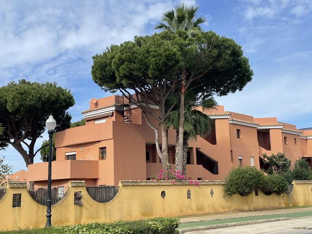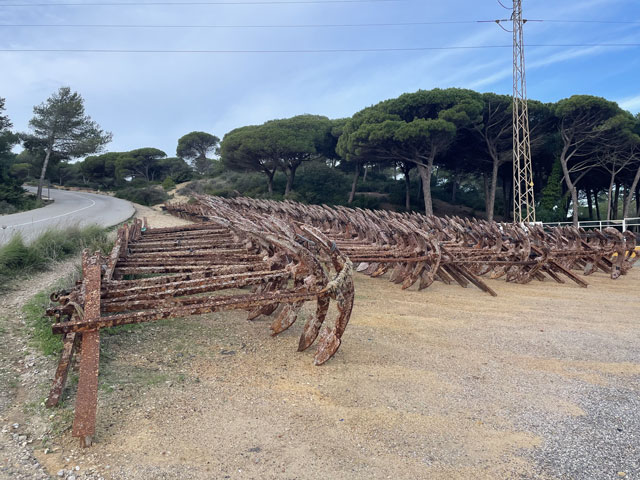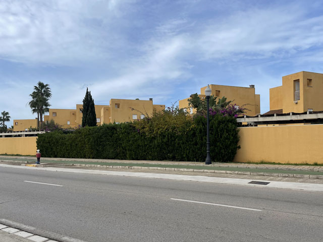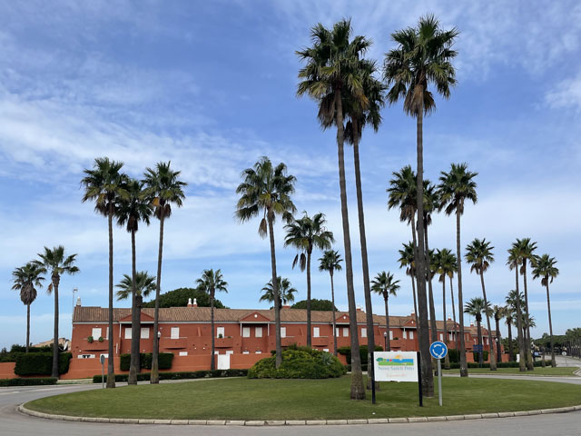 So gegen sieben, als es noch dunkel war, bin ich losgezogen. Im vermeintlichen Zentrum des Ortes mit Kirche und altem Wehrturm war da schon ordentlich was los. Da sollte wohl ein Film gedreht werden und unzählige Hilfskräfte schleppten Scheinwerfer, Kameras usw. durch die Gegend, rollten Kabel aus und bauten Podeste. Jene, die was zu sagen hatten, oder sich für solche hielten, lungerten derweil vor der schon offenen Kneipe rum und besprachen bei dampfenden Kaffee den anstehenden Dreh. Diesen Vorbereitungen habe ich es zu verdanken, dass ich mir die ansonsten sicher verschlossene Kirche anschauen konnte. Die Filmleute hatten dort nämlich über Nacht ihre ganze Technik gelagert, die sie jetzt rausholten und über den Platz verteilten. Um aus dem Ort rauszukommen, musste ich erstmal auf der Karte erkunden, wo die sich ans Zentrum anschließenden Urbanisationen ihre Ein- und Ausfahrten haben. Aus den verschiedensten Gründen sind die Eigentümer hier bedacht, den Durchgangsverkehr aus ihren Wohnsiedlungen rauszuhalten. Selbst wenn nichts umzäunt und abgeschlossen ist, kann man meist nicht so einfach vorne reine und hinten raus. Da dreht man mitunter unfreiwillig eine große Runde, um genau da wieder rauszukommen, wo man reingekommen ist. Hinter einer solchen, noch im Bau befindlichen Urbanisation ging es noch durch mehrere Siedlungen älteren Datums, die nicht so abgeschlossen sind - kleine Dörfer, in denen viele Häuser nur in der Ferienzeit bewohnt sind. Da kann man die eine oder andere tolle Villa bestaunen, aber sonst gibt es da nichts zu sehen. Hinter der vorerst letzten Siedlung führte der ausgeschilderte Wanderweg hoch auf die Steilküste und verlief fortan dicht an der Kante, so dass man immer wieder tolle Blicke auf die Klippen und die dazwischen liegenden Strände hatte. Zu denen führen an vielen Stellen Treppen runter. Da man an den meisten Stellen mit dem Auto bis an die Treppe heranfahren und dort kostenlos stehen kann, trifft man auch zu dieser Jahreszeit dort Urlauber. Bei uns würde man mit allen Mitteln versuchen, Autofahrer von solchen Plätzen fernzuhalten oder ordentlich zur Kasse zu bitten. Hier ist es so, dass an der Zufahrt zu den Klippen zwar auf einer Tafel ein „Einfahrt verboten“-Zeichen ist, aber darunter geschrieben steht, dass dies nicht für Touristen gilt. Verkehrte Welt. Am Cabo Roche, wo es neben einem Leuchtturm einen modernen Sport- und Fischereihafen gibt, führt der Weg mal runter zum Wasser und über das Flüsschen Rio Roche. Da unten stehen zu beiden Seiten der Straße rostige, mannshohe Anker aufgereiht. Ein regelrechter Ankerfriedhof. Verwunderlich ist nur, dass alle vom gleichen Fabrikat und im gleichen Zustand sind und dass diese wie nachts die Tische vor der Kneipe alle mit Stahlseilen gesichert sind. Wer klaut denn rostige Anker? Jemand der mal „den Anker werfen“ will? Dicht am rechteckigen Leuchtturm auf der Klippe, der dem Anschein nach mal ein mittelalterlicher Wachtturm war, stand am Wegesrand ein Armeefahrzeug mit einem Schiffsradar oben drauf. Die Tür des Bedienraumes stand offen und man konnte da einem Soldaten bei der Arbeit zuschauen. Sowas nenne ich „Öffentlichkeitsarbeit“. Weiter ging es auf einem von Füßen und Rädern zerfurchten Klippenweg, der hinter dem letzten Abgang zum Strand in einen Holzsteg überging und auf ein großes, dreistöckiges Hotel zulief, das regelrecht den Weg versperrte. Das war in einem sehr guten Zustand, aber alle Fenster waren geschlossen und die Vorhänge zugezogen - Winterpause! Dahinter fand sich eine Siedlung, die wie der Fluss und das Kap „Roche“ heißt und sich mehr als einen Kilometer am Wasser langzieht und ebenso breit ist. Da konnte man wieder schöne Anwesen unter riesigen Palmen bestaunen, aber leider auch im Ortskern eine Kirche mit kaputten Fenstern. Und, wie hier auch in kleineren Orten üblich, mit eigenen Kanaldeckeln auf der Straße. In einer kleinen Parkanlage mitten im Ort rollten gerade unter den Bäumen ein paar Frauen ihre Gummimatte ein, auf denen sie Gymnastik gemacht hatten. Viel mehr kann man hier wohl im Winter auch nicht unternehmen. Aber immerhin fährt ein Bus in die nächste Stadt. Hinter Roche gesellte sich wieder ein breiter Radweg zur Straße - im warmen Ockerton und ohne Risse! Dann kam etwas in Sicht, was von weitem wie eine Ritterburg aussieht, sich dann aber nur als eine Bettenburg erwies. Aber eine einfallsreich gestaltete. Die vielen, meist mit blickdichten Mauern umgebenen Urbanisationen, die danach folgten, waren hingegen weniger einfallsreich. Da ragten mehrgeschossige Bauten über die Mauern, in jeder Urbanisation einheitlich. Nur vereinzelt war da mal eine Jalousie hochgezogen. Zwischendurch kam mal wieder ein Hotel, bei dem man an der Zufahrt den (bekannten) Namen verhüllt hat, damit sich niemand auf das Gehöft verirrt. Aber immerhin waren ein paar Leute auf dem gepflegten Golfplatz, der sich auf beiden Seiten der Straße zwischen die Urbanisationen zwängte und dessen Hälften durch einen Tunnel unter der Straße miteinander verbunden waren. Ich weiß nicht, ob das Zufall war, aber auf der einen Seite waren nur Männer unterwegs und auf der anderen nur Frauen. Diese Ansammlung von Ferienunterkünften nennt sich Novi Sancti Petri und hat natürlich auch eigene Kanaldeckel, allerdings ganz einfallslose. Die Straße, die sich durch den Ort zieht, kann man pompös nennen. Neben den Richtungsfahrbahnen gibt es jeweils einen Standstreifen und einen breiten Fußweg. Auf einer Straßenseite finden sich außerdem links vom Fußweg ein alter und rechts davon ein neuer Radweg. Da war natürlich auch nur mäßig was los. Die Funktion der Standspuren hat sich übrigens sehr schnell geklärt. Zwecks Verkehrsberuhigung hat man Schwellen auf die Fahrbahnen geklebt. Und weil es immer so holpert, wenn man dort mit etwas höherer Geschwindigkeit rüber fährt, benutzen viele Autofahrer die Standspur, um die Schwellen zu umfahren. Wenn man einem solchen