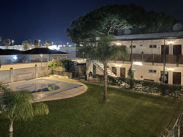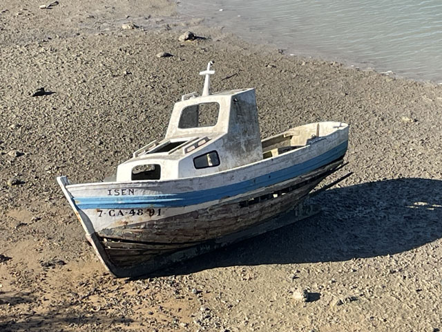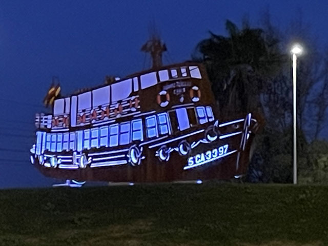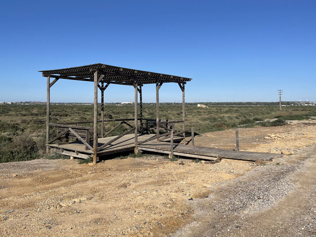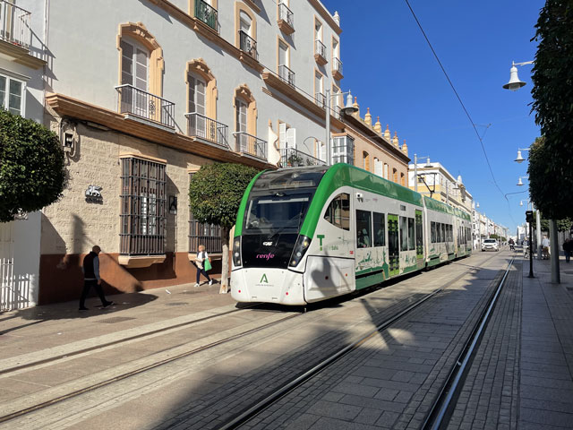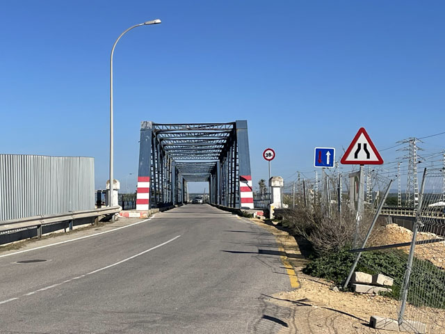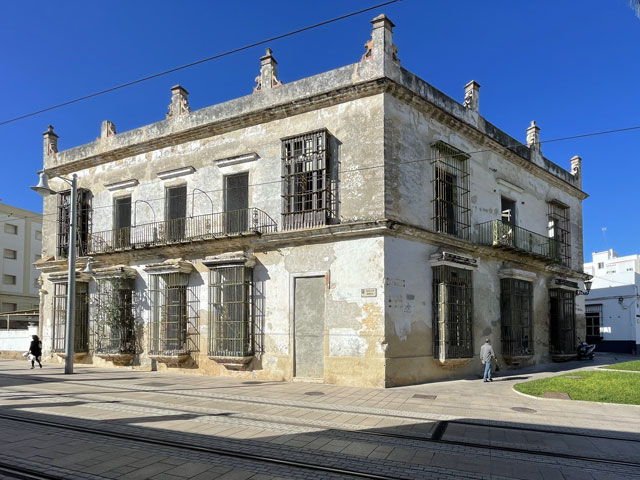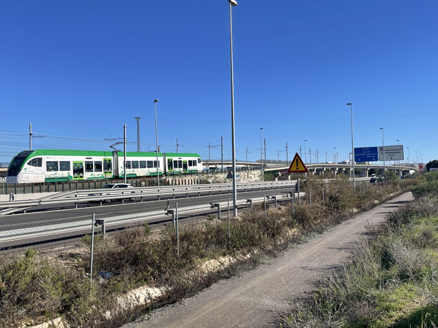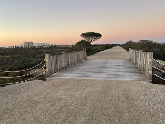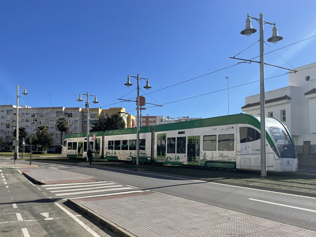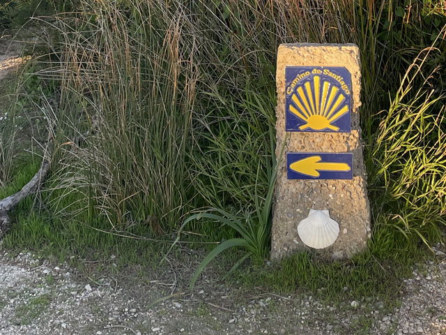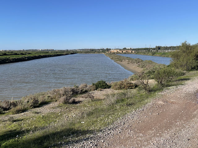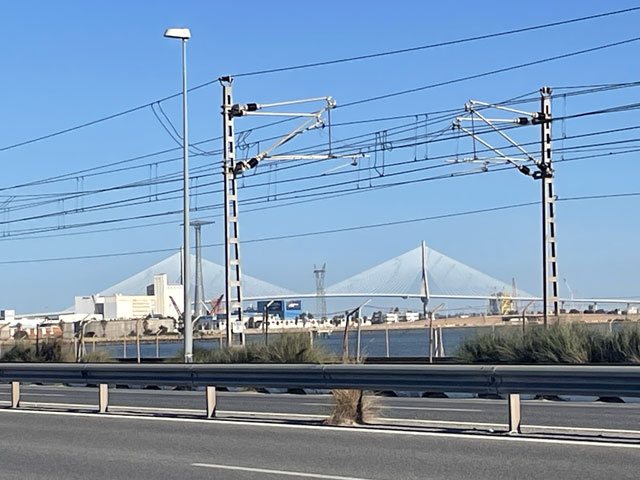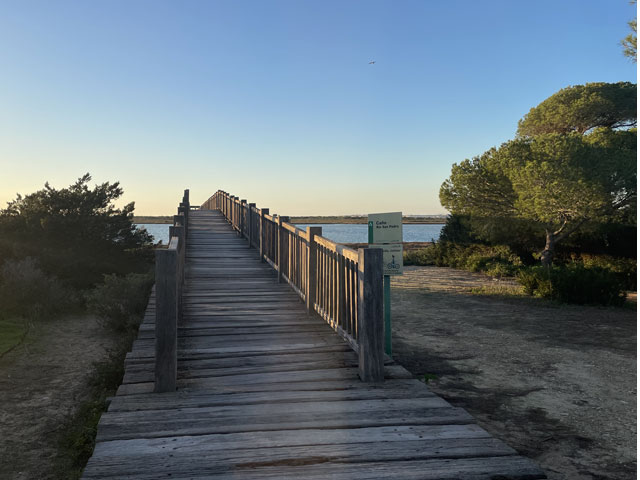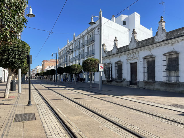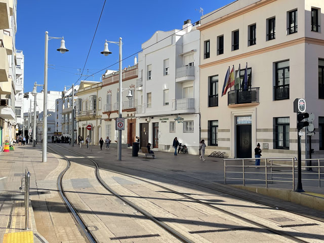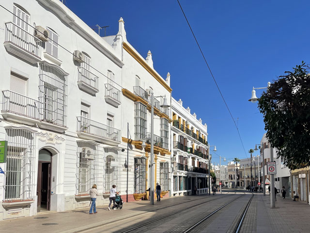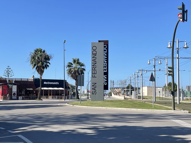 Schließlich habe ich den gepackten Rucksack im Zimmer stehen lassen und noch eine morgendliche Runde durch die Stadt gedreht. Das war schön und interessant, aber eigentlich wollte ich ja zeitig aufbrechen. Im Hafen lag vorn eine anderes Kreuzfahrtschiff als gestern, die „AIDA diva“, dahinter mindestens ein zweites, noch größeres. Am Tag zuvor hatte ich drei gezählt, darunter eine „Costa …“, die alle überragte. Auf dem Platz vor der Kathedrale war zu meiner Freude die teilweise eingerüstete Jakobskirche, die „Iglesia de Santiago Apóstol“ offen. Die ist innen nicht sonderlich schön, aber üppig ausgestattet. Allein auf dem Altar standen etwa 100 Kerzen. Unter den vielen Figuren und Bildern an den Wänden konnte ich leider nur einen Jakobus finden, der in einer geschnitzten Figurengruppe vor Maria kniet. Im Altarraum war der Pfarrer mit Vorbereitungen für den Morgengottesdienst beschäftigt. Von dem habe ich einen richtig schönen Stempel bekommen, so wie man ihn sich für den Start auf einem Camino wünscht. Hier und nicht an der benachbarten Kathedrale beginnt nämlich die nach Sevilla führende Via Augusta, wie die Angabe „km 0“ zusammen mit der Jakobsmuschel neben der Kirchentür bezeugen. Um acht war ich zurück im Hostel. Da war die Küche leider immer noch verschlossen. Erst zehn Minuten später kam eine Dame, um aufzuschließen. So war es schon fast um neun, als ich gut gefrühstückt aufgebrochen bin. Das war wieder spät für einen langen Weg. Ich wollte mindestens bis Puerto Real, vielleicht sogar bis El Puerto de Santa Maria kommen, weil ich da günstigere Übernachtungsmöglichkeiten gefunden hatte. Es ging zunächst auf der Atlantikseite von Cádiz gen Süden, auf einer schönen Uferpromenade, die auf der Landseite von etwa zehngeschossigen Wohnhäusern flankiert wird. Im Gegensatz zu anderen Küstenorten waren darin aber nicht nur Ferienwohnungen. Hier wurde richtig gelebt und auf der Promenade waren auch um diese Zeit schon einige Leute unterwegs. Hinter den letzten Wohnbauten trifft man nochmal auf eine Art Stadtmauer und auf ein kleines Militärgelände, an dem die Promenade endet. Hier fängt der Damm an, der Cádiz mit dem Festland verbindet. Darauf befindet sich die zweigleisige Eisen- und Straßenbahnstrecke, die viel befahrene CA 33, eine Servicestraße mit einem durchgehenden Parkstreifen, auf dem man unbegrenzt kostenfrei stehen kann, und zum Atlantik hin Dünen und ein breiter Strand. Hier kann man also zum Baden bis an einen der hölzernen Dünen-Übergänge heranfahren und das Auto dort umsonst stehen lassen. Während ich da lief, fuhren auf den Gleisen außer der Straßenbahn auch ein viergliedriger Regionalzug des Eisenbahnunternehmens „renfe“ und sogar ein Hochgeschwindigkeitszug „AVE“ - die Variante mit der langen, flachen Schnauze, die dem Zug das Aussehen eines Krokodils verleiht. Auf der Hälfte des Damms steht am Straßenrand ein Restaurant, an dem die Servicestraße endet. Dahinter geht es stattdessen auf einem gut planierten Wanderweg weiter. Der Damm macht schließlich auf der Höhe eines weiteren Militärgeländes einen Knick nach links. Rechts kommt eine Landschaft hinzu, wie ich sie zwischen Chiclana und San Fernando durchquert habe: eine von Wasserläufen und -becken zersetzte Fläche, die nur mit knie- bis hüfthohen Sträuchern bewachsen ist und damit einen weiten Blick darüber hinweg erlaubt. Sie ist Teil des Naturparks „Parque Natural de Bahia de Cádiz“. Der Rio Arillo, der dieses Gebiet durchzieht, trifft am Damm auf eine ehemalige Mühle, die mit horizontalen Schaufelrädern den nur geringen Höhenunterschied gegenüber dem Wasserstand in der Bucht ausnutzte. Über den Gleisen tut sich schließlich eine Brücke auf. Hier werden Eisen- und Straßenbahn entflechtet. Die Eisenbahnstrecke schwenkt leicht nach links und passiert San Fernando auf der Seite der Bucht, während die Straßenbahn über die Brücke in die Stadt hineinfährt. Ein Stück verkehrt die Straßenbahn auf einem mit Kunstrasen ausgelegten eigenen Gleiskörper und dann durch die Fußgängerzone, die sich durch die ganze Stadt zieht. Wenn es eng wird, ist mal ein Stück eingleisig. Es macht Spaß da zu laufen, zumal es dort viele Geschäfte und einige attraktive alte Häuser gibt. Inzwischen war es schon früher Nachmittag und die Vorschulkinder wurden abgeholt. Die waren mit ihrer einheitlichen Schulkleidung schön anzusehen. Am Nordende der Fußgängerzone kommt man an einen Kreisverkehr, wo die nach links abgehende Straße zu nehmen ist. Die trifft nach einer Weile wieder auf die Eisenbahnlinie und damit auch auf den Jakobsweg. Der geht nämlich lt. Karte nicht durch die Fußgängerzone, sondern verläuft am westlichen Stadtrand entlang der Bahnlinie. Hinter der Eisenbahnunterführung bin ich den Schildern folgend entlang der Bahn gelaufen. Über den Caño de Sancti Petri führt parallel zur Bahnbrücke auch eine Straßenbrücke, die allerdings einspurig und nur mit Vorfahrtsregelung statt Ampel ist. Aber das funktioniert auch. Links und rechts sind schmale Fußwege mit einem rostigen Geländer, das man aber besser nicht anfassen sollte. Hinter dem Fluss geht es auf einem sandigen Weg entlang der Bahnlinie weiter, wieder durch die beschriebene Naturpark-Landschaft. Inzwischen war es um drei und der Routenplaner sagte mir, dass es bis El Puerte de Santa Maria noch 16 km, also vier Stunden sind. Ankunft folglich um sieben, wenn es schon dunkel ist. Trotzdem habe ich dort ein Zimmer im Hotel Campomar Playa gebucht, da angeblich nur noch eins zu einem günstigen „Jahresendpreis“ verfügbar war - nach der Buchung war da allerdings immer noch „nur noch eins verfügbar“ zu lesen. In der Begrüßungsmail stand, dass die Rezeption bis acht besetzt ist. Das war gut zu schaffen, viel Spielraum zum Trödeln war da aber nicht gegeben. In Puerto Real führt der Weg in voller Länge durch die Stadt. Zunächst sehr schön entlang der ersten Ha