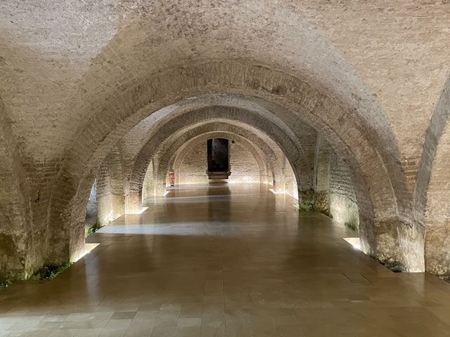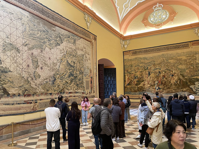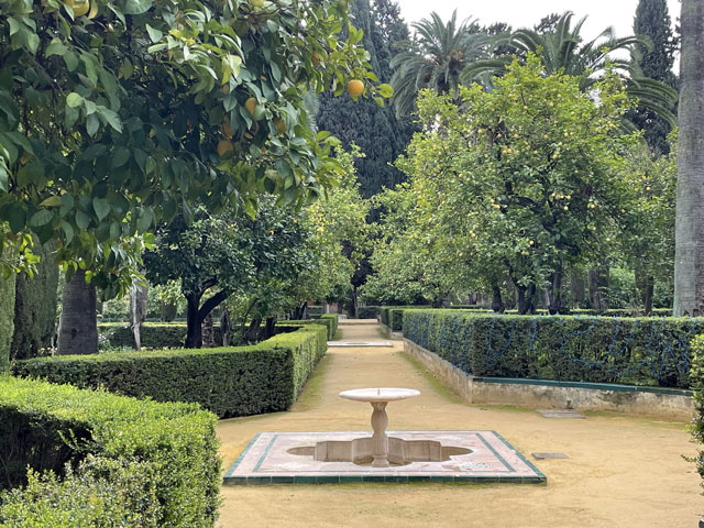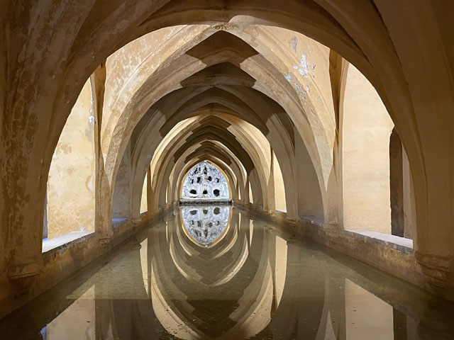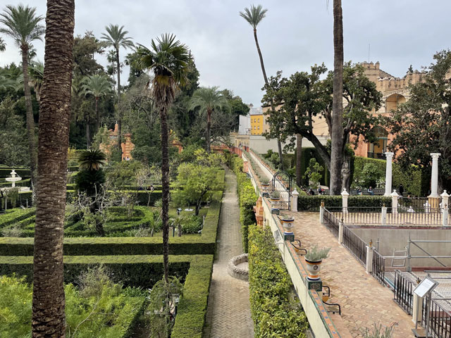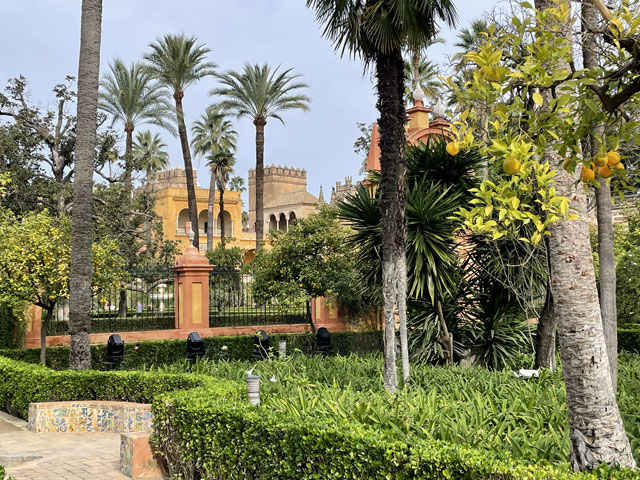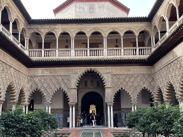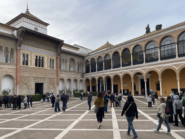 Der heutige Tag war der Kultur gewidmet. Nach einem reichlichen Frühstück, das alle meine verbliebenen Vorräte aufgezehrt hat, habe ich meinen Rucksack so gepackt, dass er keinen allzu voluminösen Eindruck macht und hoffentlich von Vueling als Unter-dem-Sitz-Gepäck akzeptiert wird. Den konnte ich tagsüber im Hostel stehen lassen, was natürlich prima war. Um halb zehn bin ich aufgebrochen und ziemlich direkt zur Kasse des Alcazar, nahe der Kathedrale gelaufen. Da habe ich mir für 10.30 Uhr ein Rentnerticket (7 € statt 14,50 €) geholt. Am Eingang des Alcazar stand schon eine lange Schlange am 10.30-Uhr-Schild. Da es Blödsinn ist, sich da anzustellen, weil alle mit einem solchen Ticket nicht früher und nicht wesentlich später reinkommen, habe ich die verbliebene halbe Stunde noch für eine kleine Besichtigungsrunde über den Platz an der Kathedrale genutzt, wo unzählige Kutschen auf Japaner und gelegentlich auch andere Fahrgäste warteten.
