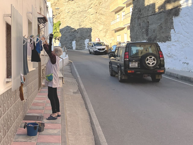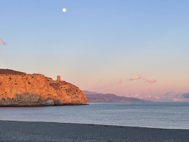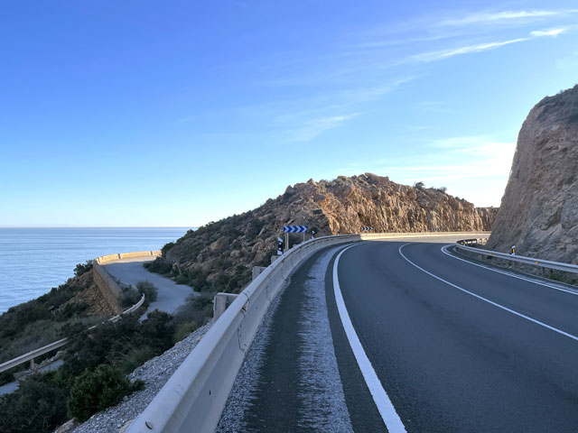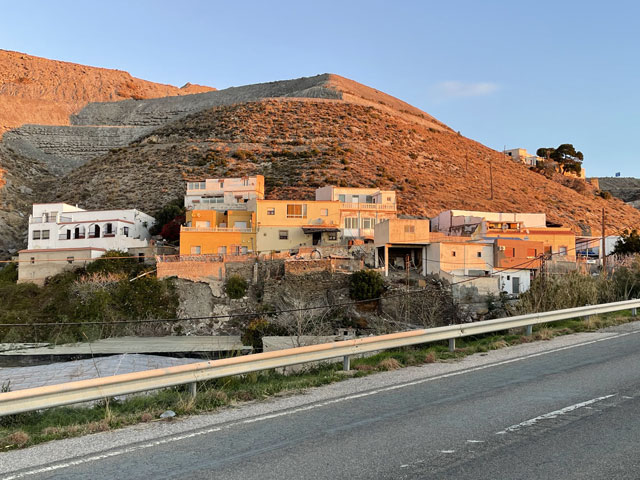 Kurz nach acht bin ich aufgebrochen und als ich die lange Kehre runter zum Wasser hinter mir hatte, war genau der Zeitpunkt des Sonnen-aufgangs und ich konnte sehen, wie die Sonne aus dem Wasser aufstieg. Hell war es zu diesem Zeitpunkt eigentlich schon, aber nun sah alles ganz anders aus. Die Sonne hat hier ein schönes, warmes Licht, das selbst baufälligen Häusern einen mediterranen Charme verleiht. In Pozuelo, dem ersten Ort unten am Wasser, muss es ein paar strickwütige Frauen geben. Da waren alle Laternen in bunte Strickwaren eingepackt, einige Straßenbäume von aneinander gehefteten oder einfach an den Baum genagelten Topflappen eingehüllt und an manchen Bäumen hing noch gestrickte Weihnachtsdeko. Alles nicht übermäßig schön, aber originell. So wie der als Weihnachtsbaumersatz gedachte grüne Kegel auf dem Dorfplatz. Für Fußgänger führt ein schöner Weg aus dem Ort heraus. Neben einer Reihe Palmen hat man einen Fußweg aus aneinander geschraubten, etwa 1x1 Meter großen, hellen Platten gelegt, auf denen es sich wie auf einer Tartanbahn läuft. Und beidseits dieses Weges sah es einigermaßen aufgeräumt aus, obwohl auch hier Folienzelte stehen. Aber da heute, am Sonntag, die Müllabfuhr unterwegs war, scheint man hier ein Auge darauf zu werfen, dass sich gar nicht erst viel Müll ansammelt. Der Weg endete an einer etwa 20 Meter breiten, beidseits mir hohen Mauern eingefassten Rinne, in der ggf. das Wasser aus den Bergen ins Meer schießen kann. Bei der jetzigen Witterung ist es unvorstellbar, dass solche Flutrinnen notwendig sind. Jetzt kann man an einer bestimmten Stelle zu Fuß oder mit dem Auto die Rinne passieren. Wenn da Wasser drin ist, muss man einen Umweg bis zur nächsten Brücke machen. Auf der anderen Seite der Rinne ist man schon in La Rábita, einem sehr netten Küstenort mit den Resten einer alten Burg. Hinter dem Ort, der wie alle Küstenorte hier eine schöne Uferpromenade hat, führt die Straße ziemlich steil bergauf, bis sie auf die N-340 trifft, die ich, abgesehen von ein paar Ortsbesichtigungen, bis zum Ende des Tages nicht mehr verlassen habe. Das klingt schlimm, ist es aber nicht. Am Sonntag ist da nicht viel los, da sind mehr Radfahrer und Biker (vorzugsweise im 12er-Pack) als Autos unterwegs. LKWs sieht man auf der Straße fast gar nicht, die fahren alle auf der nahen Autobahn. Die Straße hat einen breiten Randstreifen und manchmal sogar einen Fußweg hinter der Leitplanke. Da kann man überall gut und sicher laufen und darüber staunen, wie man den Felsen Platz für die Straße abgerungen hat und wie man durch Brücken und Dämme in den sich zum Meer öffnenden Schluchten versucht hat, enge Kurven zu minimieren. Das ist eine bautechnische Meisterleistung, die noch dazu schön anzusehen ist. So ging es heute den ganzen Tag an der Steilküste entlang und hinter jeder Kurve bot sich ein neuer, oft atemberaubender Blick. Ab der ersten, weit ins Wasser reichenden Klippe hinter La Rábita, konnte ich gut die gesamte Küste bis zu meinem Tagesziel Calahonda einsehen. Das waren ab dieser Stelle noch knapp 25 km Wegstrecke. Es war ein großartiger Anblick. Da lagen im Sonnenlicht aufgereiht die Orte Melicena, Los Yesos, La Mamola, Castillo de Baños de Abajo, Los Cambriles, Castell de Ferro und an der letzten sichtbaren Klippe halt Calahonda, wo mein „Hostal Miguel“ direkt an dem steil aufragenden Felsen liegt, der den Ortseingang dominiert. Leider war es auf der ganzen Strecke nicht so sonderlich gut mit Kneipen und Geschäften bestellt. Erst in La Mamola fanden sich offene Gaststätten und ein kleiner Supermarkt, dann erst wieder in Castell de Ferro. Dazwischen gab es zwar in La Lance ein Restaurant direkt an der Straße, aber da war es ziemlich voll, unter anderem durch eine größere Gruppe Biker. Ich hatte zwar keine Eile, aber mich da nur für ein Getränk der Gunst oder Missgunst eines gestressten Kellners auszusetzen, hatte ich keine Lust. Da musste ich gezwungenermaßen zwischendurch auf den mitgeschleppten Wasservorrat zurückgreifen. In der Kneipe in La Mamola, wo ich um zwölf endlich zu einem Früh-schoppen gekommen bin, hätte ich fast eine Keilerei zwischen dem Wirt und seinen beiden Kellnerinnen, offenbar alles Familienmitglieder aus Osteuropa, miterlebt. Die haben sich angeschrien und gerempelt, da habe ich lieber schnell bezahlt und mich aus dem Staub gemacht, zumal mir die Biersorte „Amber“ nicht so zugesagt hat. Kurz darauf kam ein kleiner Supermarkt, der in einem ganz normalen Haushaltskühlschrank schwarz/rote Büchsen mit meinem Lieblingsgetränk hatte. Mit einer solchen habe ich mich auf einer Bank an der Uferpromenade niedergelassen, meine Essensreste ausgebreitet und Picknick gemacht. Das war herrlich. Hinter mir übten am Strand zwei Kinder mit ihrem Vater Drohnenflug, vor mir spazierten ein paar überwiegend alte Paare vorbei und an der Straße war ein fast geschäftiges Treiben. In Castell de Ferro, einem eingangs recht schön anzusehenden Ort, der seinen Namen vermutlich von der Burgruine auf einer Bergkuppe hat, waren am Ortsausgang einige Investruinen zu sehen. Darunter war ein recht großer Rohbau, für den man extra einen Teil des Burgberges abgetragen hat. Welch Frevel! Und so schade für den Ort. Auf den verbleibenden 8 km bis Calahonda ist die Straße vermutlich in letzter Zeit nochmal ausgebaut worden. Da hat man mit endlos langen Bohrern, deren Spuren noch deutlich sichtbar sind, den Felsen so abgetragen, dass senkrechte Wände zurückblieben. Mit dem ange-fallenen Material hat man schließlich die nächste Schlucht teilweise verfüllt, so dass sich hinreichend Platz für eine Straße mit zwei Bergauf- und einer Bergabspur nebst breiten Rändern ergab. Die ist immer noch sehr kurvenreich und mit Anstiegen bis auf hundert Metern versehen, was das Laufen zwar anstrengend, aber interessant macht. Zwischendurch gibt es einige Aussichtspunkte, die sogar mit Sitz-gelegenheiten versehen sind. Von da konnte man g