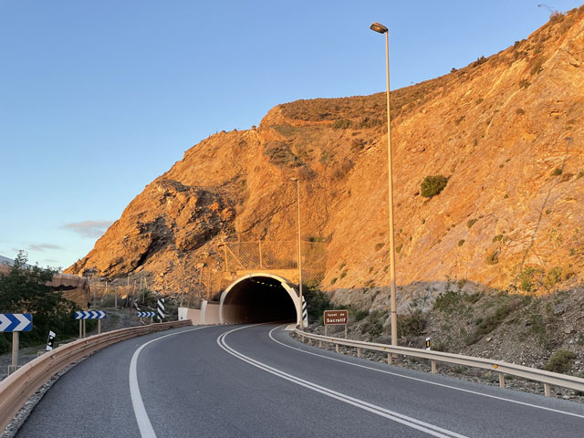 Zwischen Calahonda und dem Nachbarort Carchuna führt die N-340 schnurgerade durch eine fast lückenlos mit Folienzelten bestandene Ebene. Dazwischen finden sich nur mal große Gebäude landwirt-schaftlicher Kooperativen. Hier hat man gleich gesehen, dass nicht jedes Bäuerlein sein Zelt selbst gebaut hat, dann die sahen hier deutlich nobler, größer und stabiler aus, als die um El Ejido. Und die Kooperative scheint auch Müllcontainer auf dem Hof zu haben, denn hier lag kaum Abfall herum. Sicher müssen auch hier mal Planen ausgetauscht werden, aber die Firma, die das macht, nimmt offenbar die alten mit. Hier hat es Spaß gemacht, entlang der Zelte zu laufen, zumal zwischendurch mal ein paar Palmen gepflanzt wurden und einige Zelte kleine Vorgärten mit Sitzbänken fürs Personal haben. Wenn man über die Zelte hinweg in Richtung Sonne fotografiert, kann man kaum ausmachen, wo die Zelte aufhören und wo das Meer anfängt. Die Berghänge waren hier auch reichlich mit Zelten bestückt, aber nicht krumm und schief, sondern überwiegend auf künstlich angelegten Plateaus. Es war manchmal gar nicht auszumachen, ob es sich um dunkle Zelte, oder um Solarfelder handelt. Letztere sind hier aber völlig unüblich. Man hat wohl Angst, dass die bei der kräftigen Sonne durchbrennen. Atomstrom tut es auch und liegt seit Ende der 80er Jahre konstant bei über 20% der Stromproduktion. Hinter Carchuna führte die Straße wieder ein ganzes Stück hoch und um eine Felsnase herum. Von dort aus konnte ich wieder das ganze Tagesprogramm voraussehen, denn an der letzten sichtbaren Spitze beginnt Almuñécar, mein Tagesziel. Zunächst kam aber Torrenueva Costa, ein typischer Ort am Meer mit breitem Strand, Uferpromenade und einer mehrgeschossigen Bebauung. Dahinter führte die Straße ein Stück weg vom Wasser und wieder durch eine landwirtschaftlich genutzte Fläche, wo ich die ersten Äcker zu sehen bekommen habe, sogar einen Acker, auf dem Kaktus angebaut wird, der mit den großen Ohren. Ich weiß aber nicht wozu, vielleicht nimmt man die Stacheln als Zahnstocher. Die Straße führte dann auf Motril zu, eine Stadt, die überwiegend aus niedrigen Häusern besteht, die sich einen Berghang hochziehen. Mittendrin ragt mal ein klassischer, spitzer Kirchturm heraus, was ich in diesen Tagen zum ersten Mal gesehen habe. Auch so etwas wie eine Burg war zwischen den Häusern zu sehen. Ein anderer Teil der Stadt, El Varadero, liegt direkt am Wasser. Da gibt es einen richtigen Hafen, ein Industriegebiet und eine Uferpromenade. Um dort hin zu kommen, muss man kurz vor der Stadt an einem Straßenkreuz links abbiegen. Im Industriegebiet, das man noch vor dem Hafen erreicht, sind zwar viele Straßen eingezeichnet, aber nicht alle sind nutzbar, weil dort riesige, versandfertige Rotorblätter für Windkraftanlagen aufgestapelt sind. Wie die verladen werden, hätte ich ja zu gern gesehen. Im Hafen, den gerade ein Frachtschiff verlassen hatte, lag noch ein großes Fährschiff, an dem repariert wurde. Da gab es ein munteres Hämmern und Schleifen zu hören. Von hier fahren Fähren nach verschiedenen Orten in Nordafrika, unter anderem nach Tanger. Die bald hinter dem Hafen beginnende Uferpromenade zieht sich in einem weiten Bogen bis nach Playa Granada, einem jetzt fast ausge-storbenen Touristenort hin. Der Strand ist hier sehr breit und man ist gerade dabei, dort Furchen auszubaggern, in die vermutlich Palmen gesetzt werden sollen. Ein Stück weiter sieht man nämlich Reihen schattenspendender Palmen am Strand. Außerdem war direkt am Wasser ein Bagger dabei, Kies abzutragen und in monströse Mulden-kipper zu verladen, die unablässig dicht am Wasser über den Strand brausten, um zwei Kilometer weiter ihre Last abzukippen, weil dort den Strand breiter gemacht wird. Da man dort auch Buhnen ins Meer gebaut hat, geht es dabei wohl eher um Küstenschutz, als um ausgedehnte Badefreuden. Ein Stück kann man noch auf befestigten Wegen am Strand entlang laufen, den Rest der Strecke hätte man sich mit den Muldenkippern teilen müssen, was mir nicht so behagte, zumal nicht zu erkennen war, ob man die Flutrinne, auf die man zuläuft, überall passieren kann. Am Ende der Promenade hat man eine Siedlung inmitten eines Golfplatzes gesetzt oder umgekehrt, alle Freiflächen zwischen den Häusern zum Golfplatz gemacht. Da kreuzen laufend reife bis greise Damen und Herren mit Golfbesteck im Körbchen die Straße. Wer was auf sich hält, natürlich im Buggy. Wenn man die richtige Lücke in der Bepflanzung findet, kommt man wieder auf ein Terrain, auf dem Landwirtschaft betrieben wird. Hier aber überwiegend auf Freiflächen, wo zum Beispiel Salat angepflanzt wird. Interessiert habe ich da einem Traktor zugeschaut, der hinten eine Plattform hatten, auf der vier Frauen standen und winzige Salat-pflänzchen in Rohre fallen ließen, von denen sie maschinell im gleichmäßigen Abstand in die Erde gesetzt wurden. Zwei Männer liefen gebückt hinterher und haben ausgebessert, wenn mal ein Stück nicht ganz gelungen war. Hier habe ich auch die ersten kleinen Obstplantagen mit Kirschbäumen gesehen. Der Weg führte wieder direkt auf ein ausgetrocknetes, aber für den Ernstfall sehr breites und mit Mauern eingefasstes Flussbett. Der nicht vorhandene Fluss hat sogar einen Namen: Rio Guadalfeo. Dahinter kam auch schon der nächste Ort, Salobreña. Der besteht einerseits aus der üblichen Küstenbebauung mit Uferpromenade und breitem Strand und andererseits aus der auf einem Felsen gelegenen Altstadt inklusive Festung. Die Außenwände der Häuser und die Festungsmauern sind da eins mit der steil aufragenden Felswand. Das sah sehr spektakulär aus und war Anlass für viele Fotos aus allen möglichen Blickwinkeln. Allein das Trägheitsprinzip hat mich davon abgehalten, dort hoch-zusteigen und mir das Ganze aus der anderen Richtung anzuschauen. An der Uferpromenade ist zwar Restaurant an Restaurant, aber viele davon haben im Winter geschlossen. Ganz am Ende 