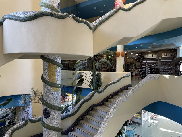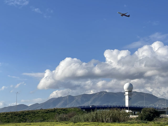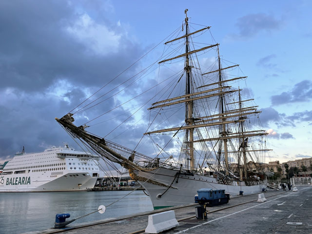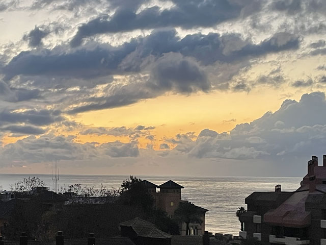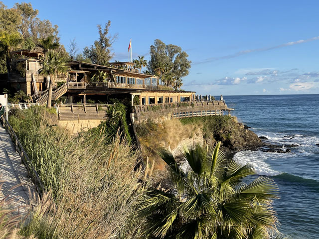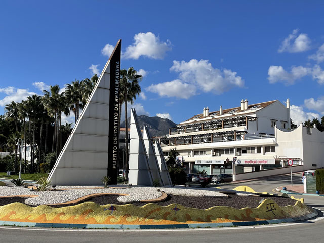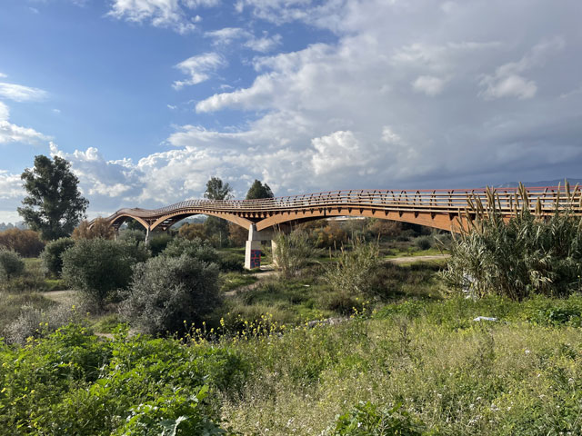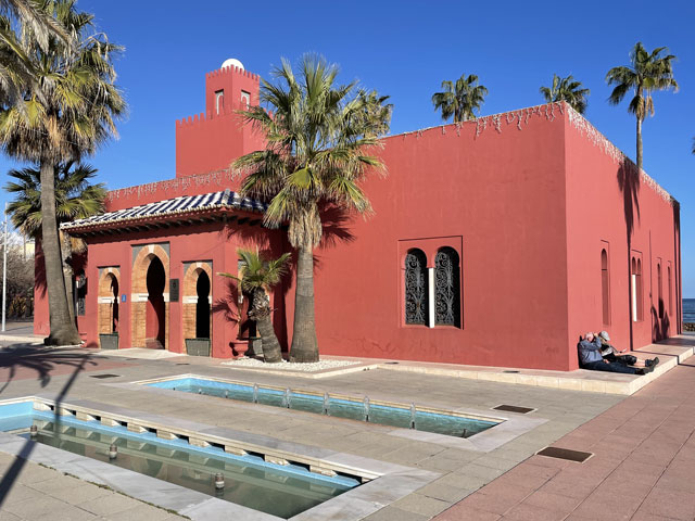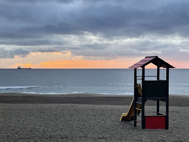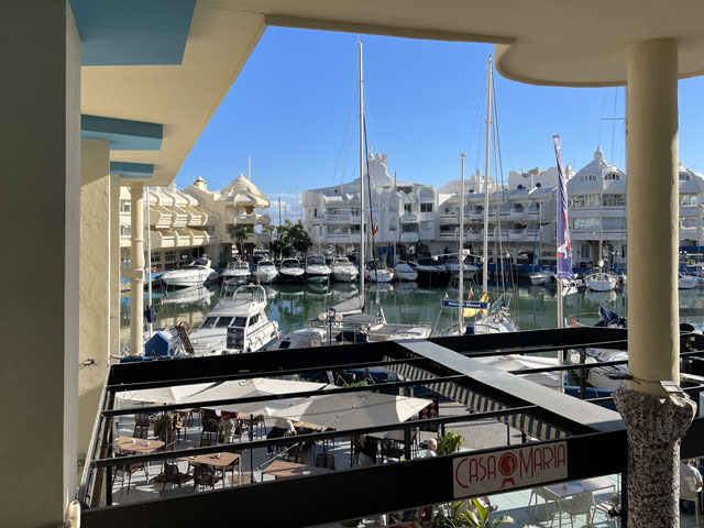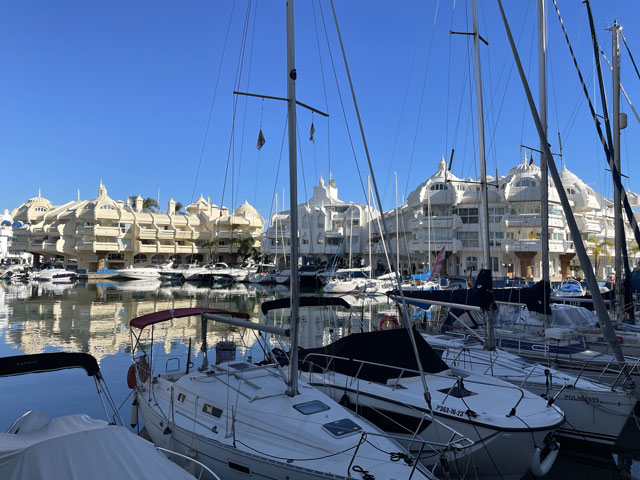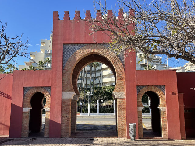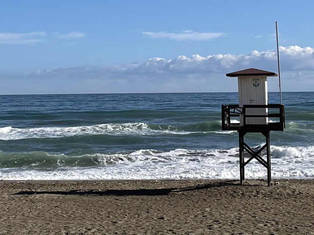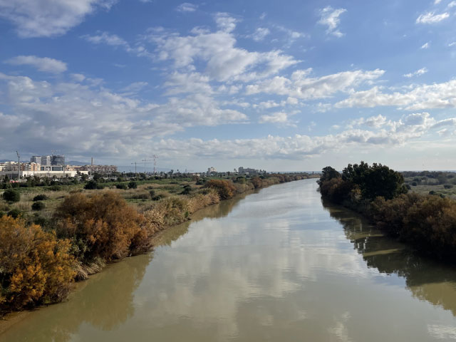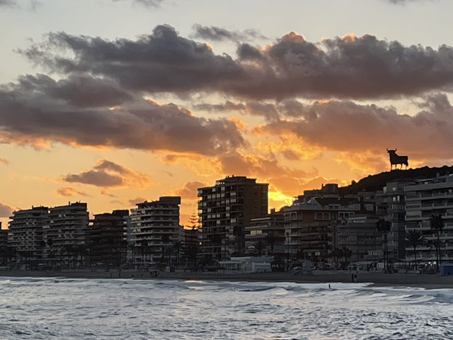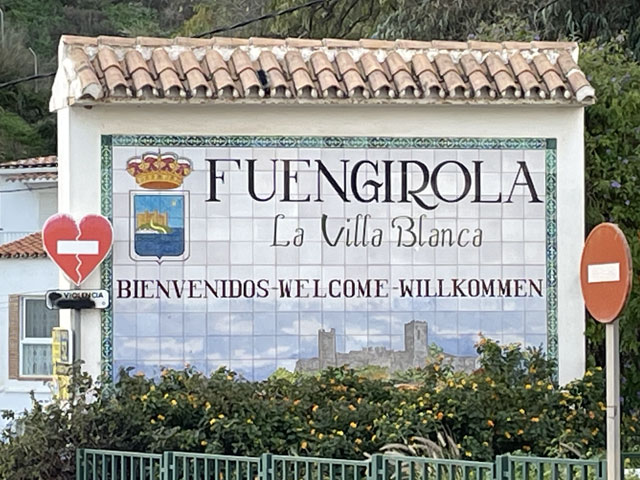 Ich habe gestern abend in der Herberge Joho, einem jungen Finnen, davon erzählt. Der ist für eine Woche nach Málaga geflogen, hat sich hier ein Rad ausgeliehen und Touren durch die Umgebung von Málaga gemacht, immer etwa 120 km am Tag, wie er mir stolz erzählt und auf dem Laptop gezeigt hat. Der hatte von dem Unfall nichts mitbekommen und ist gleich zusammengezuckt, weil er an der Stelle jeden Tag vorbeigekommen ist und gut hätte von dem Auto getroffen werden können. Ich bin auf der Promenade wieder bis zum Hafen gelaufen, hab’ mir dieses Mal das in Kopenhagen zugelassene Segelschiff „Danmark“ etwas genauer angeschaut und bin dann entlang des Hafengeländes weiter in Richtung Flughafen marschiert. Am Himmel hingen dunkle Wolken, während die Wetter-App nur Sonnen zu bieten hatte. Dann fing es leider an zu regnen. Nicht stark, aber doch so, dass man sich lieber unterstellt, wenn man keine Eile hat. Da ich zeitig aufgebrochen bin und heute nicht so übermäßig viel auf dem Programm stand, habe ich mich hinter dem Hafengelände unter dem Vordach einer der vielen Restaurants am Strand untergestellt. Richtig geöffnet war das Restaurant noch nicht, aber es saßen schon ein paar Männer mit Kaffeetassen drin. Da im Sitzen und mit einem Kaffee in der Hand das Ende des Regens viel besser abgewartet werden kann, bin ich nach einer Weile auch rein - und gleich wieder raus, weil da noch der Fischgeruch vom Vorabend durch den Raum waberte. Wer schon morgens ein Dutzend Sardinen reinschieben will, wird sich daran nicht stören, aber zum Kaffee hätte der Geruch wirklich nicht gepasst. Also habe ich weiter draußen abwechselnd auf die nasse Straße und auf die in der Wetter-App unter „jetzt“ gezeigte Sonne geschaut. Nach einer halben Stunde war das feuchte Intermezzo vorbei und die Wolkendecke riss langsam auf. Für den Rest des Tages hatte ich dann das gewohnt schöne Wetter bei fast wolkenfreiem Himmel. Neu war allerdings der Wellengang, den es heute gab. Die Wellen schlugen mit Wucht ans Ufer und es waren immer so zwei, drei Wellen mit Schaumkrone hintereinander zu sehen. Und wenn man den Strand entlang geschaut hat, dann konnte man die feinen Nebenschwaden sehen, die das ausgelöst hat. Besonders windig war es nicht. Ich weiß also nicht, ob das wetterbedingt war, oder ob das hier generell eine Ecke mit starkem Wellengang ist. Ein paar Wellenreiter haben das gewusst oder geahnt und haben sich rausgewagt. Nach einer Weile hatte ich den Rio Guadalhorce erreicht, der die Stadt vom Flughafen trennt. Als ich im November eines Mittags in Málaga gelandet und mit dem Bus weiter nach La Línea gefahren bin, kamen in der Wetter-App für diese Region schwere Unwetterwarnungen und es wurde speziell vor Überschwemmungen entlang des Rio Guadalhorce gewarnt. Und tatsächlich habe ich später im Fernseher Bilder von weggeschwemmten Autos gesehen, wie sie Tage zuvor in allen Nachrichten aus Valencia gezeigt wurden. Nun war ich gespannt, den Fluss im Ruhezustand zu sehen. Zunächst ging es über einen vielleicht drei Meter breiten Graben, der in der Karte zwar als zeitweise ausgetrocknet eingezeichnet war, aber doch ganz gut Wasser führte. Ob das eine Folge des Regens in der Nacht und am Vormittag war, weiß ich nicht. Aber da es dem Anschein nach in den noch von dicken Wolken eingehüllten Bergen immer noch regnete, kann das gut sein. Hinter dem Graben ging es ein Stück auf einem Deich landeinwärts bis zu einer mit ihrer Wellenform sehr originellen Fußgängerbrücke, die sich parallel zur Autobahn über die beiden Arme des Rio Guadalhorce bis zum gegenüber liegenden Damm spannt. Beide Flussarme führten ganz gut Wasser, aber den breiten Überflutungsflächen zwischen den Deichen war nicht anzusehen, dass da in jüngster Zeit Wasser gestanden hat. Hinter der Brücke ging es vorbei an einer Ferienhaussiedlung und an einem Golfplatz. Dann konnte man sich an einem Kreisverkehr ent-scheiden, ob man weiter entlang der Autobahn, zum Strand oder unter der Autobahn durch zum Flughafen laufen will. Die gut frequentierten Startbahnen des Flughafens enden nämlich nur wenige hundert Meter entfernt auf der rechten Seite. Ich bin runter zum Strand und dort auf eine Baustelle getroffen. Das war auf viele Kilometer die letzte noch nicht bebaute Stelle am Wasser. Danach ging es recht eintönig weiter: breite Strandpromenade, links am Strand alle hundert Meter ein Pavillon mit einer Gaststätte drin, rechts ein Hotel nach dem anderen und davor fast lückenlos Flachbauten mit Gaststätten, Geschäften usw. Hier war auf der Promenade sowie in und vor allem vor den Gaststätten viel Betrieb. Die Hotels in Torremolinos scheinen also auch im Winter gut gebucht zu sein. Mehr als die Promenade auf und ab zu laufen und dabei wiederholt einzukehren, kann man hier aber nicht machen. Man kann höchstens noch bei einem der meist schwarzen Händler Nachahmungen von Marken-Taschen, -Schuhen und T-Shirts kaufen, die auf dem Gehweg ausgebreitet sind. (Diese Kombination von Ware und Verkäufer nennt man landläufig „Schwarzhandel“.) Im nächsten Ort, Arroyo de la Miel Benamaldena Costa, dessen Küsten-streifen auch nur für Touristen gedacht ist, war bei weitem nicht so viel Betrieb, obwohl man sich da mit der Bebauung richtig Mühe gegeben und zum Beispiel um einen künstlichen Sportboothafen originelle Häuser mit Ferienwohnungen, ein Einkaufscenter und diverse Gaststätten angelegt hat. Vom Baustil her nicht jedermanns Geschmack, aber halt mal was anderes. Noch im Ort ging es vom Strand weg auf die nach Fuengirola führende Straße. Die zieht sich durch die folgenden, fast lückenlos aneinander gereihten Ortschaften. Da ist es ziemlich schwer, sich mal zu erleichtern, wenn die Blase drückt. An einer unbebauten Stelle, hinter einer Kurve und ohne Publikum auf dem Gehweg habe ich dann in einem Gebüsch das erledigt, was jeder Hund an jedem Baum darf. In diesem Moment fährt doch auf der anderen Fahrbahn hupend ein Pol