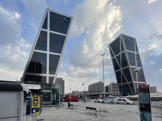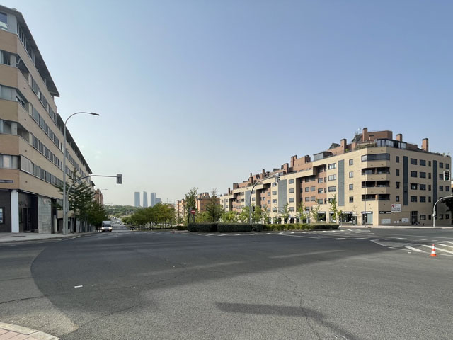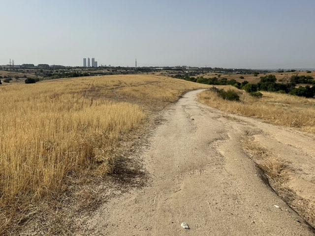 Der Weg führte zunächst durch eine typische Hauptverkehrsstraße mit vielen Geschäften, die morgens aber noch alle zu waren. Die Straße verläuft zwar ziemlich geradeaus, ändert aber auf der Hälfte ihren Namen von „Calle de San Bernardo“ in „Calle de Bravo Murillo“. Ihr Endpunkt ist der „Plaza de Castilla“, der von den beiden schräg stehenden Bank- bzw. Versicherungsgebäuden flankiert wird. Da geht es nach links (Norden) vorbei an einer ganzen Reihe an Wolkenkratzern bis zur Autobahn (Autovia de Colmenar) und dahinter, der Autobahn folgend, zunächst nach Westen und dann wieder nach Norden bis zum Stadtrand hinter dem Friedhof von Fuencarral. Die mehrstöckige Wohnbebauung ist dort auf einen Schlag zu Ende. Ohne jeden Übergang durch kleinteilige Bebauung steht man nach dem Unterqueren einer weiteren Autobahn (M40) plötzlich in einer endlos erscheinenden Steppenlandschaft.