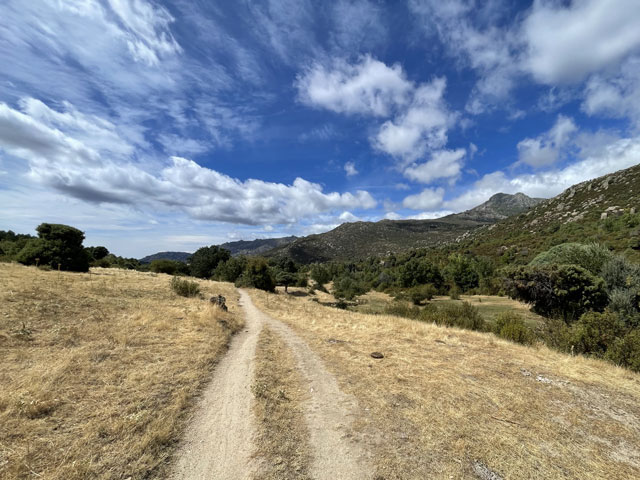 Den ganzen Tag ging es an der Südflanke einer Bergkette entlang, über der morgens noch dunkle Wolken standen. Aber wie versprochen gab es keinen Regen. Temperaturen knapp über 20 Grad und ein frischer Wind ergaben zumindest vormittags ein hervorragendes Wanderwetter. Am Nachmittag waren zwar die dicken Wolken verschwunden, aber ein interessanter Mix aus Schleier- und Häufchenwolken (Cirrus- und Cumulus-Wolken) haben auch am Nachmittag dafür gesorgt, dass die Sonne nicht zu sehr brennt.