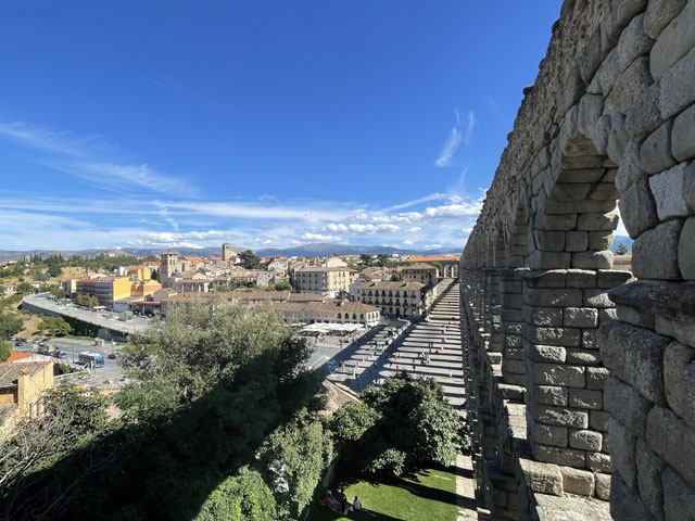 Etwas erholt ging es nach einer halben Stunde weiter in die Innenstadt, wo ein riesiges, aus Steinquadern gefügtes Aquädukt über den Marktplatz verläuft und auf der anderen Seite auf dem Hügel mit der Altstadt verschwindet. Auf dem Platz und in den dorthin führenden netten Gassen wimmelte es an Menschen. Es war schließlich Sonnabend. Alle hatten eine Wasserflasche unterm Arm und die Kamera im Anschlag. Auf der Treppe, die neben dem Aquädukt hoch in die Altstadt führt, war kaum ein Durchkommen, weil da so viele Leute Selfies machen wollten, was mit einem solchen riesigen Bauwerk im Hintergrund gar nicht so einfach ist.
