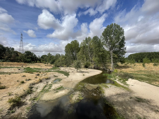 Dann ging es mit der Landschaft so weiter. Da wird man wirklich nicht abgelenkt. Allerdings ging es auch mal mehrere Kilometer ganz glatt auf einem Radweg entlang des kanalisierten Río Eresma, der hinter einer wilden Hecke kaum auszumachen war. Vielleicht war ich aber auch durch die vielen Brombeeren abgelenkt, die alle verkostet werden wollten. Hinter dem Flüsschen waren große Baumplantagen. Da waren Pappeln (?) so in Reih und Glied angepflanzt, so dass man sie leicht ernten kann. Da alle Bäume gleich hoch waren, sah es aus, als hätte sich da gerade einer mit der Heckenschere ausgetobt.
