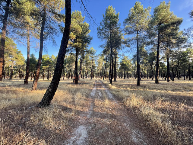 Hinter Nava de la Asunción ging es wieder ein Stück über Feldwege und dann erneut durch den üblichen Kiefernwald. Da hat es Spaß gemacht zu laufen und die angezapften Bäume boten immer wieder andere Ansichten.