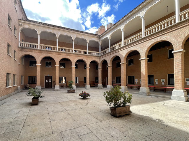Ich habe mir zwar alle Räume angeschaut, es aber dabei nicht übertrieben, da ich ja noch etwas Programm vor mir hatte. In die Burg hat man, von außen nicht sichtbar, in den 1950er Jahren ein Gebäude mit einem großen Patio (Innenhof) reingesetzt, das dem ehemaligen Pallas ähneln soll und jetzt irgendwelche Kultur-Büros beherbergt. Da bin ich vor dem Verlassen der Burg noch mal auf „Caballeros“, weil ich ein bestimmtes, dringendes Bedürfnis verspürte. Aber: kein Papier, auch nicht bei den „Señoras“. Im Vorraum hing allerdings eine Plastikhülle an der Wand, in der die Blätter stecken, auf denen die Klo-Putzer immer quittieren, wann sie fleißig waren. Da waren auch noch ein paar Blanko-Blätter und ich habe mir gedacht, wenn die kein Klopapier nachladen, brauchen sie auch nicht eintragen, dass sie da waren. Ich bin also mit ein paar solchen Blättern rein ins Keramikkabinett und habe diese dort während des Geschäfts wiederholt so geknüllt, dass sie für den angedachten Zweck verwertbar wurden. Das war nämlich besonders gutes und dickes Papier, fast dem Zeichenkarton gleich. Unbearbeitet könnte das beim Putzen ziemlich wehtun. Aber alles hat geklappt und ich bin heil vom Klo runter.