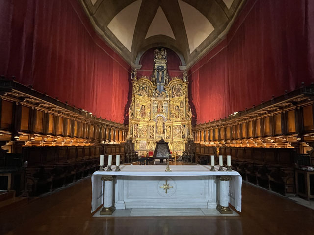 Von den Kirchen hatten erwartungsgemäß nur wenige geöffnet, darunter aber die Kathedrale, die sich innen ganz düster zeigt und mit dicken, eckigen Säulen aufwartet. Die war mal als großer, rechteckiger Bau mit flachen Türmen an den Ecken geplant. Davon ist aber nur die Hälfte gebaut worden und der hintere, nicht fertig gewordene Teil sieht aus wie eingestürzt. Drinnen besticht aber der Hauptaltar mit Chorgestühl auf beiden Seiten. Richtig zu sehen bekommt man das aber erst, wenn man einen Euro in den Beleuchtungsautomaten wirft. Einige Seitenkapellen sind mit üppig vergoldeten Altären bestückt, andere werden als Rumpelkammer benutzt. Hunderte Klappstühle, die vermutlich bei Konzerten oder an Feiertagen zum Einsatz kommen, sind im hinteren Teil der Kathedrale eher auf einen Haufen geworfen, als gestapelt worden. Schade, denn bei einer Kathedrale, das heißt bei einer Bischofskirche, erwarte ich immer etwas Erhabenes und besonders Eindrucksvolles.