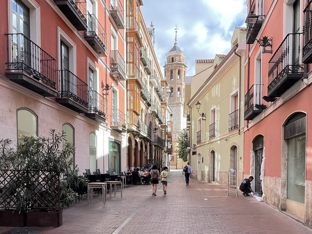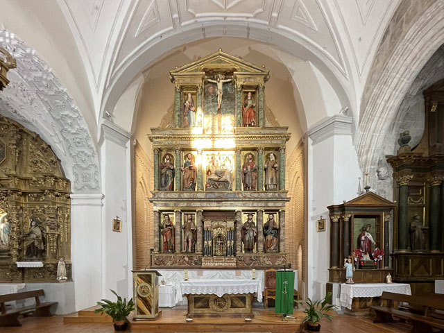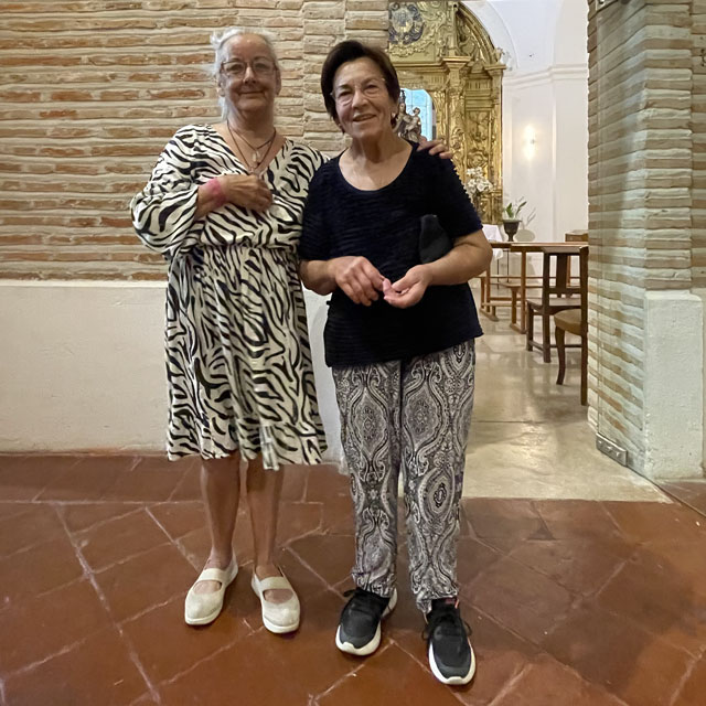 Der andere Turm gehört zur wuchtigen Santiago-Kirche, die erhöht mitten im Zentrum steht. Als ich an der Tür gelesen habe, dass die Kirche mittags und am Abend bis um acht offen hatte, habe ich mich geärgert, denn inzwischen war es viertel neun. In einer kleinen, unscheinbaren Kapelle gegenüber waren gerade zwei ältere Damen beim Putzen. Die habe ich gefragt und nach kurzer Beratung schnappte sich eine einen riesigen Schlüssel, hat mir die Kirche aufgeschlossen und sämtliches Licht eingeschaltet. Kurz darauf kam auch die andere Dame und hat mir im fließenden Spanisch alles erklärt. Da gab es auch wirklich viel zu sehen, vor allem auf dem großen, frei stehenden Altarretabel, das gerade für 70.000 Euro restauriert wurde, wie ein Poster am Kircheneingang verkündet hat. In der Apsis hinter dem Retabel waren noch alte Malereien an den Wänden. Jakobus fand sich gleich zweimal auf dem Retabel, an einem Seitenaltar stand St. Rochus und an einem anderen Franz Xavier im Pilgerkostüm, was ich wirklich aus der spanischen Erklärung herausgehört habe! Als ich die beiden netten Damen fotografieren wollte, haben sie sich erst geniert, weil das Bild doch dann in Deutschland zu sehen ist. Dann haben sie sich aber bereitwillig postiert. Diese eindrucksvolle Kirche und die netten Damen waren ein gelungener Tagesabschluss.