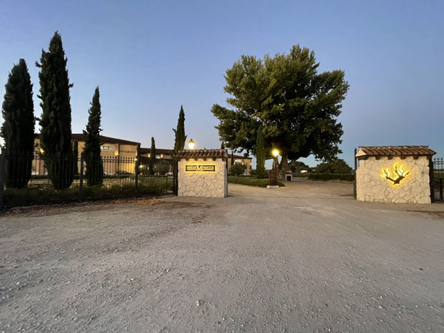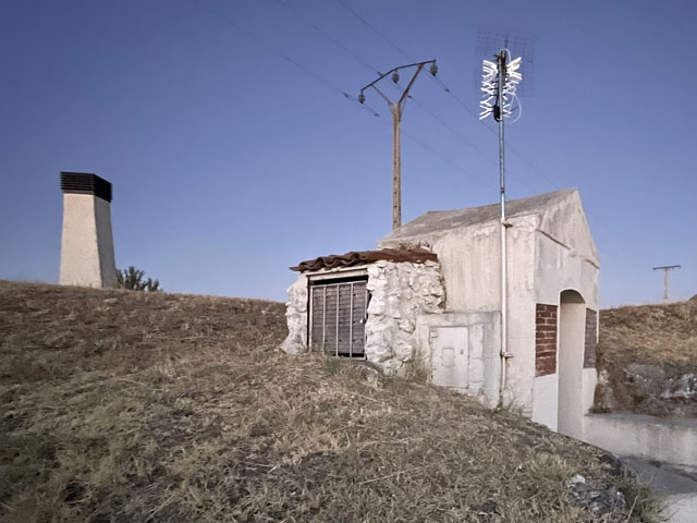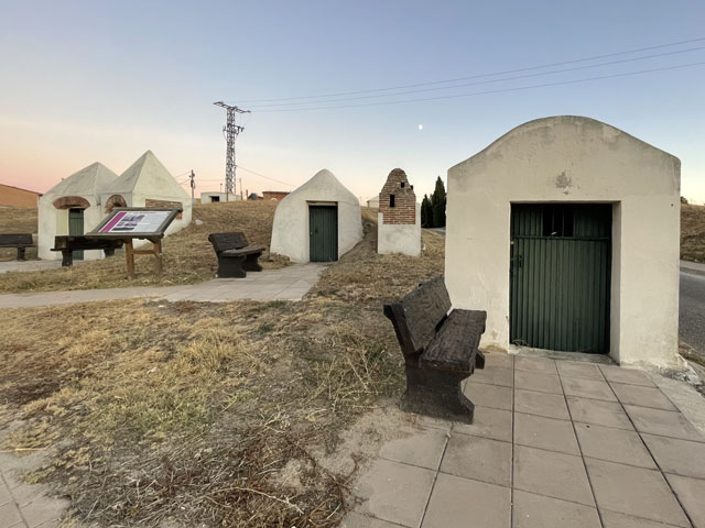Gleich hinter der Herberge haben wir bestaunt, was ich gestern Abend schon entdeckt habe. Da sind lauter Erdhügel, jeder mit einem strahlend weißen „Häuschen“ dran, kaum größer als eine Telefonzelle. Manche mit flachen, andere mit runden oder gar pyramidenförmigen Dächern. Das sind die Eingänge zu unterirdischen Weinkellern, sogenannten Bodeguillas, wo das Wort „Bodega“ rausklingt.