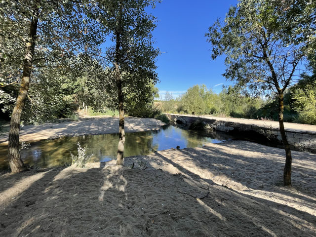 Puente Duero heißt so viel wie „Duero-Brücke“. Ob das zusammen oder getrennt geschrieben wird, hängt von der Farbe des Schildes ab. Auf schwarz umrandeten Schildern wird es zusammengeschrieben, auf rot umrandeten und in der Karte hingegen getrennt. Der Duero ist übrigens jener Fluss, der weiter westlich auf vielen Kilometern die Grenze zu Portugal bildet und später als Río Douro durch Porto fließt und in den Atlantik mündet. Den habe ich auf meinen Pilgertouren schon wiederholt überquert, unter anderem in Zamora auf der Via de la Plata.