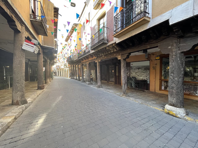 Hinter der gewaltigen Santiago-Kirche, die natürlich verschlossen war, bin ich auf die historische Hauptstraße der Stadt gestoßen, die auf beiden Seiten von Arkaden gesäumt ist. Das heißt, die Obergeschosse aller Häuser stehen auf Säulen direkt am Straßenrand. Das waren aber im seltensten Fall stabile Steinsäulen, sondern meist ziemlich verwitterte und schon geschrumpfte Holzpfosten. Da gab es also nicht mehr viele gerade Wände und Böden. Aber alle Häuser schienen bewohnt zu sein und von den Geschäften unter den Arkaden stand kaum eins leer. Man hätte da also wunderbar auf beiden Seiten der Straße unter den Arkaden bummeln können. Viele Geschäfte hatten zudem einheitliche, farbige Holzkisten an oder über der Tür zu hängen, aus denen ersichtlich war, was es drinnen gibt. Eine Kiste war voller Bücher, eine andere bestückt mit Schuhkartons und beim Friseur schauten Fön und Lockenwickler raus.