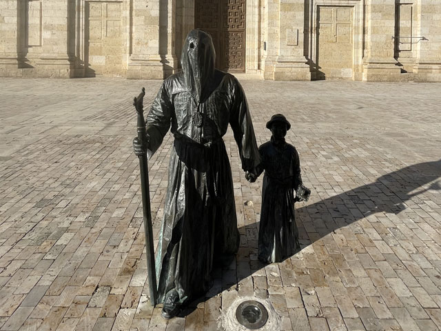 Ich bin die Hauptstraße wenigstens einmal auf und ab gelaufen und dabei auf eine große Kirche gestoßen, in der sich ein Semana-Santa-Museum befindet, dass mich sehr interessiert hätte, aber noch geschlossen war. Die „Semana Santa“ ist die „Heilige Woche“ vor Ostern, wo überall im Land Prozessionen stattfinden, bei denen „Kapuzenmänner“ Heiligenfiguren durch die Stadt tragen. Je größer und schwerer die Figuren oder ganzen Figurengruppen sind und je mehr Träger dafür benötigt werden, desto größer ist die Ehre für die Stadt und den ausrichtenden Verein. In Santiago habe ich mal fast die ganze Osterwoche mitgemacht, wo es bis zu vier Prozessionen am Tag gab, veranstaltet von verschiedenen, eigens dafür gegründeten Vereinen mit entsprechenden „Vereinsfarben“ der Gewänder und Kapuzen. Die Prozessionen werden stets von Musikkapellen begleitet und mittendrin laufen die kirchlichen und kommunalen Würdenträger.