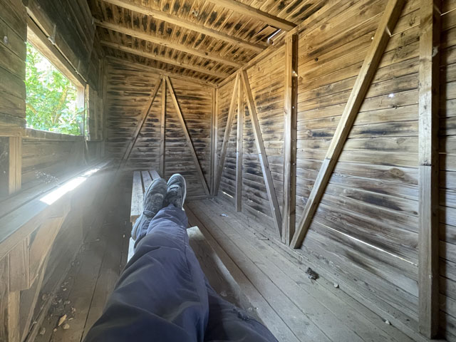 Da es inzwischen recht warm und sonnig war, gestaltete sich der restliche Weg als ziemlich anstrengend. Da hat mich ein auf Stelzen gebautes Vogelbeobachtungshaus mit zwei langen Bänken drin schnell zu einem Mittagsschlaf verleitet, zumal es da drinnen angenehm kühl war. Aber der Gedanke daran, dass es im Laufe des Nachmittags immer wärmer wird, hat mich schnell wieder aufgeschreckt und weiterlaufen lassen.