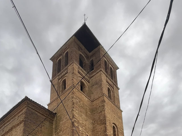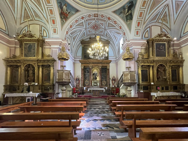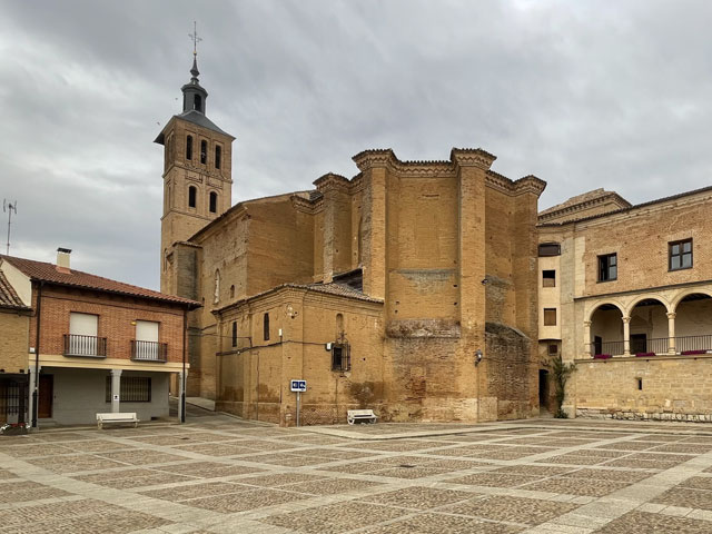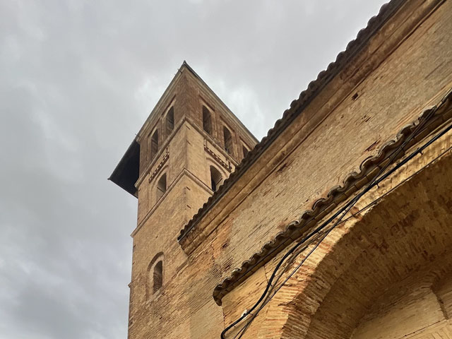 Gleich angrenzend an den Palacio befindet sich eine der Kirchen des Ortes, die aus bestimmten Blickwinkeln aussieht, als hätten sich da Turmbauer und Dachdecker nicht abgestimmt. Es sieht nämlich aus, als säße eine quadratische Haube auf einem rechteckigen Turm. Beim Näherkommen sieht man dann, dass der Turm einen L-förmigen Grundriss hat und das Dach der Einfachheit halber den fehlenden Quadranten mit überdeckt.