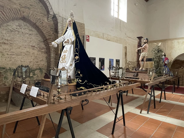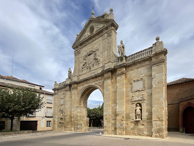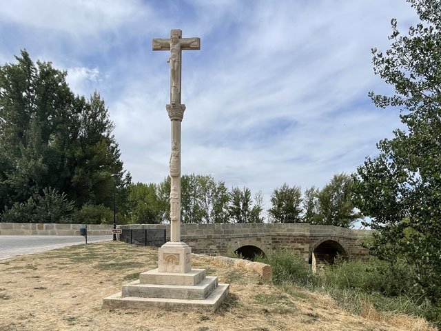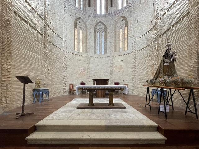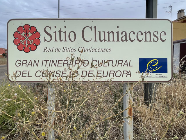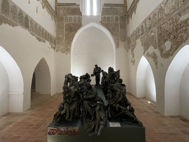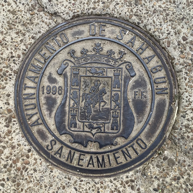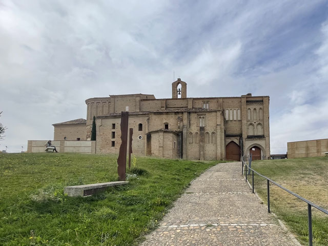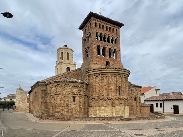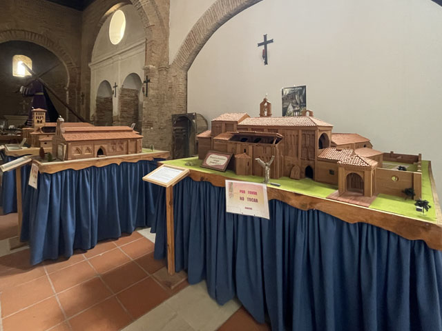 Kurz nach elf war ich bereits in Sahagun und damit auf dem Camino Francés, den ich im Frühjahr 2022 gelaufen bin. In der Stadt, die genau auf der Mitte des Camino Francés (gerechnet ab Roncesvalles) liegt, habe ich viel wiedererkannt, vor allem die eindrucksvollen Backsteinkirchen mit ihren wuchtigen, quaderförmigen Türmen, die durch unzählige Rundbogenfenster durchbrochen werden. Drei Stück gibt es davon. In einer (Iglesia de la Trinidad) ist jetzt ein Konzertsaal und auf einer eingezogenen Zwischendecke eine Herberge. In einer anderen (Iglesia de San Tirso) ist ein Museum, in dem es unter anderem um die „Semana Santa“ geht. Da gibt es also einige Figuren zu sehen, die in der Osterwoche durch die Gegend geschleppt werden. Außerdem stehen da Modelle der wichtigsten Kirchen der Stadt. Davon gibt es nämlich weit mehr als die drei genannten. Die Gottesdienste waren leider überall schon vorbei. In einer ganz unscheinbaren kleinen Kirche, deren Tür offen stand, kam mir gleich jemand hinterhergestürzt, der die Altarbeleuchtung eingeschaltet hat. Da gab es nämlich ein sehr prächtiges barockes Retabel zu sehen.
