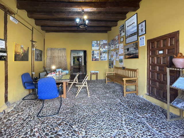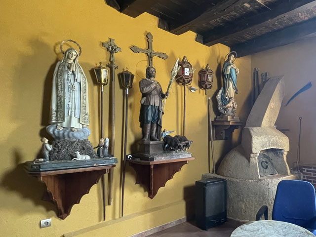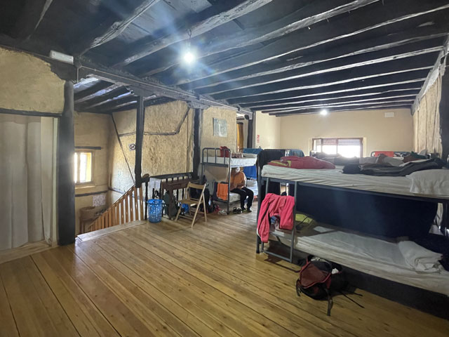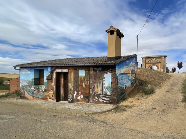 Da ich vor drei Jahren erstere gewählt und in El Burgo Raneo übernachtet habe, hätte ich nun eigentlich die Alternative genommen. Aber die erwählte Herberge hat es mir angetan und deshalb habe ich mich auf den gleichen Weg begeben wie einst. Es sieht hier eh überall ziemlich gleich aus. Erkannt habe ich nur die Riesenherberge am Ortseingang von Bercianos, die mich schon vor drei Jahren abgeschreckt hat. Mit meiner Herberge bin ich hingegen zufrieden. Die ist wirklich urig und ich habe dort sogar noch ein unteres Bett bekommen. Insgesamt habe ich 36 Betten in drei Räumen gezählt. Ein Raum ist noch leer und in den anderen sind noch obere Betten frei. Insgesamt sind also etwa 20 Betten belegt. Kennengelernt habe ich bisher nur zwei Spanierinnen, zwei junge Bulgarinnen und einen Pilger aus Münster, der vor 12 Jahren schon mal hier war und zu erzählen wusste, dass einige Einrichtungsgegenstände der Herberge aus der einst gegenüber stehenden Kirche stammen, die eingestürzt ist, weil man ringsum Weinkeller (Bodegas) in die Erde gegraben hat.