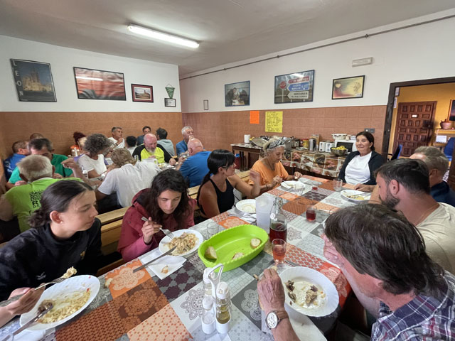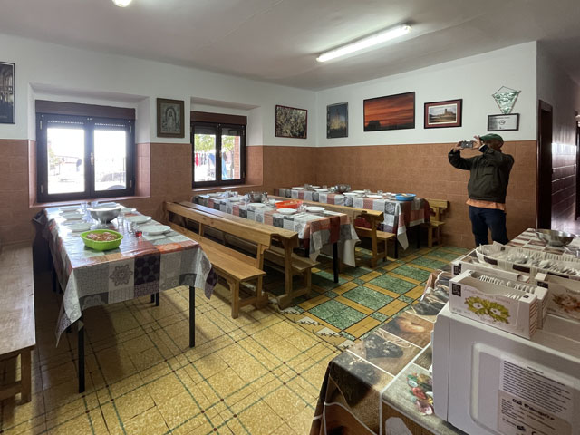 Damit ich nicht aus dem Tritt komme, bin ich auch heute nach einem kurzen Erschöpfungsschlaf in die nächstgelegene Bar gegangen, um dort eine Erfrischung zu mir zu nehmen. Als ich wieder aufbrechen wollte, kam Peter, der Münsteraner, und hat mich mit an den Tisch genommen, an dem seine Camino-Freunde saßen: zwei Spanier, von denen der ältere als LKW-Fahrer oft in Deutschland unterwegs ist und der auch schon am Berlin-Marathon teilgenommen hat; eine junge Spanierin, die Peter im vorigen Jahr auf dem Camino de Inverno kennengelernt und jetzt wiedergetroffen hat; außerdem ein Italiener, der in Stuttgart lebt und deshalb ganz gut Deutsch spricht. Das war eine ganz lustige Runde. Um halb sieben sind wir dann aber aufgebrochen, weil für 19 Uhr in der Herberge Abendbrot angesagt war. Das hat sich zwar etwa verzögert, aber dann erscholl die Glocke auf dem Flur und alle stürmten in den Essenraum und verteilten sich auf drei gedeckte Tische. Die dazugehörigen Bänke stammen übrigens auch aus der 1998 eingestürzten Dorfkirche.