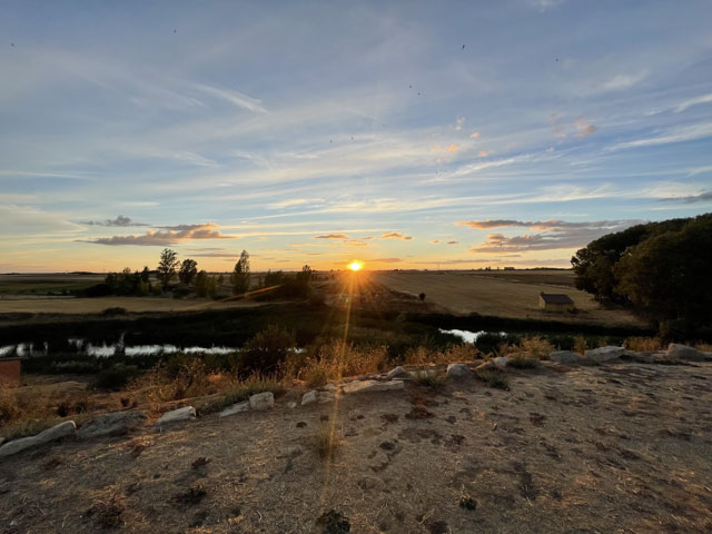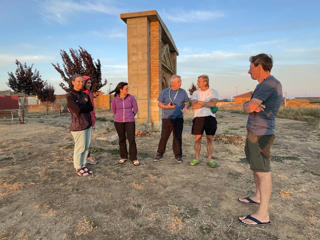 Die Hospitaleros sind hier nicht nur sehr nett, sondern auch sehr fleißig und haben zusammen mit ein paar helfenden Händen ein leckeres Abendbrot bereitet: Salat mit viel Paprika und eine Paella (Reis) mit Geflügel. Dazu Rotwein und hinterher einen Apfel. Da es viel Nachschlag gab, sind sicher alle satt geworden. Hinterher ist noch einer der Hospitaleros mit allen Interessierten auf den Hügel gestiegen, auf dem einst die Kirche stand, weil man von dort gut den Sonnenuntergang sehen kann. Der war auch wirklich schön, aber besonders beeindruckend waren die vielen Schwalben, die wie wild am Himmel kreisten, weil zu dieser Zeit wohl besonders viele Insekten über der kleinen Lagune am Fuß des Hügels unterwegs sind. Mir ist es sehr recht, wenn die Schwalben sämtliche Fliegen und Mücken fressen, die einen den ganzen Tag nerven.
