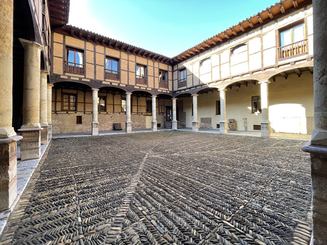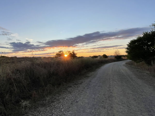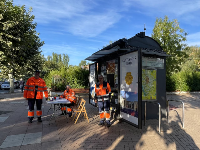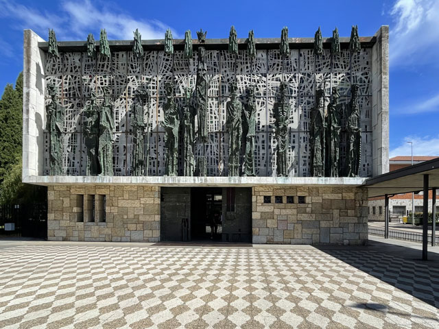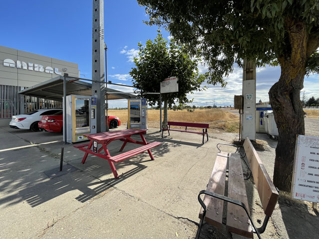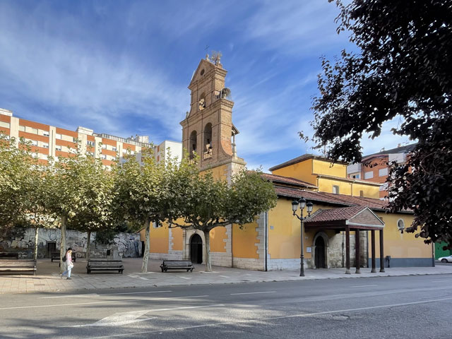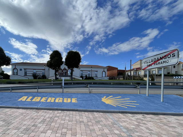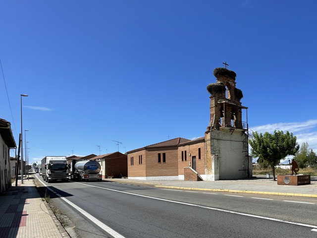 In La Virgen del Camino, wo es eine sehr sehenswerte, aber heute leide geschlossene, moderne Kirche gibt, gabelt sich der Camino. Der originale Weg verläuft entlang der Fernstraße N-120, der andere ein ganzes Stück südlich davon entlang kleiner Landstraßen. Ich habe mich wegen der etwas kürzeren Länge und dem zu meinen Plänen besser passenderen Herbergsangebot für die erste Variante entschieden. Ich hätte mal meine eigenen Pilgerberichte vom Frühjahr 2022 lesen sollen. Da habe ich schon über den Verkehr auf der N-120 gestöhnt und den ohrenbetäubenden Lärm beklagt. Den hatte ich heute wieder. Der andere, von Gronze ausdrücklich empfohlene Weg wäre bestimmt besser gewesen. Da hätte ich auch ein Stück mit der netten, jungen amerikanischen Lehrerin namens Taylor laufen können, die ich kurz vor der Weggabelung getroffen habe. Aber dann wäre ich wahrscheinlich noch schneller k.o. gewesen, denn die ist erst in León gestartet und hatte noch einen flotten Schritt drauf.