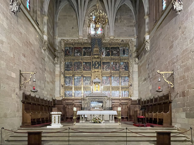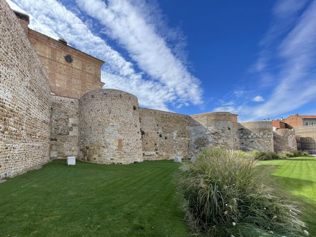 Ich bin heute auf den ausgeschilderten Weg direkt bis zur Kathedrale und habe mich dort umgesehen, auch hinter der Kathedrale, wo es noch reichlich Stadtmauer gibt. In der Kathedrale drinnen war ich dieses Mal nicht, das hatte ich damals. Irgendwann kann man die Kathedralen eh nicht mehr auseinander halten. Bei einem Picknick in einer Parkanlage habe ich leider erst zu spät bemerkt, dass sich zwei Getränkedosen in meinem Rucksack mit ihren Verschlüssen verhakt hatten. Als ich die eine Dose herausgezerrt habe, habe ich zugleich die zweite geöffnet, deren Inhalt sich daraufhin im Rucksack verteilt hat. Da musste ich schnell umpacken und den normalerweise ganz unten im Rucksack befindlichen Schlafsack außen anbinden, damit der nicht nass wird bzw. die schon nasse Stelle trocknen kann.