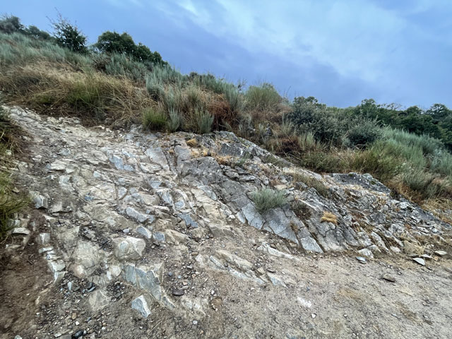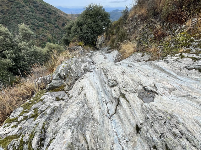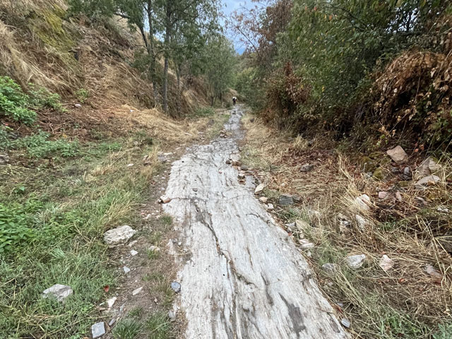 Hinter dem Ort bin ich mangels Tageslicht noch eine Weile auf der Straße geblieben, statt den dicht daneben verlaufenden Weg zu benutzen. Später bin ich dann auf den Weg gewechselt, um nicht als Schummler zu erscheinen. Und der Weg war mindestens so schlimm, wie ich gedacht hatte: lauter Felsbuckel, auf denen man sehr vorsichtig daherschreiten musste. Zum Glück waren die Felsbuckel nicht nass, sonst wäre das eine ordentliche Rutschpartie geworden. Da der Weg gegenüber der Straße doch eine ziemliche Abkürzung darstellte, bin ich auch den Rest der Strecke bis Molinaseca auf dem Weg geblieben, wohlwissend, dass der doppelt so steil sein muss wie die Straße, wenn er nur halb so lang ist.