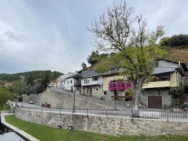 Da das Tal, in dem ich mich nun befand, voller Wolken war, ist es dort nur ganz langsam hell geworden. So habe ich von dem hübschen kleinen Dorf El Acebo mit seinen dunklen Natursteinhäusern nicht so viel zu sehen bekommen. Die betonierte und gegen Sturzfluten mit schrägen Rinnen versehene Dorfstraße verläuft im leichten Zick-Zack, weil früher niemand auf die Idee gekommen ist, die Häuser in einer Flucht zu bauen. Damit da kein dicker Laster klemmen bleibt, stehen am Ortseingang Schilder, dass nur Fahrzeuge bis 3,50 Meter Breite und maximal 15 Meter Länge passieren dürfen.