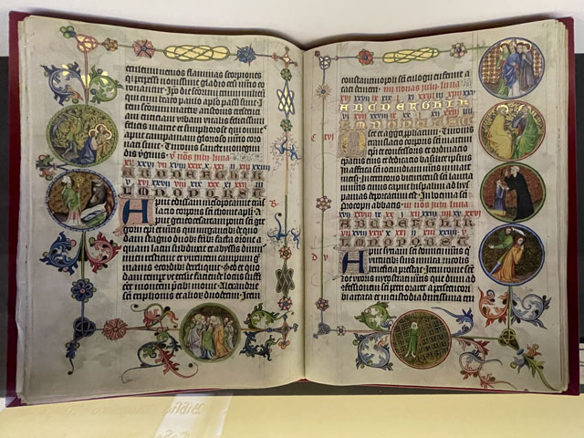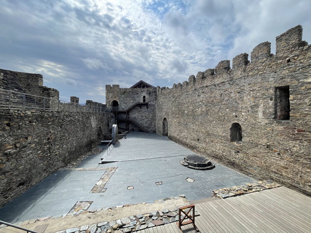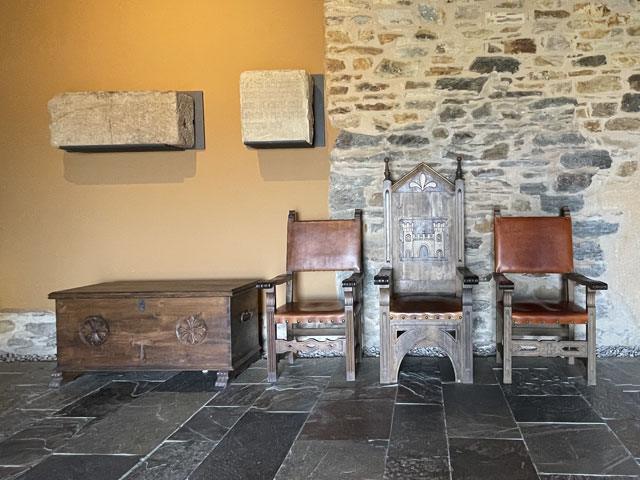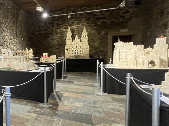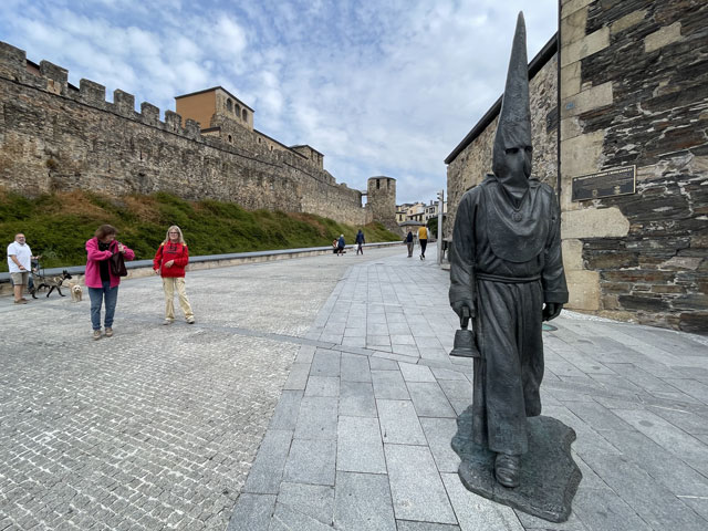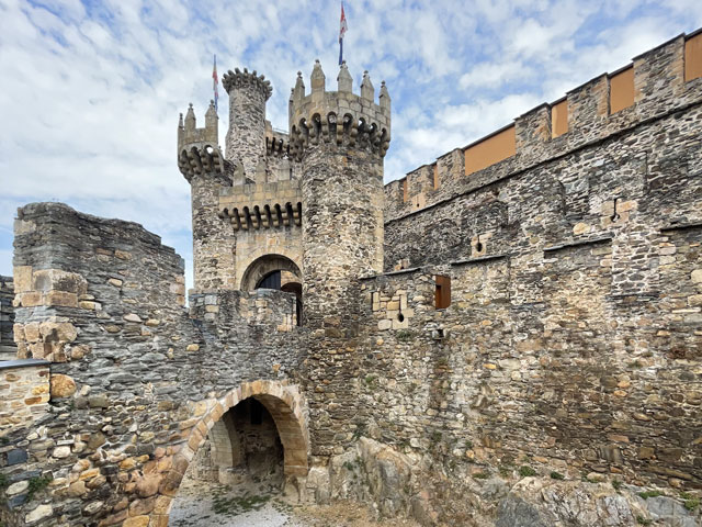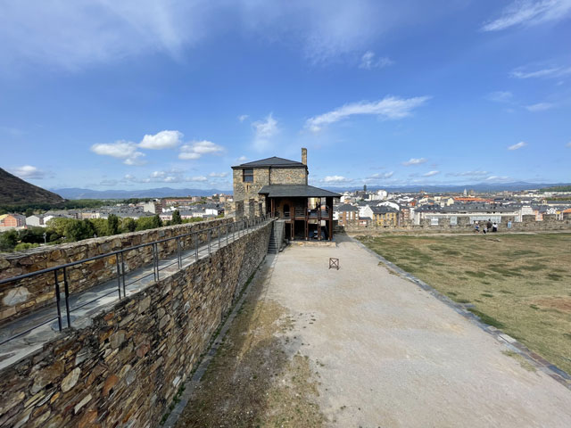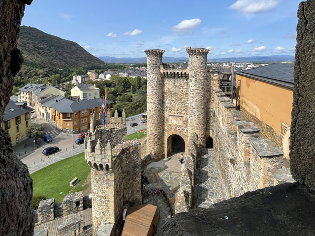 Also bin ich erst mal in das Castillo von Ponferrada, eine alte Templerburg mitten in der Stadt. Die hatte ich beim letzten Mal nur von außen bestaunt. Sie macht einen sehr großen und gut erhaltenen (oder gut restaurierten) Eindruck. Die Bewertungen im Internet gehen weit auseinander und reichen von „langweilig“ bis „höchst interessant“. Einer hat beanstandet, dass man für das Eintrittsgeld (6 € / Rentner+Pilger 4 €) nur die Mauern von innen zu sehen bekommt. Aber das allein wäre den Eintritt wert gewesen, denn da kann man überall auf den Wehrgängen entlanglaufen, die Türme besteigen und diverse ehemalige Wohnräume besichtigen, die prima hergerichtet, aber zugegebenermaßen ohne Inventar sind. In einem Gebäude auf dem Gelände gibt es eine Ausstellung und einen Film zu den Burgen in dieser Gegend und in Vitrinen wird die frühere Bekleidung der verschiedenen Bevölkerungsgruppen gezeigt. In einem anderen Gebäude sind in zwei Sälen wunderbare Bücher ausgestellt, viele aus dem 15./16. Jahrhundert, aber auch einige aus dem 9./10. Jahrhundert. Das sind Schätze, für die man viel mehr Zeit haben müsste. In einem Saal waren es Bibeln, Gesangbücher usw., die ganz hervorragend koloriert und mit ganzseitigen Bildern versehen waren. Im andren Saal waren Atlanten, Pflanzenbücher und ähnliches ausgestellt. Auch ganz toll.