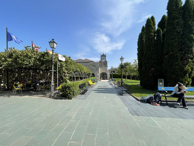 Obwohl es in Ponferrada eine Unmenge an Herbergen gibt, habe ich wieder die „Albergue parroquial San Nicolás de Flüe“ gewählt, die ich gut in Erinnerung hatte. Sie hat 186 Betten, was zunächst erschreckend klingt, aber die sind größtenteils in 4-Bett-Zimmern. Es gibt einen großen Speiseraum mit Kücheneinrichtung und diversen Waschmaschinen. Im überdachten Innenhof des U-förmigen Gebäudes sind weitere Tische und Stühle. Das Schönste ist der mit einer Mauer umgebene Garten, der sowohl Bänke zum Sonnen, als auch schattige Plätze auf einer mit Laub überdachten Terrasse zu bieten hat. Am Ende des Gartens ist eine auch von außerhalb zugängliche, recht große Kapelle. Daneben ist ein Waschhaus mit Toiletten und Duschen für jene, die vor der Öffnung der Herberge mittags um eins oder zwei eintreffen. Da ist auch ein sonniger Wäschetrockenplatz, auf dem das frisch Gewaschene ganz schnell trocken wird.