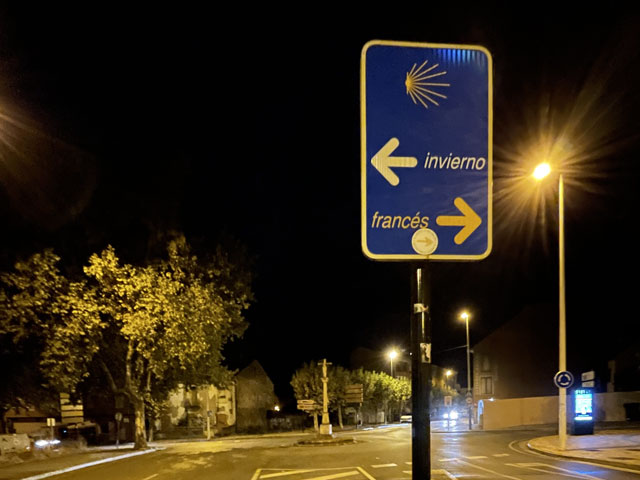 Um sieben war ich in der Spur und bin an der nächsten Kreuzung links abgebogen, während alle anderen geradeaus gelaufen sind. Hier gabelt sich nämlich der Weg. Der Camino de Inverno, auf dem ich nach Santiago laufen will, verläuft ab hier südwestlich, der Camino Francés hingegen nordwestlich. Egal, wohin man will, um den Talkessel rings um Ponferrada zu verlassen, muss man irgendwann mal in und über die Berge. Wer auf dem Camino Francés unterwegs ist, hat noch etwas Galgenfrist. Der kann bis Villafranca del Bierzo noch halbwegs auf gleicher Höhe laufen und muss erst dann hoch auf 1300 Meter, um in O Cebreiro über den Pass zu kommen.