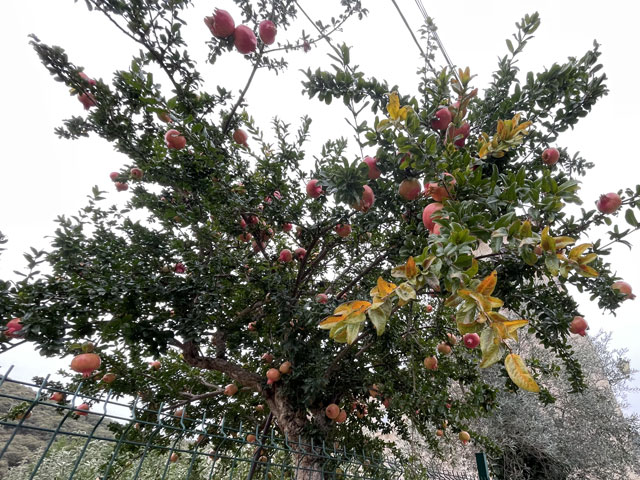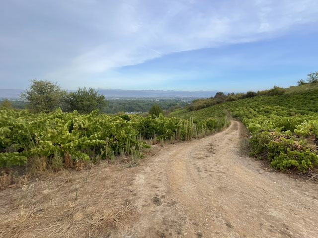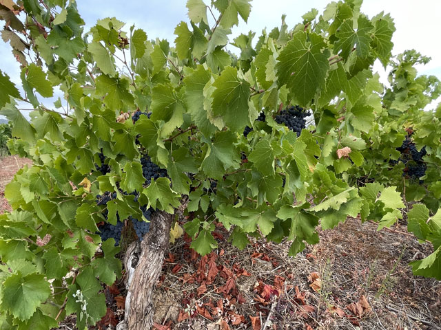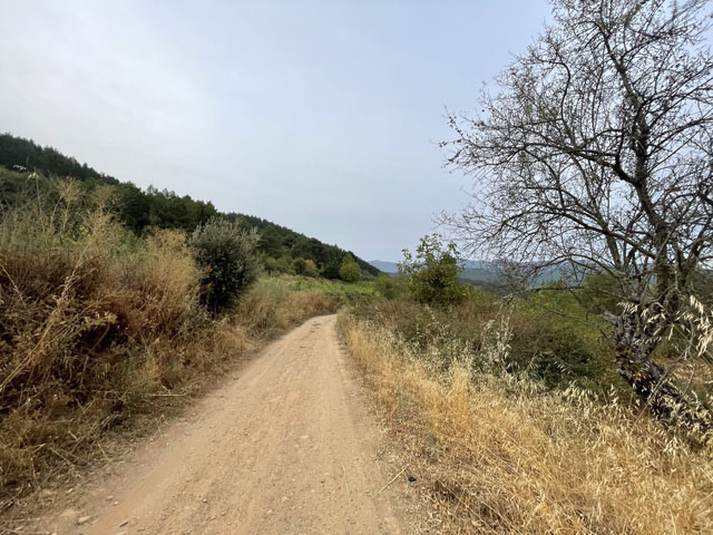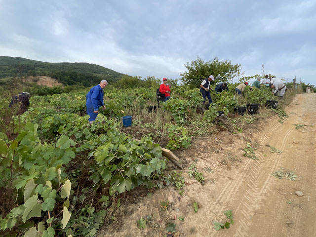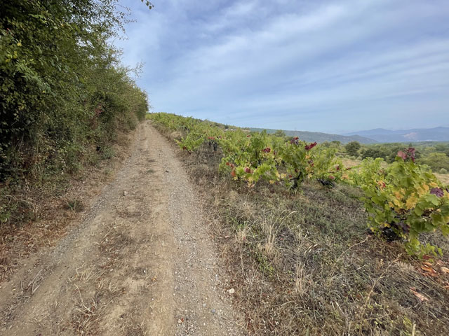 Im weiteren Verlauf geht der Weg immer wieder hoch und runter. Nie richtig extrem, dafür aber permanent. Etwas abweichend von der Karte führt er dann ein ganzes Stück durch und über die Weinberge. Da ist gerade die Weinlese im Gange. Der Laie staunt, wie viel die Leute hier von den so verkrüppelt aussehenden Weinstöcken holen. Hier wachsen auf den Weinbergen dicht nebeneinander weiße und rote Trauben und die kommen auch alle in den gleichen Bottich. Das wird sicher ein Rosé. Ich habe immer mal eine Beere (nicht eine ganze Traube!) gekostet. Sehr aromatisch und auch nicht übermäßig süß. Zusammen mit den Brombeeren, die es natürlich auch hier am Wegesrand gibt, hat das den Zuckerspiegel trotzdem ordentlich angehoben. Wegen Unterzuckerung muss hier keiner draufgehen!