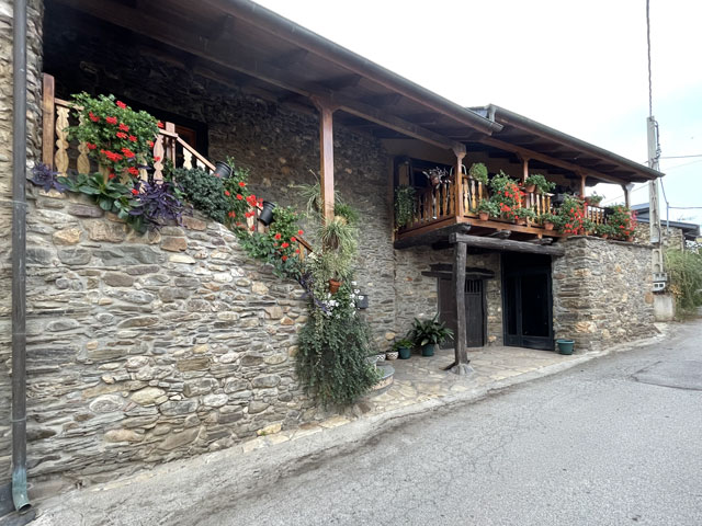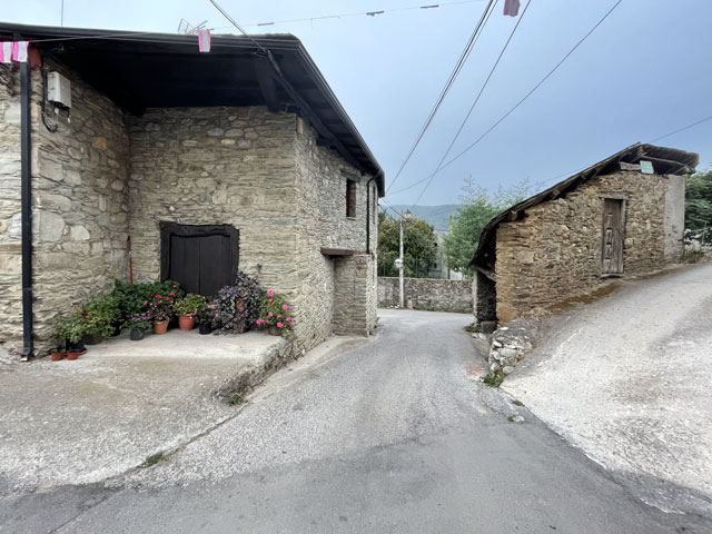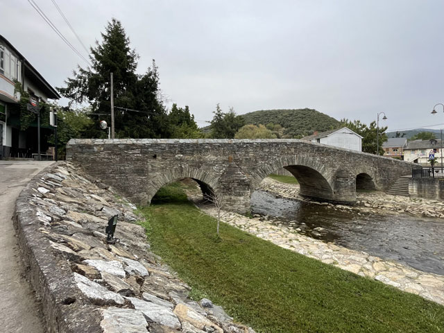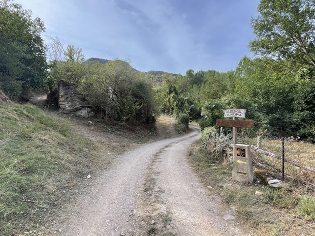 Etwa auf der Hälfte der heutigen Etappe galt es, entweder eine Furt über einen kleinen Gebirgsbach zu benutzen, oder einen Umweg von mehr als sieben Kilometern zu machen. Der offizielle Weg verschwindet kurz vor der Furt in die Berge und wendet hoch oben in Villavijera, wo sich eine kommunale Herberge befindet, wegen der vermutlich der Camino so komisch gelegt wurde. Da ich durch die Antwort auf meine Abfrage wusste, dass die Herberge gerade wegen einer „Pause“ geschlossen hat, konnte ich mir diesen Umweg sparen, Ich habe mich stattdessen darauf vorbereitet, die Schuhe auszuziehen und die Hosen hochzuziehen, um den Fluss zu durchschreiten.