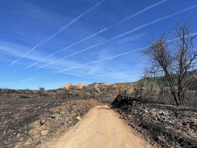 Auf dem Weg haben wir immer mal in der Ferne abgebrannte Berghänge gesehen. Auf den letzten ca. 4 Kilometern waren wir nur von verbrannten Bäumen umgeben. Das sah ziemlich gespenstig aus. Das nur mannshohe Gehölz ist einfach verkohlt und wird sich wohl nicht wieder erholen. Aber nach nur drei Wochen kamen vielfach schon wieder neue, inzwischen 10…20 cm hohe Sprosse aus den Wurzeln. Spätestens im nächsten Jahr wird es hier schon wieder reichlich Grünzeug geben. Schlimmer sieht es mit den dicken, alten Bäumen aus. Die sind alle innen völlig ausgebrannt und es stehen nur noch Reste der Rinde in der Landschaft. Das ist wirklich arg, aber vermutlich kein wirtschaftlicher Schaden, weil das hier eine Art Reservat und keine landwirtschaftliche Nutzfläche ist.