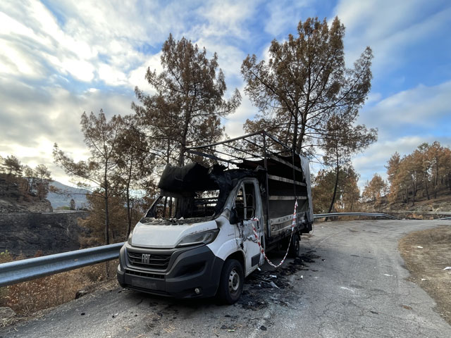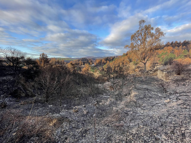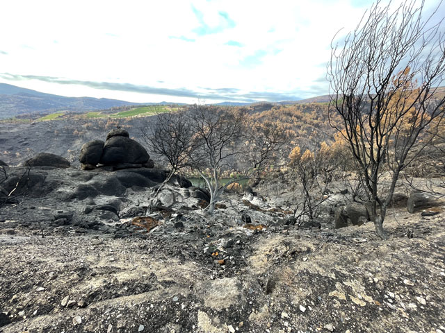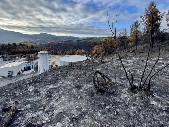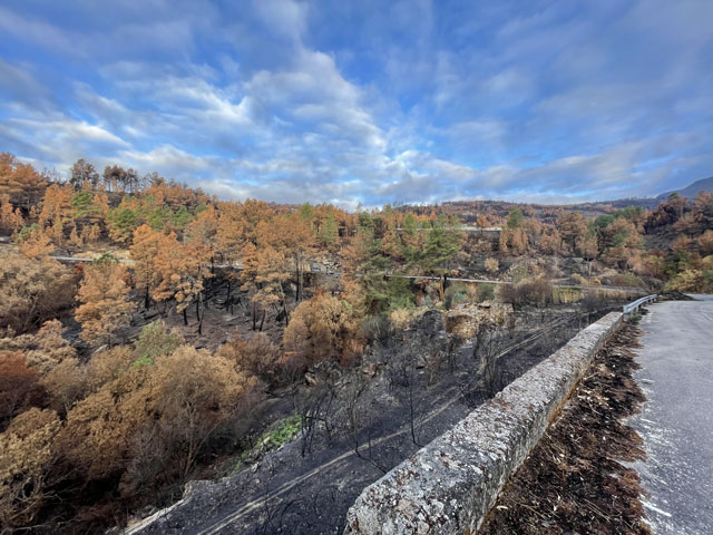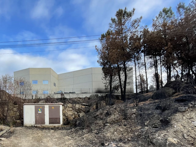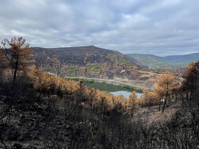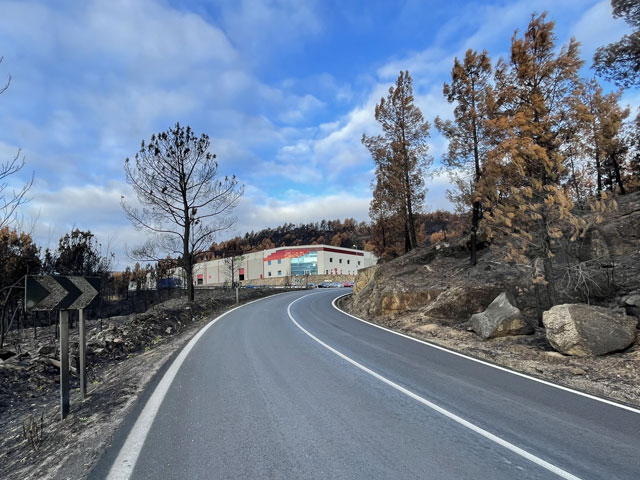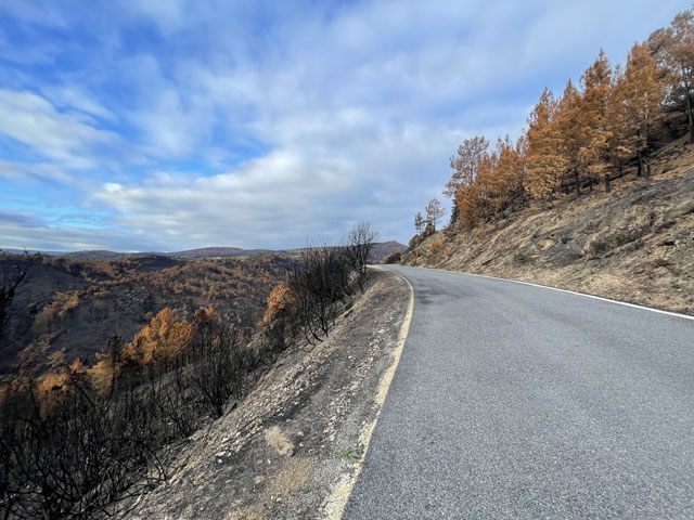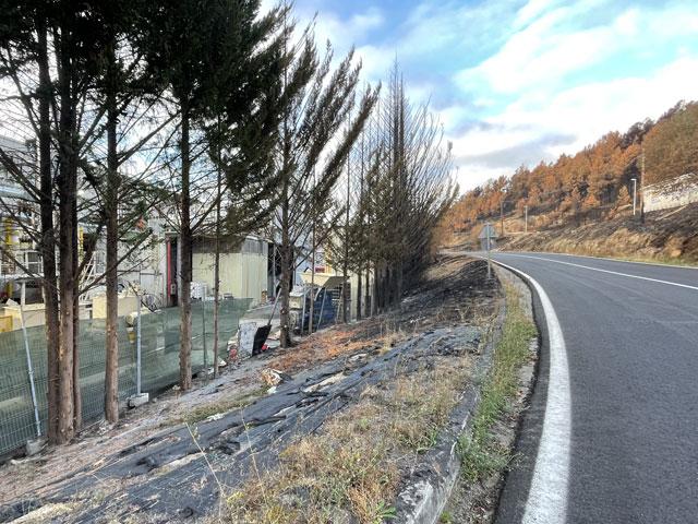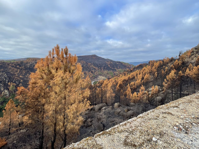 Auf meiner Seite habe ich gleich hinter A Rúa ein paar Fabriken gesehen, die an der Straße im Wald errichtet wurden und überall reichten die verbrannten Flächen bis an die Grundstücke heran. Bei einem Werk mit einer sehr großen Halle war sogar die Hecke entlang des Zauns dicht hinter der Halle abgebrannt. Wie man es geschafft hat, die Flammen im letzten Moment zu stoppen, ist mir schleierhaft. Ein Transporter hat es offenbar nicht mehr geschafft, der stand ausgebrannt in einer Parkbucht an der Straße. Traurig ist auch, dass man jetzt im ausgebrannten Wald den ganzen Müll zu sehen bekommt, der über die Jahre von der Straße den Hang runtergekippt wurde.