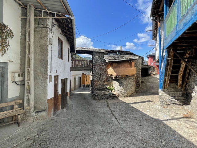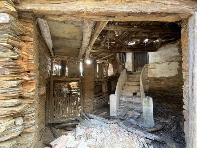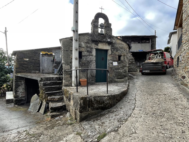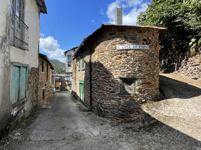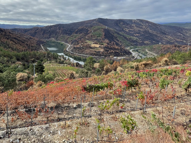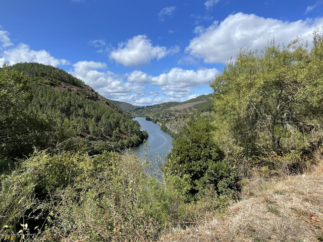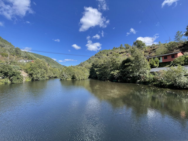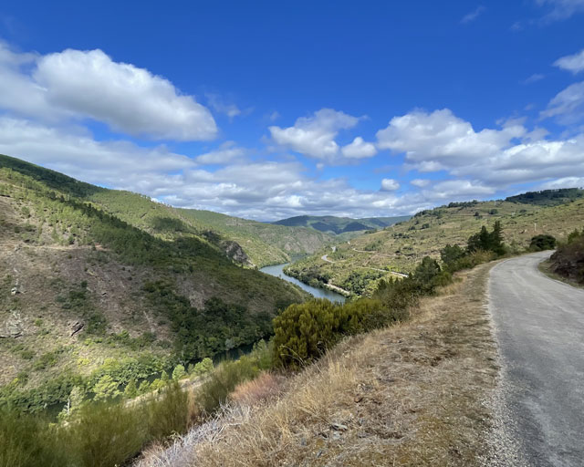 Die 26,5-km-Etappe von A Rúa nach Quiroga hat mehrere Besonderheiten zu bieten: Abgesehen von den letzten ca. 5 km schlängelt sich der Camino mit dem Río Sil durch ein enges Tal, überwiegend auf einer kaum befahrenen, aber hervorragend asphaltierten Straße, die auf 400…450 Metern Höhe in den Berghang geschnitten ist. Der Río Sil fließt etwa auf 250 Metern Höhe. Man ist also ein ganzes Stück über dem Wasser und hat hervorragenden Blick in das mitunter recht enge Tal mit steilen, felsigen Hängen auf beiden Seiten. Eine sehr traurige Besonderheit sind die aktuellen Brandschäden, denn auf einigen Kilometern sind hinter A Rúa die Berghänge auf beiden Seiten fast vollständig abgebrannt. Auf den gegenüber liegenden Hängen sind einige Dörfer zu sehen, um die herum es völlig schwarz ist. Das heißt, die Dörfer waren von Flammen eingeschlossen, konnten aber irgendwie gerettet werden.