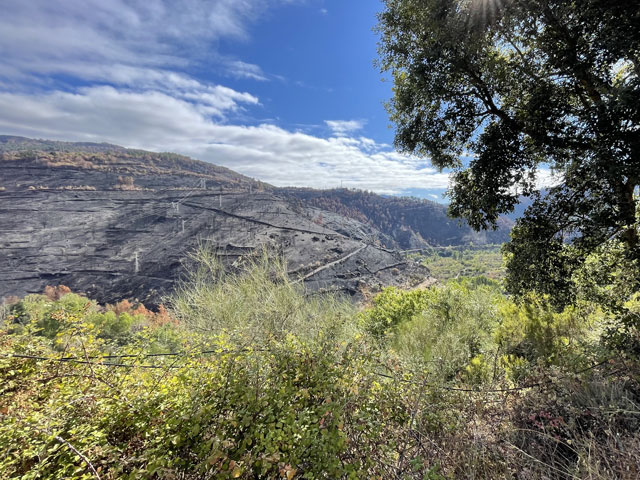 Nach dem total verbrannten Wald, der überwiegend aus mannshohen Sträuchern bestand, kam ein Abschnitt, der wie ein herbstlicher Wald aussah, alle Baumkronen in verschiedenen Brauntönen. Doch das waren keine Laubbäume, sondern Kiefern, die dem „O Tannenbaum“ zufolge das ganze Jahr über grüne „Blätter“ tragen. Zum Glück war es auch damit irgendwann vorbei und auf beiden Seiten des Tals zeigte sich die ursprünglich Vegetation in satten Grüntönen. Das war für die Augen eine wirkliche Wohltat.