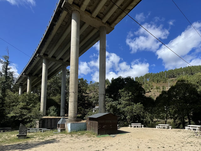Da, wo die wenig befahrene Landstraße auf die N-120 trifft, führt der Camino eigentlich rechts ab in die Berge, um dem Dorf Bendilló einen Besuch abzustatten. Das habe ich mir verkniffen und bin auf dem Seitenstreifen der N-120 gelaufen, bis der Camino aus den Bergen zurückkam. Nach einem kurzen obligatorischen Stück entlang der Nationalstraße ging es seitlich ab nach O Soldón, wo es der Karte zufolge doch eine Bar geben soll. Und zwar unter der Brücke, auf der die N-120 einen Seitenarm des Río Sil überquert. Ich habe sie auch gefunden: ein verrammelter Kiosk in der Mitte eines ganz netten Rastplatzes mit Bootsanlegestelle.
