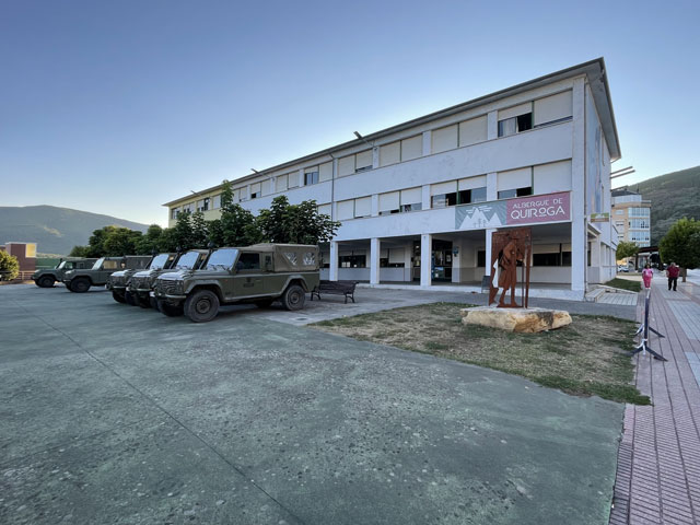 Marco, der mir weit voraus war, aber mit dem ich immer mal Standorte und Nachrichten ausgetauscht habe, hatte mich eine Weile zuvor mit der Nachricht überrascht, dass er in Quiroga nicht in der Herberge abgestiegen ist, sondern in einem Hostel. Die Herberge hat ihm nicht zugesagt, weil da lauter Arbeiter und Soldaten sind. Ja, mit Pilgern werden die das 95-Betten-Haus nicht voll kriegen. Ich habe kurz vor der Stadt noch zwei spanische Pilgerinnen getroffen, sonst niemand. Im Pilgerführer steht, dass sich in der Herberge gern Schulklassen einquartieren. Das hätte ich viel schlimmer gefunden, als Arbeiter und Soldaten. Die Arbeiter, die hier ihre eigene Küche und einen Speisesaal haben, waren zugegebenermaßen beim Abendbrot etwas laut, aber nach einer halben Stunde war das vorbei. Die Soldaten, die warum auch immer hier einquartiert sind und deren Jeeps vor der Herberge parken, haben sich in einem anderen Speisesaal ihr Hauptquartier eingerichtet, wo sie auch essen und sich aufhalten. Von denen bekommt man sonst gar nichts mit.
